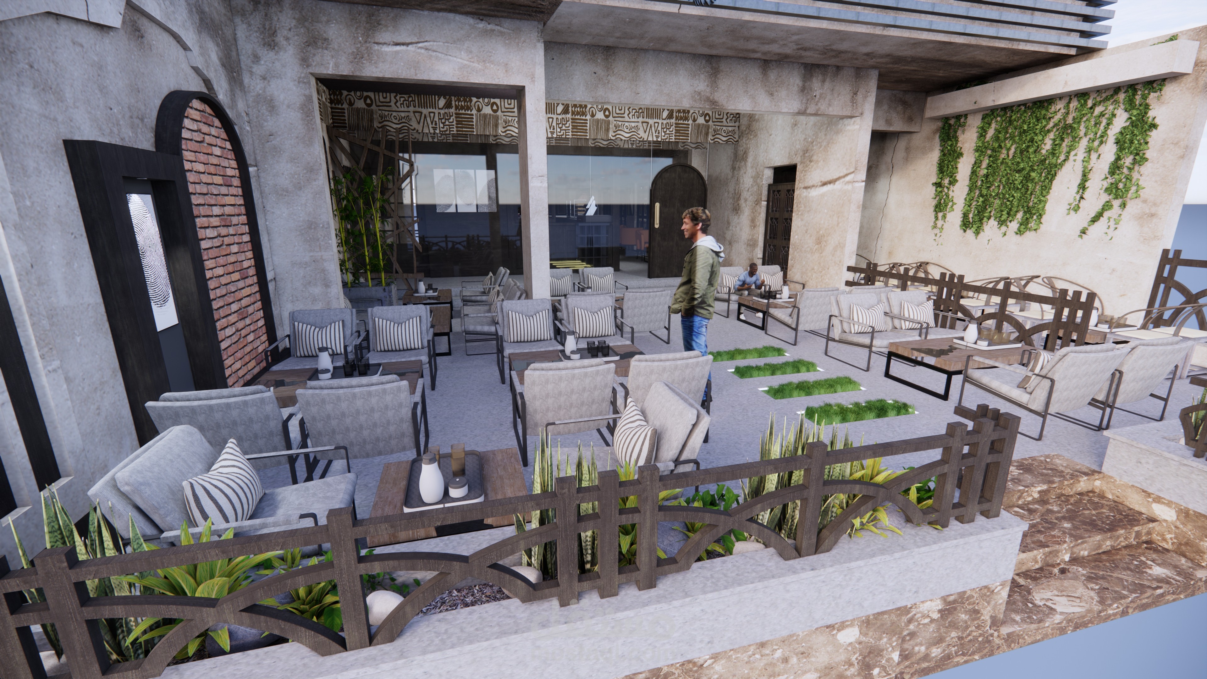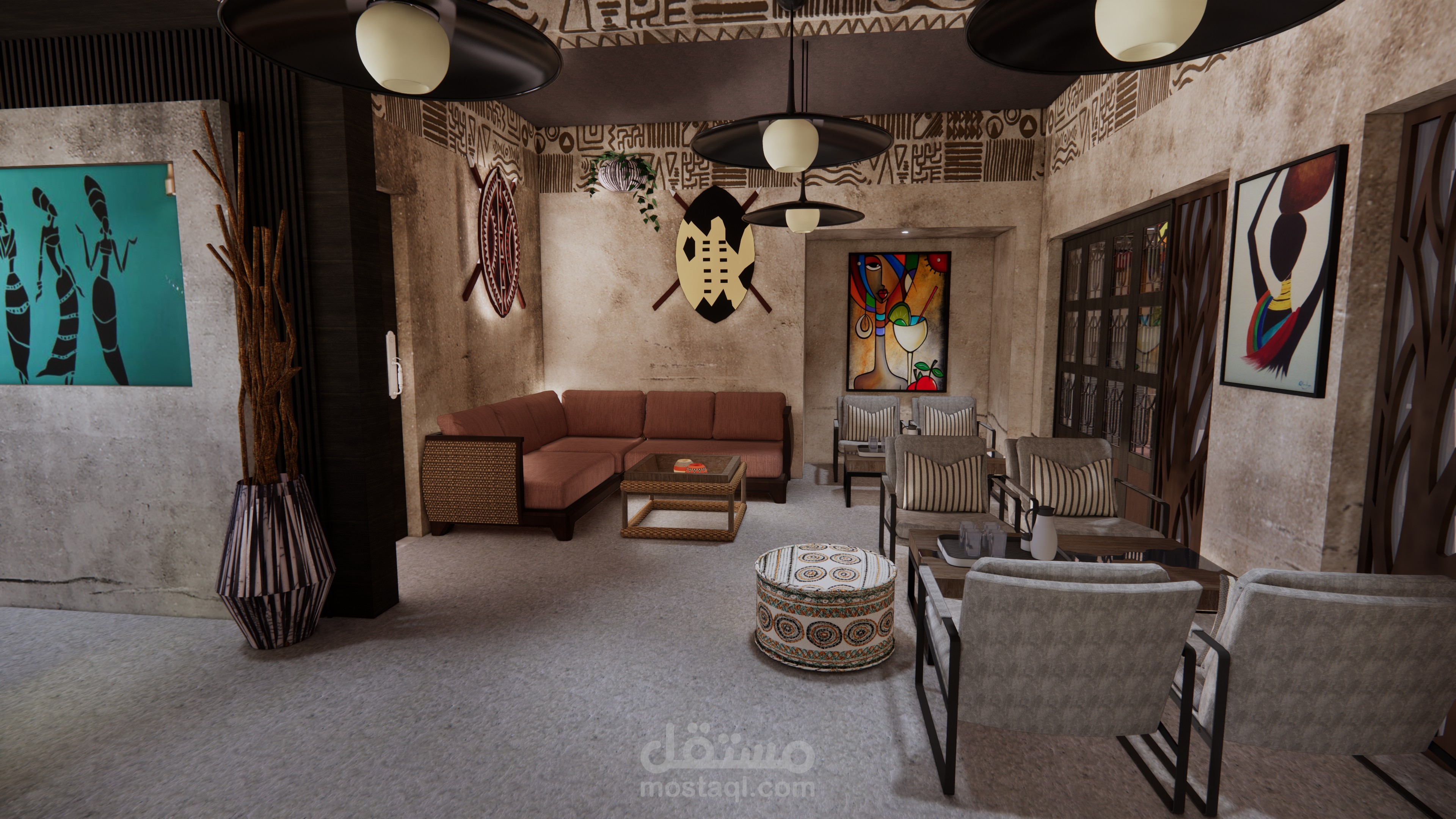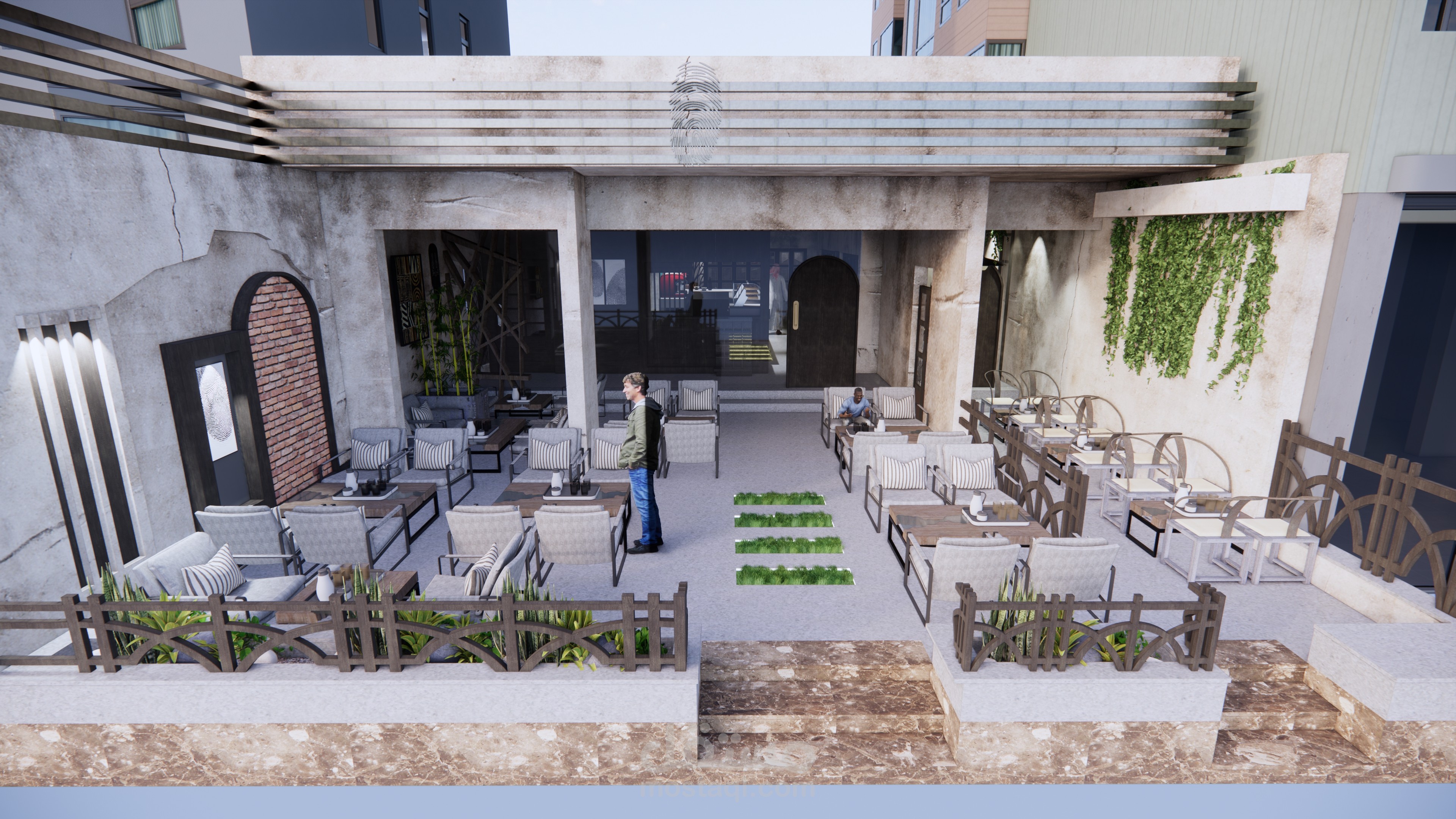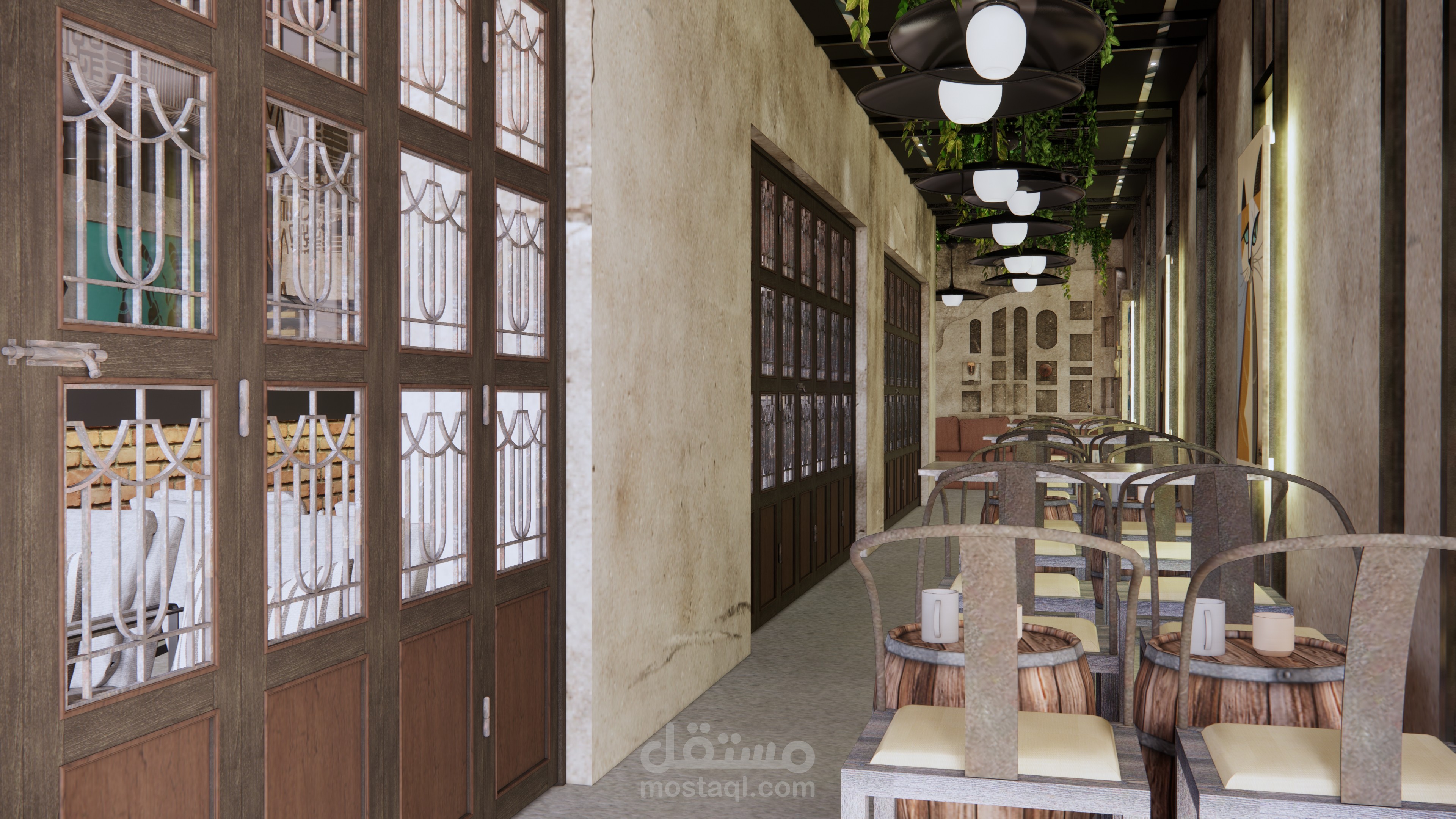 تصميم داخلي كوفي شوب - ينقسم الى جلسات داخلية وجلسات مفتوحة خارجية