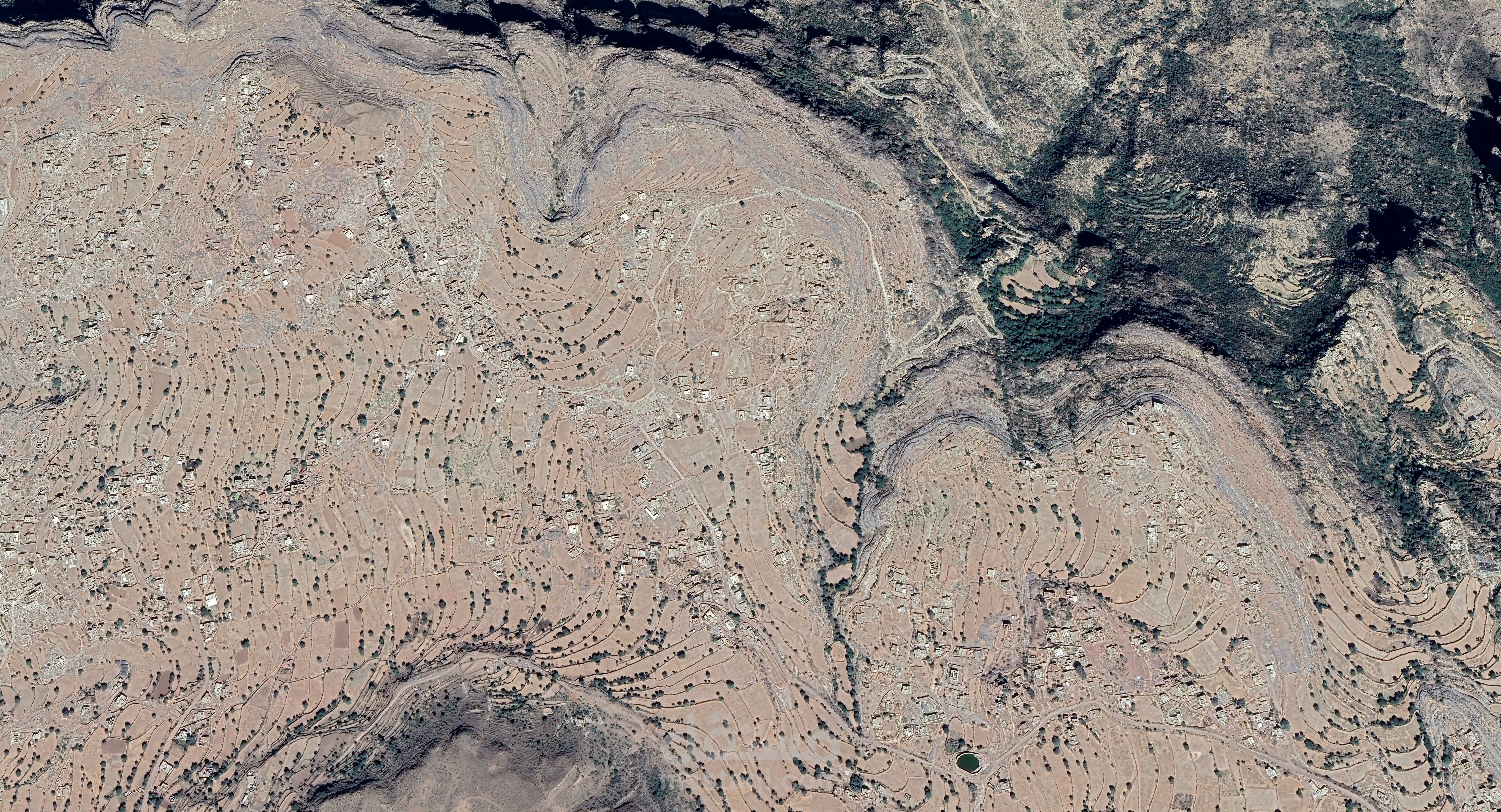توفير صور جوية عالية الدقة تميز فيها حدود المنازل والشوارع لمنطقة بجوار مدينة تعز في دولة اليمن في عام 2017