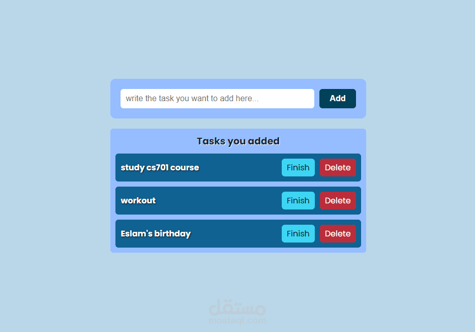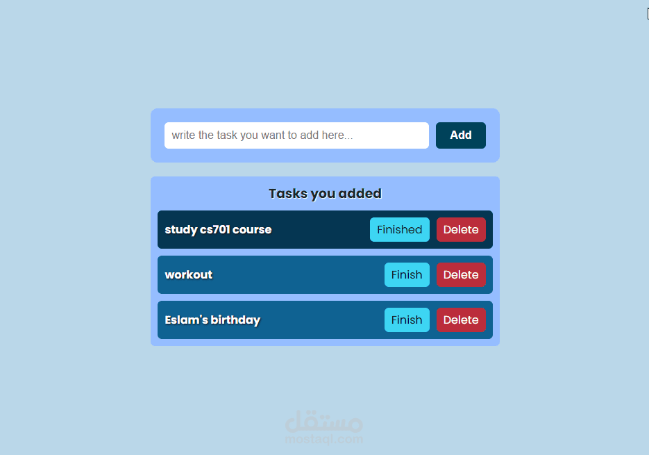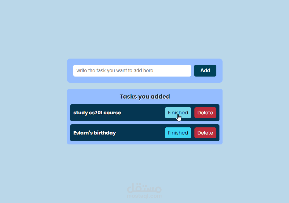 تطبيق بسيط يمكنك من خلاله إضافة مهمة تريد أن تنجزها فيما بعد وحين تقوم بذلك يمكنك إنهاء المهمة ومن ثم حذفها.