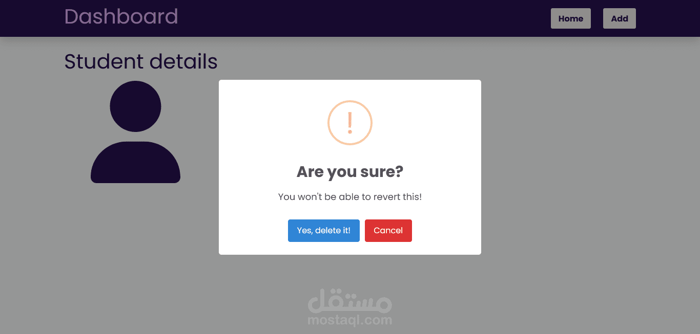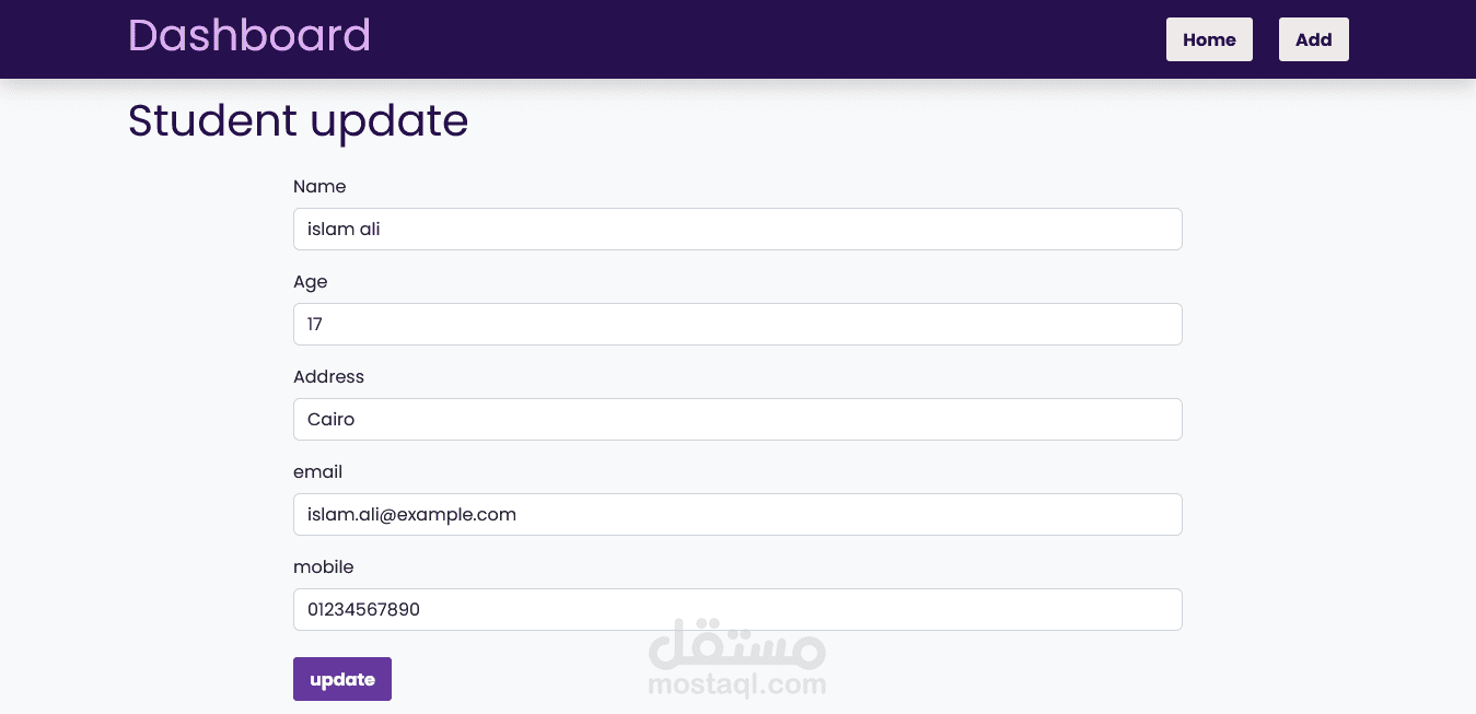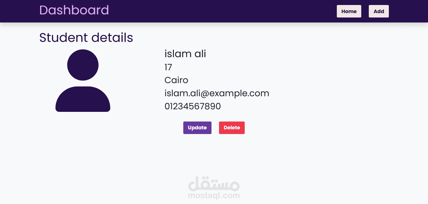 تصميم داش بورد للطلاب تعرض البيانات الخاصه بالطلاب ويمكنك عمل أي عمليه على كل طالب من (عرض أو تعديل أو حذف) ويمكنك أيضا إضافة طالب جديد.