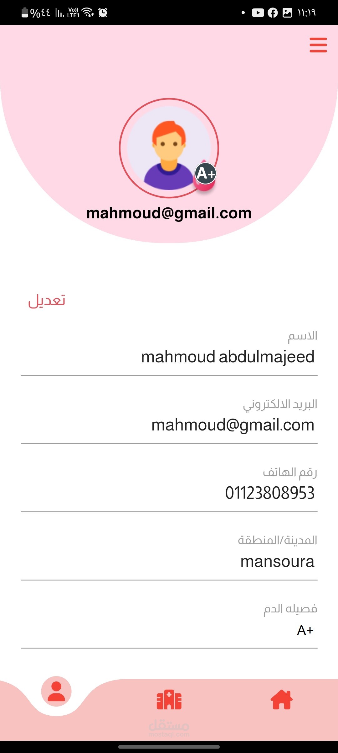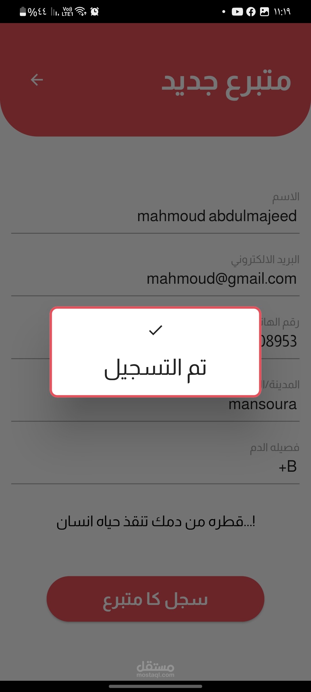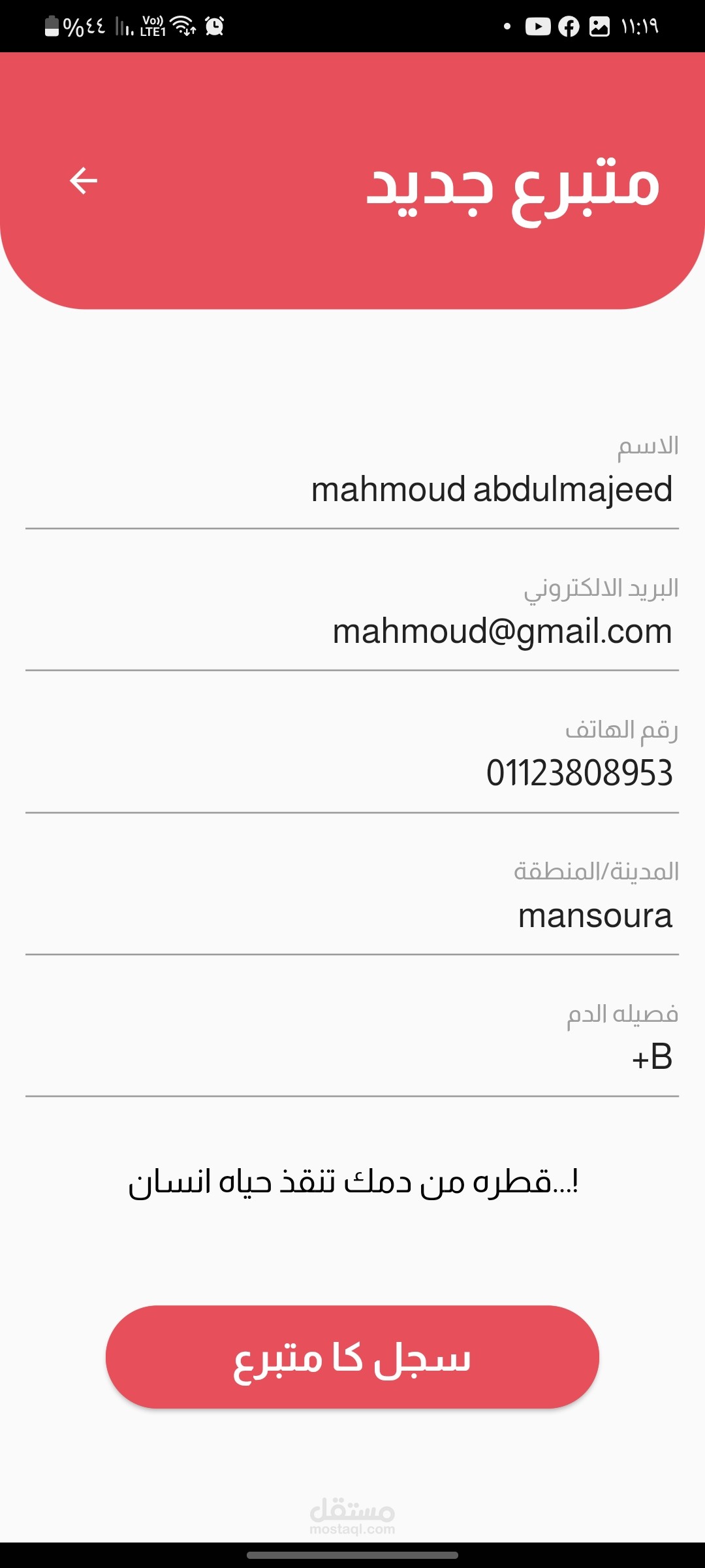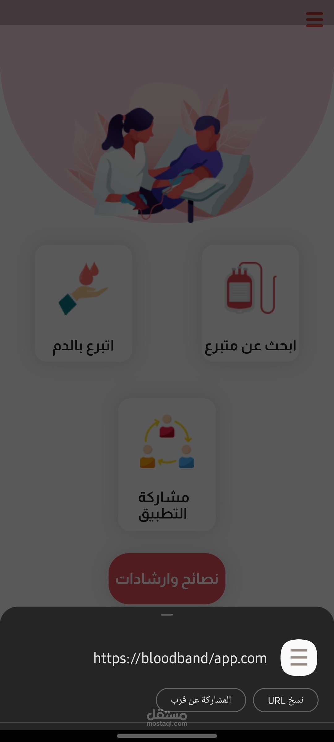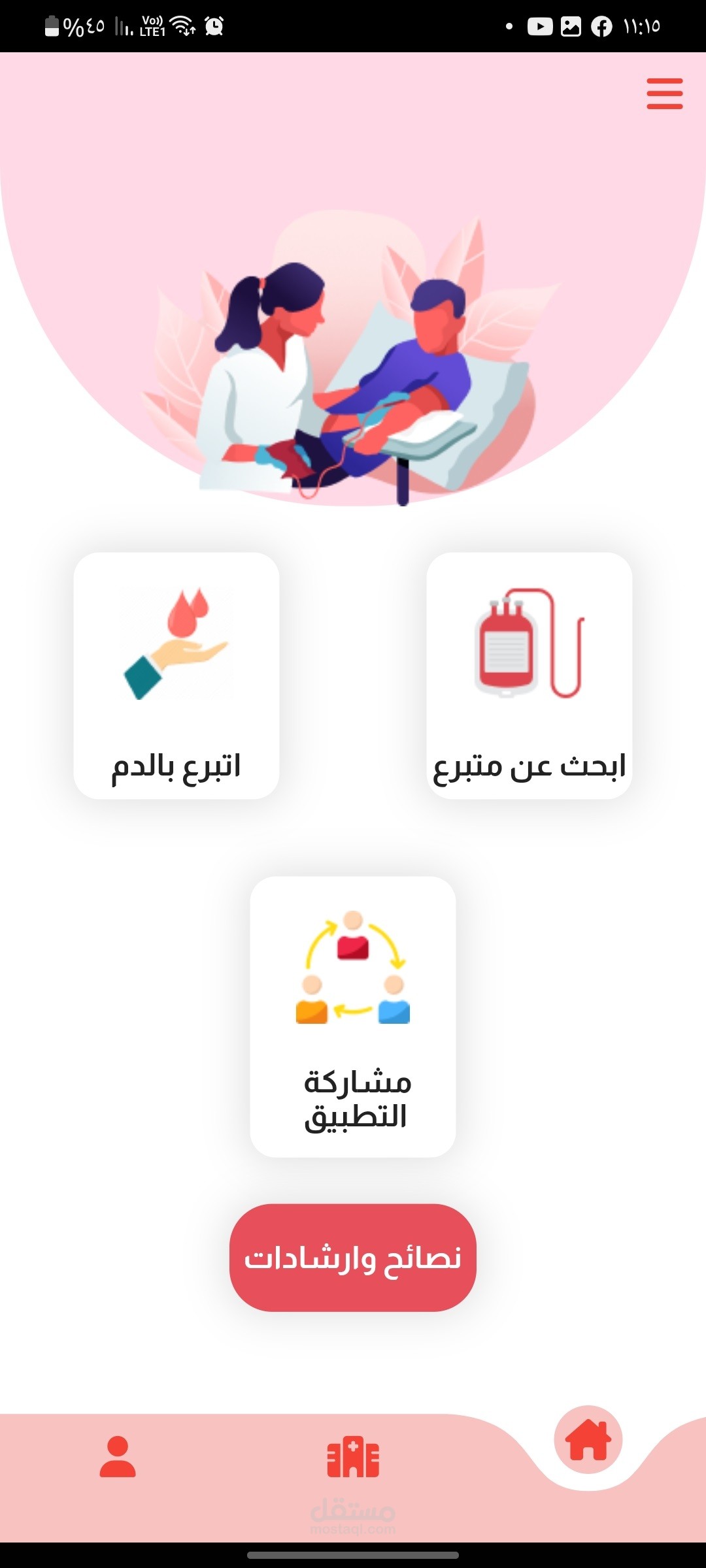 تطبيق flutter من خلاله تقدر تسجل كا سخص قادر علي التربع بالدم عند الحاجه. و لو انت محتاج دم تقدر تدخل وتبحث عن الاشخاص اللي من فصلتك وتقدر تتواصل معاه عن طريق مكالمه تلفونيه عن طريق الرقم او عن طريق الواتس او عن طريق الشات الخاص بالابرنامج وتقدر من خلال البرنامج توصل للمستشفيات القريبه منك