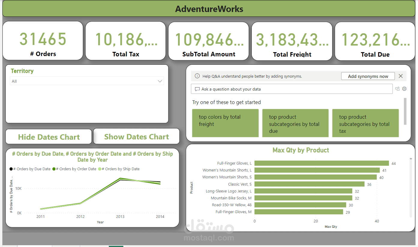 باستخدام قاعدة بيانات Adventure Works، توفر هذه لوحة التحكم رؤى وتصور تفاعلي وقياسات حول المبيعات مثل: