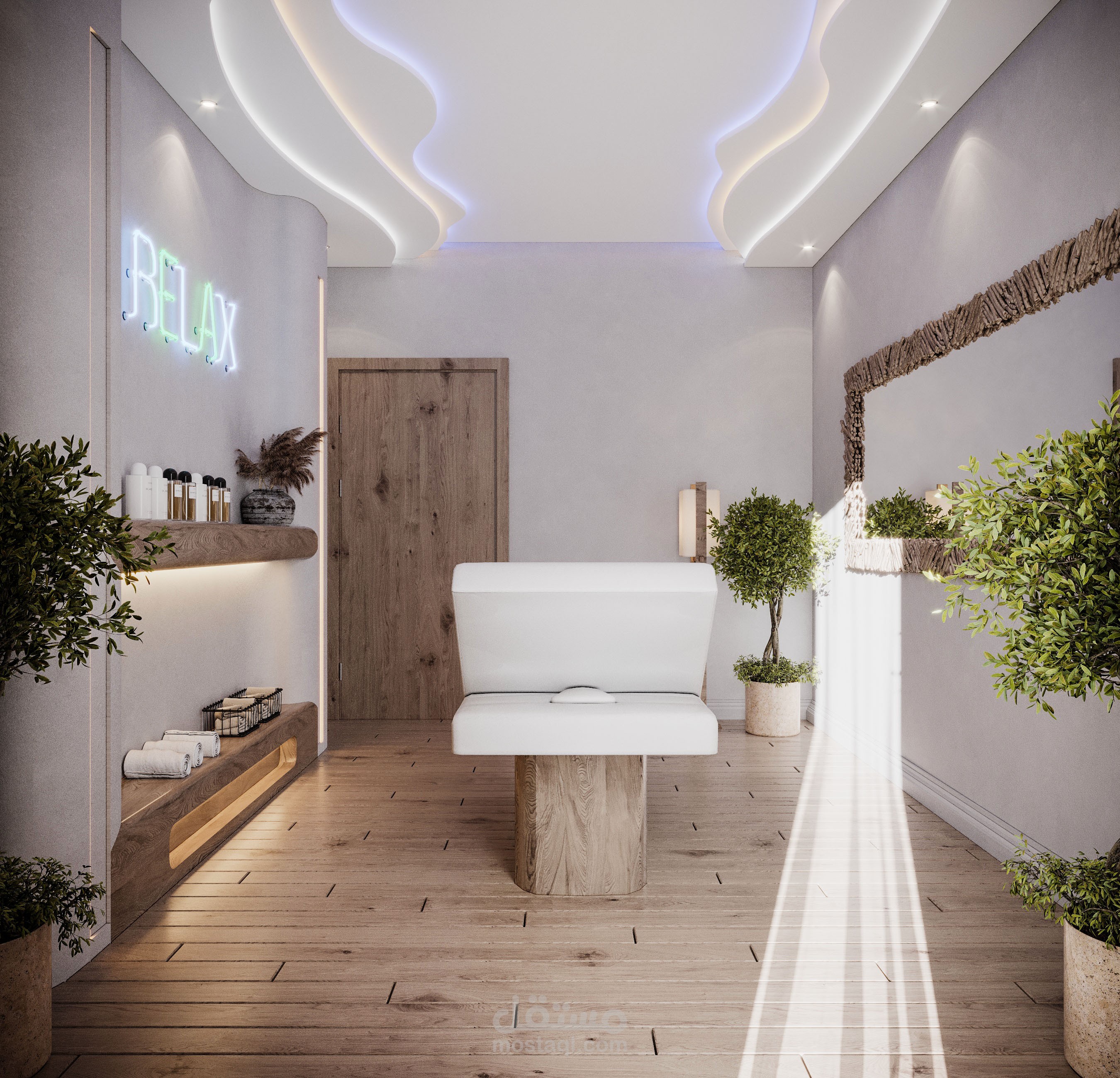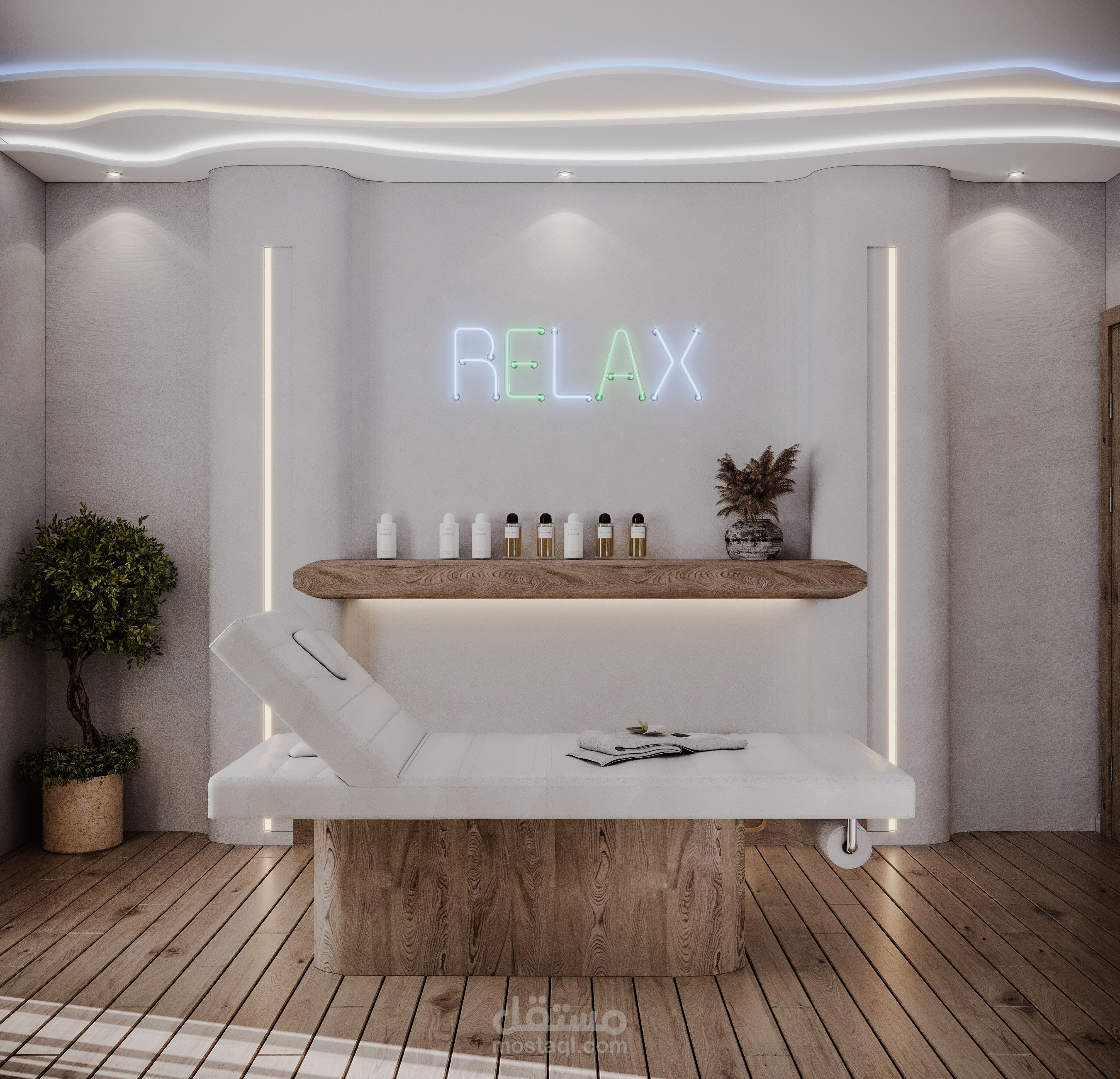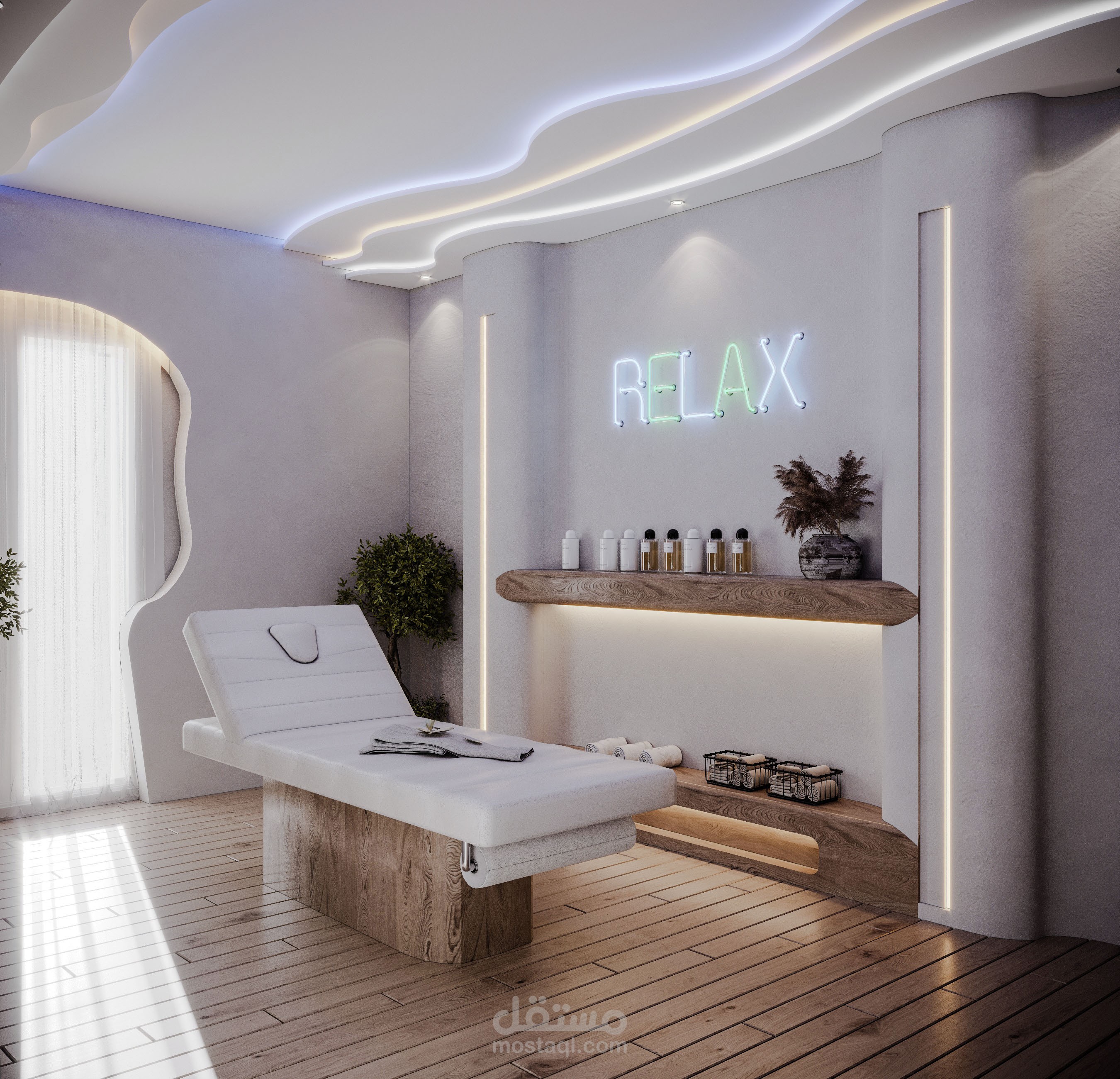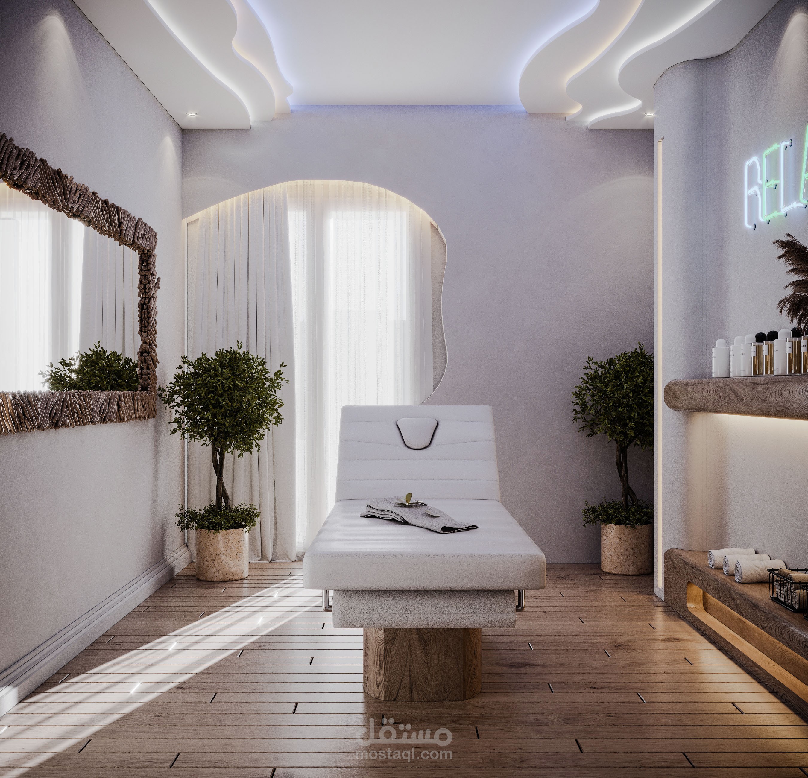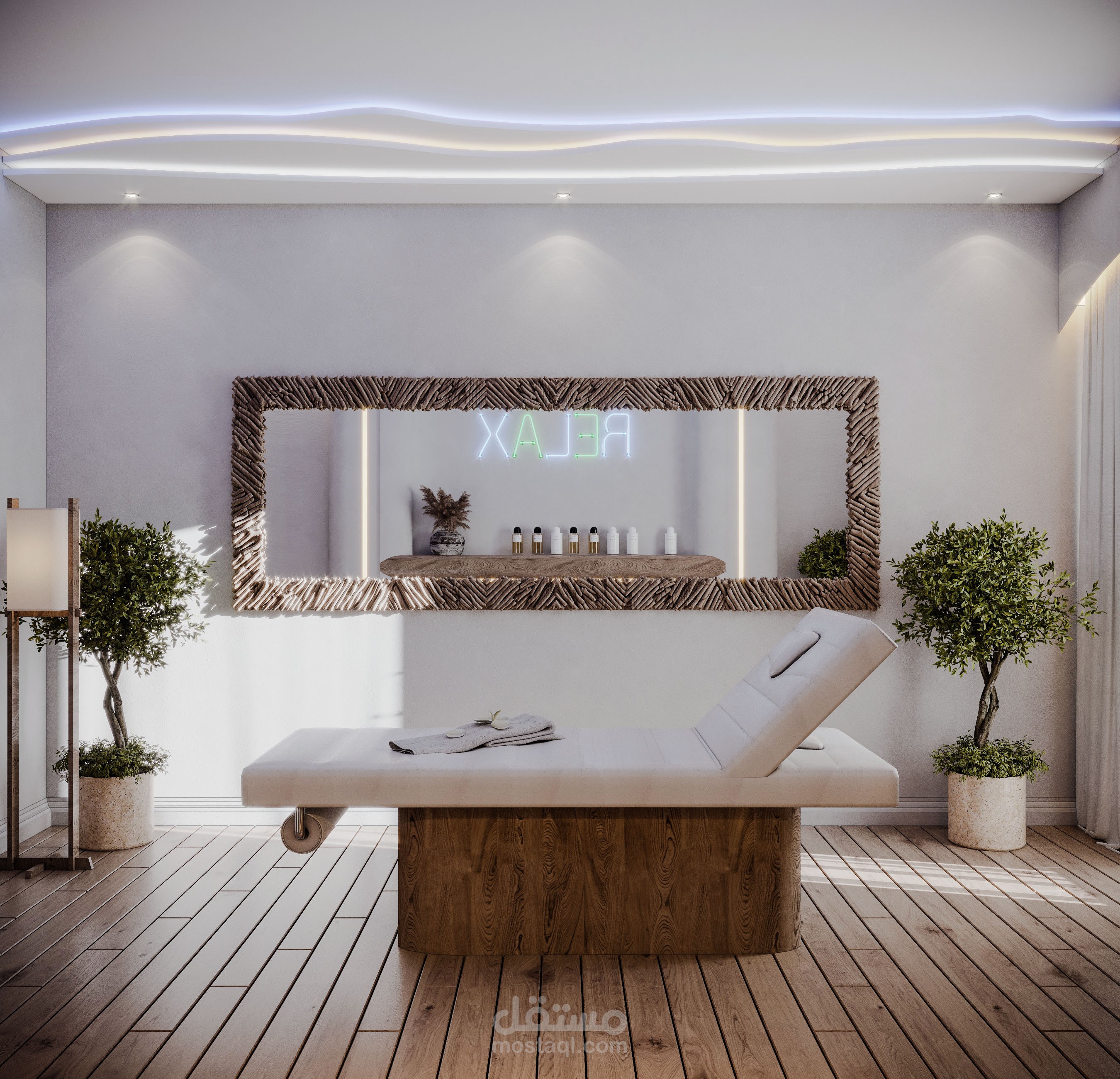 تصميم مميز لغرفة مساج باستخدام الوان السماء والمواد الطبيعية والاضاءات المتباينة لاظهار التصميم وتعزيز الاحساس بالهدوء والراحة في المكان.