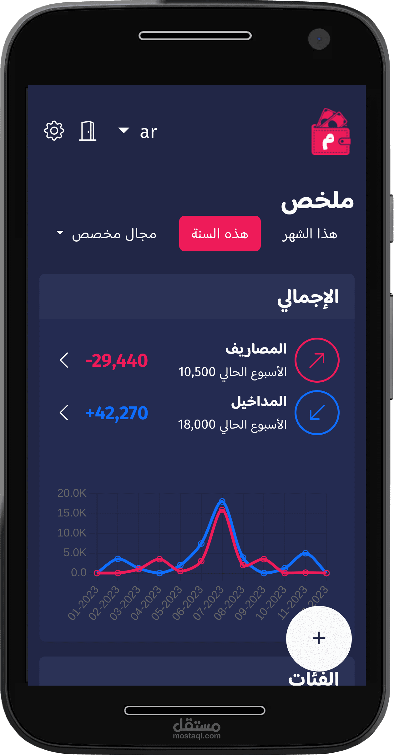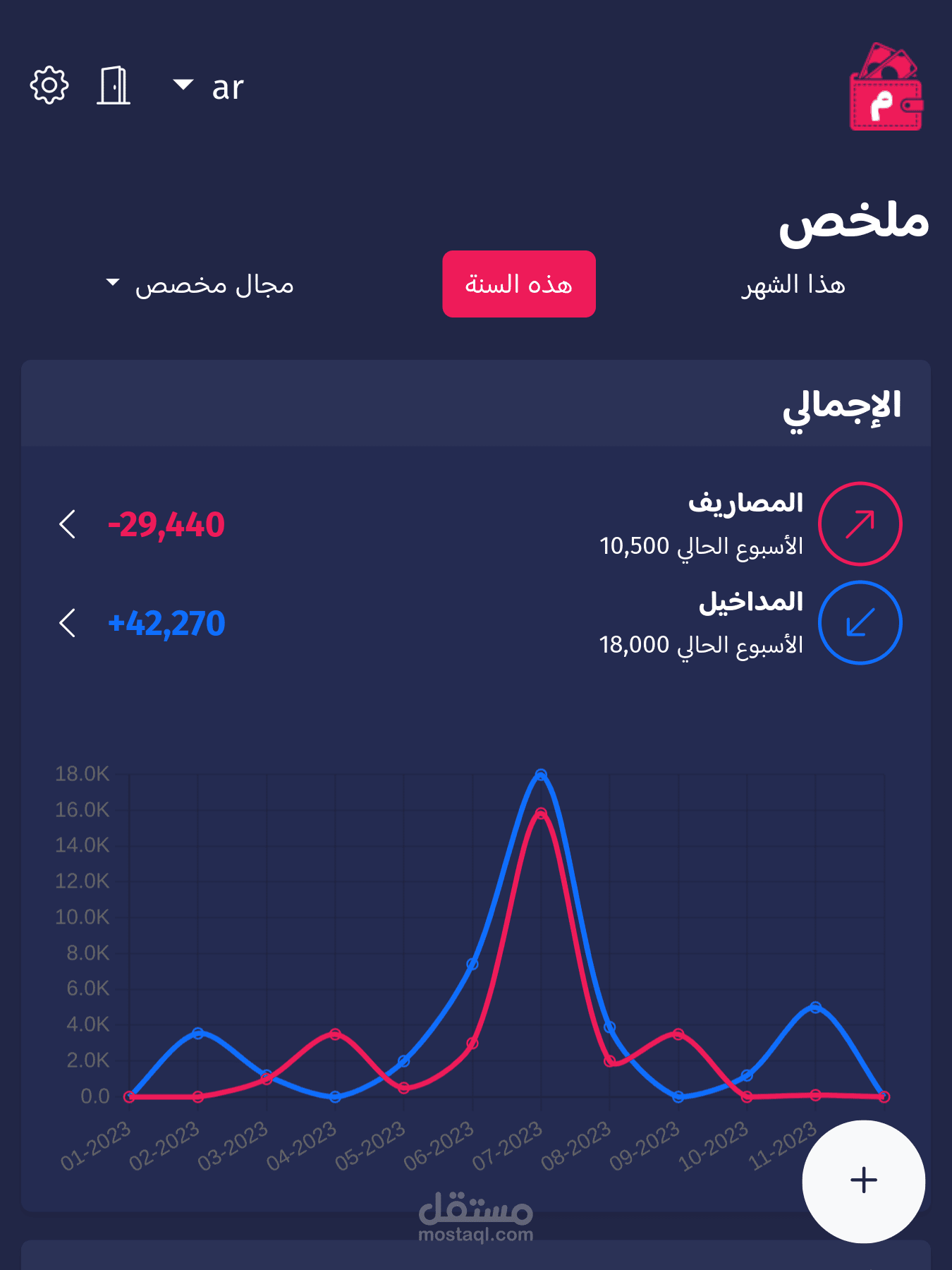 يمكنك بسهول الحصول على ملخص لإجمالي المداخيل و المصاريف و أيضا إجمالي كل قسم على حدة، كما يمكنك تخصيص المجال الزمني بالشهر الحالي، السنة الحالية، منذ بداية الإدخال أو عن طريق اختيار التاريخ.