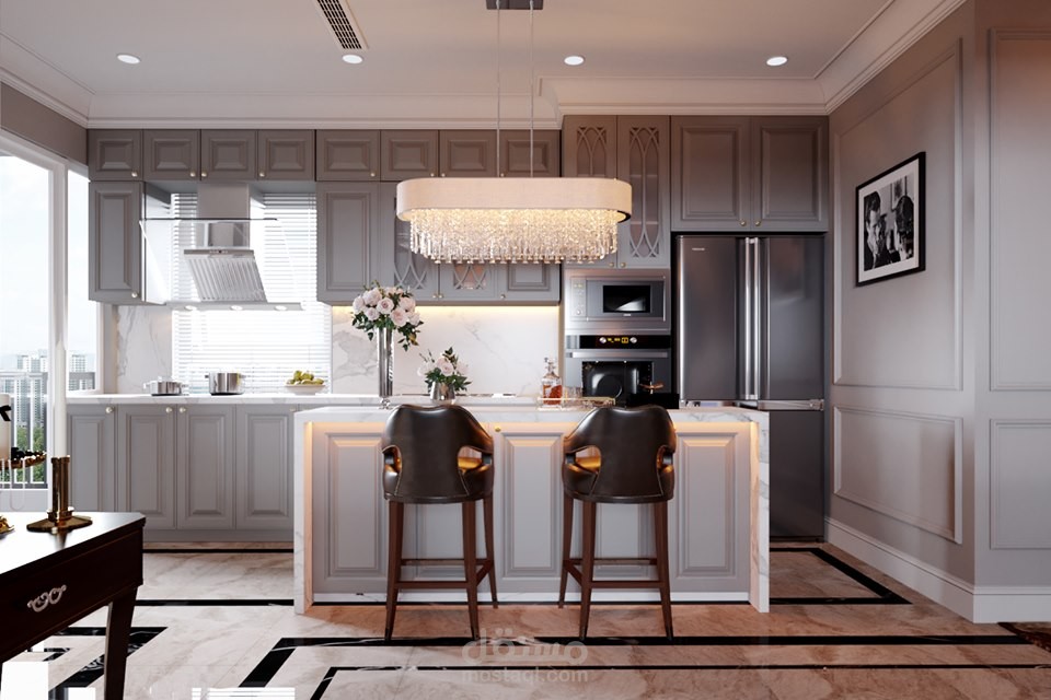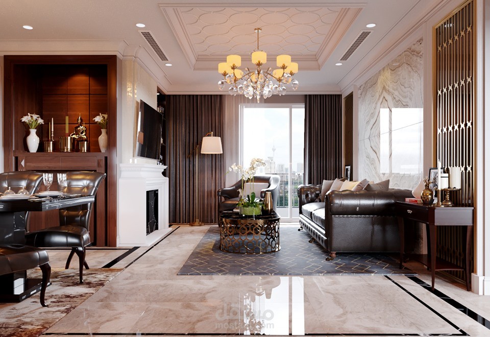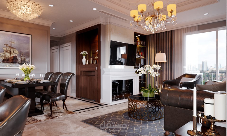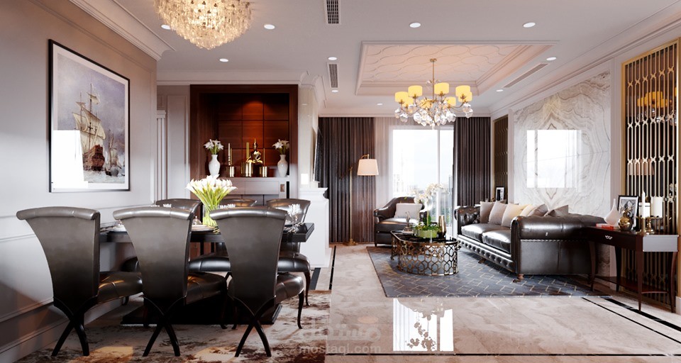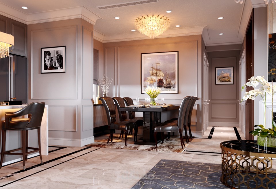 تصميم دينينج روم كامل مع ليفنج روم مع استخدام الطراز نيو كلاسيك حسب طلب العميل للظهور بارقى صوره من التصميم