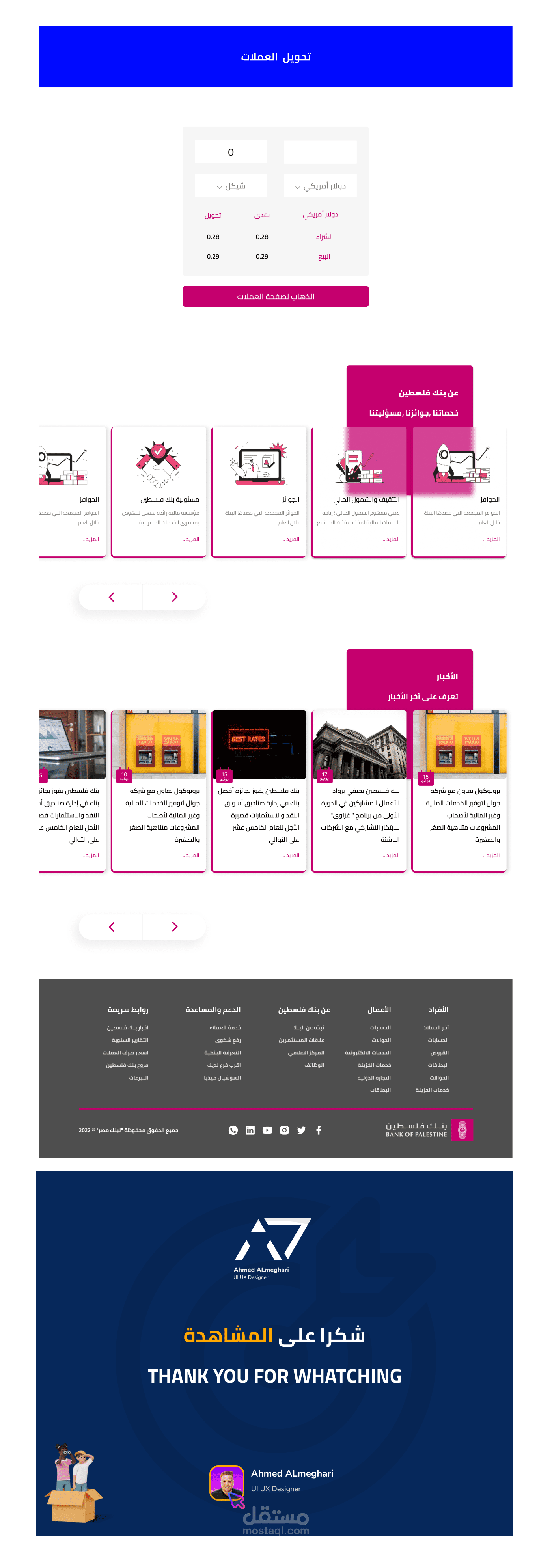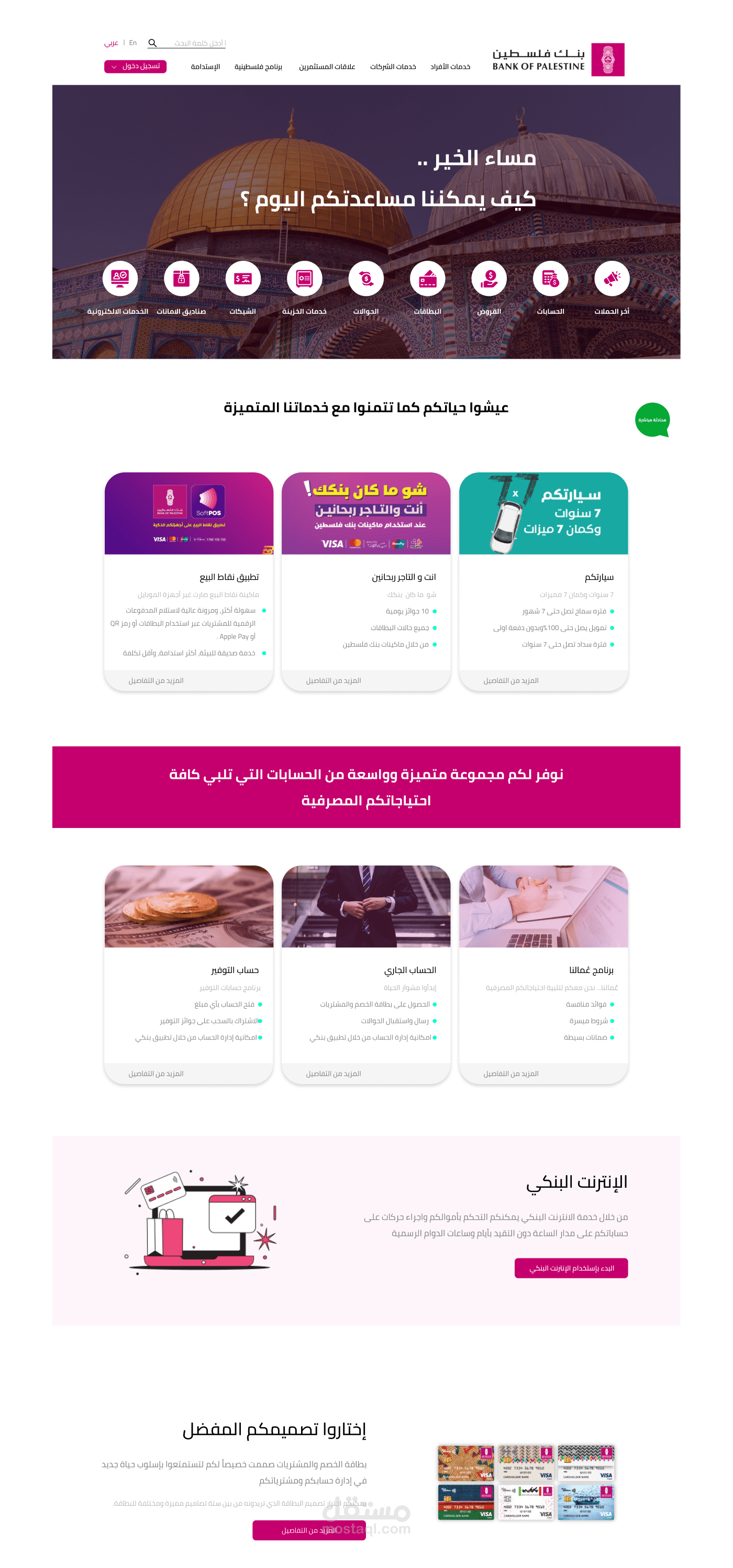 لقد قمت بتحسين تصميم الواجهة المرئية لموقع بنك فلسطين لجعلها أكثر جاذبية وتوافقًا مع الهوية المرئية للبنك. تم استخدام مبادئ التصميم الحديثة مثل التناغم في الألوان والأشكال واختيار الخطوط المناسبة لتحسين التجربة البصرية للمستخدم وجعلها أكثر احترافية.