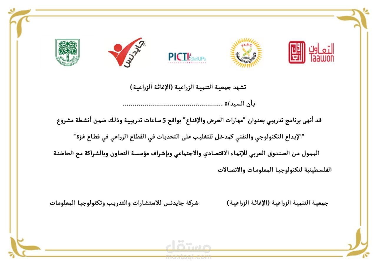 شهادة برنامج تدريبي من معتمدة من أكثر من شركة و مؤسسة فلسطينية و من الإغاثة الزراعية