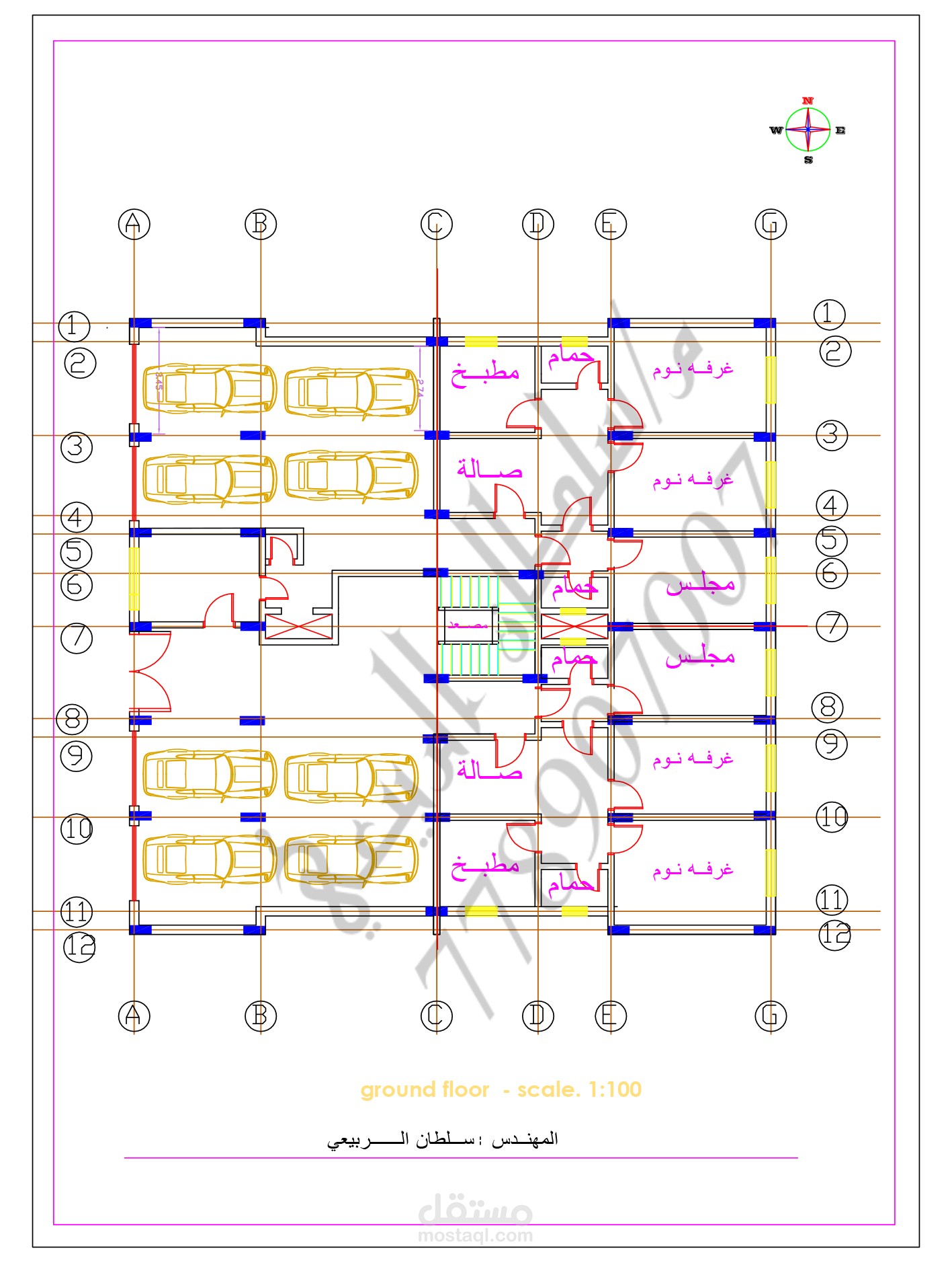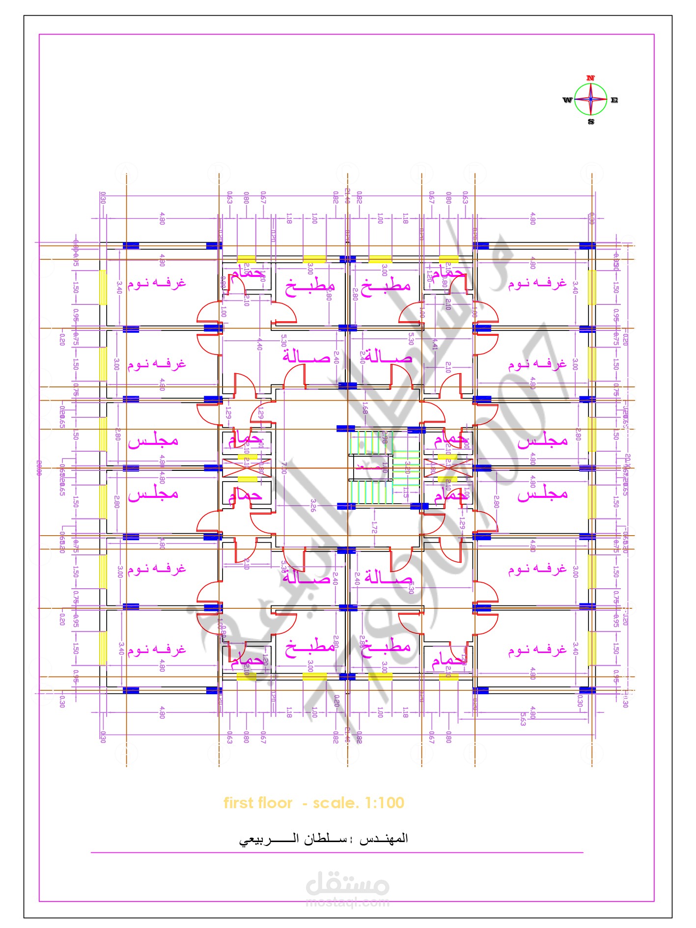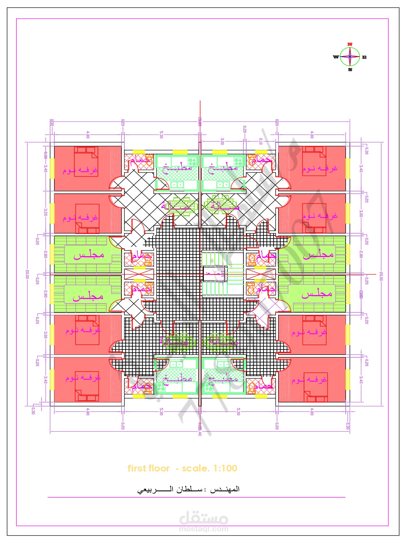 مخطط معماري لمبنى سكني تجاري مكون من اربع شقق في كل طابق حيث ان مساحة كل شقة من ١٠٠_١١٠ م