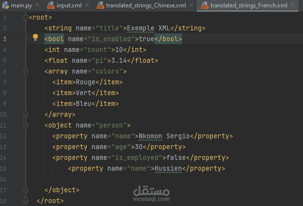هذا المشروع هو برمجة بلغة بايثون(API) لترجمة ملف XML إلى عدة لغات. لاستخدامه، قم بوضع الملف الذي ترغب في ترجمته في نفس المجلد مع ملف البايثون وسمِّه 'input.xml'. ثم قم بتشغيل البرنامج، وسيتم تلقائياً ترجمة الملف إلى عدة لغات.