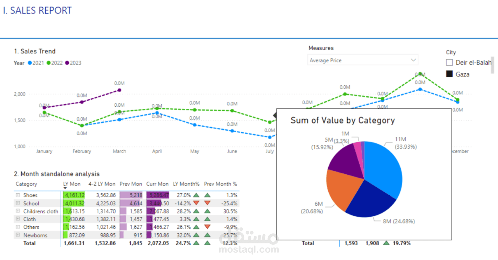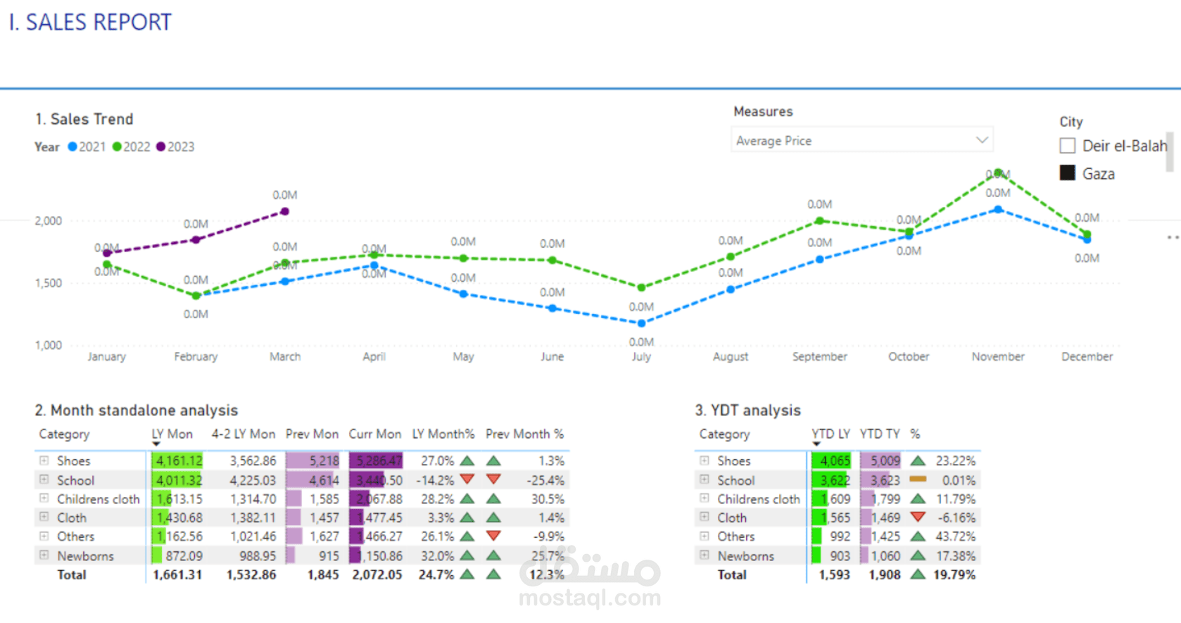 Dashboard خاصة بملف اكسل يتضمن المبيعات في مدينتين.