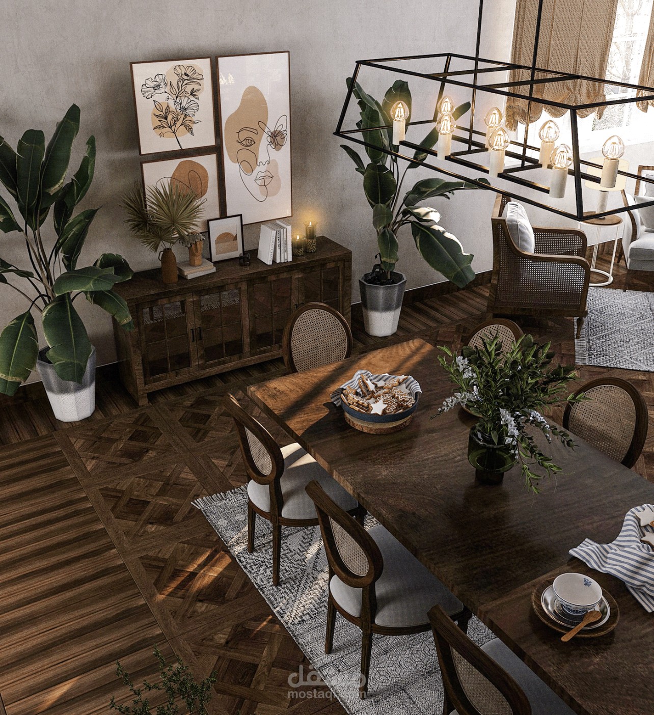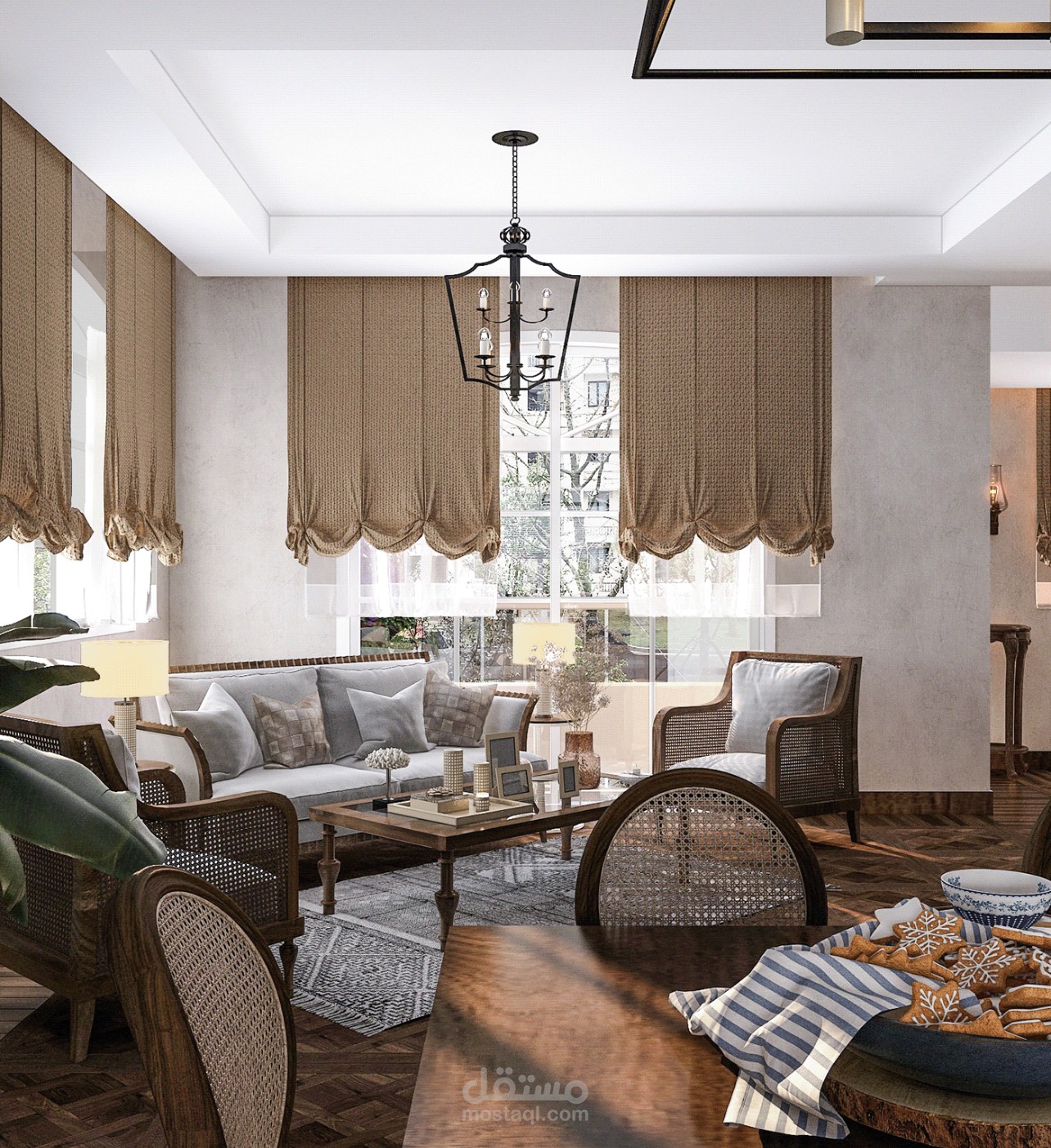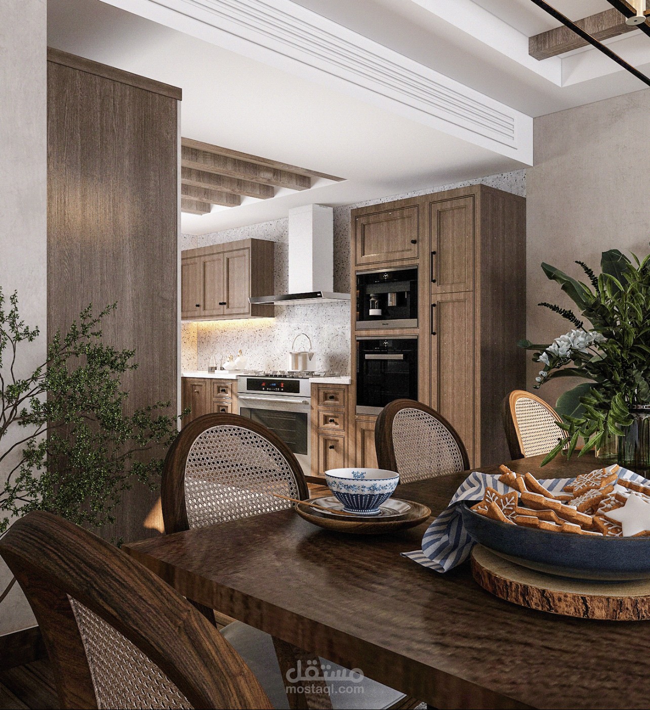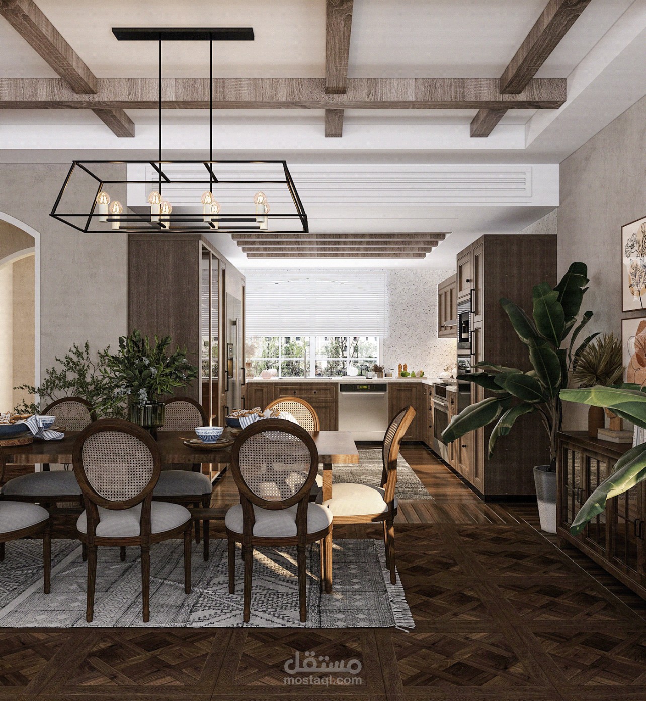 تصميم هادئ لصالة معيشة متصل بها مطبخ وصالة طعام.