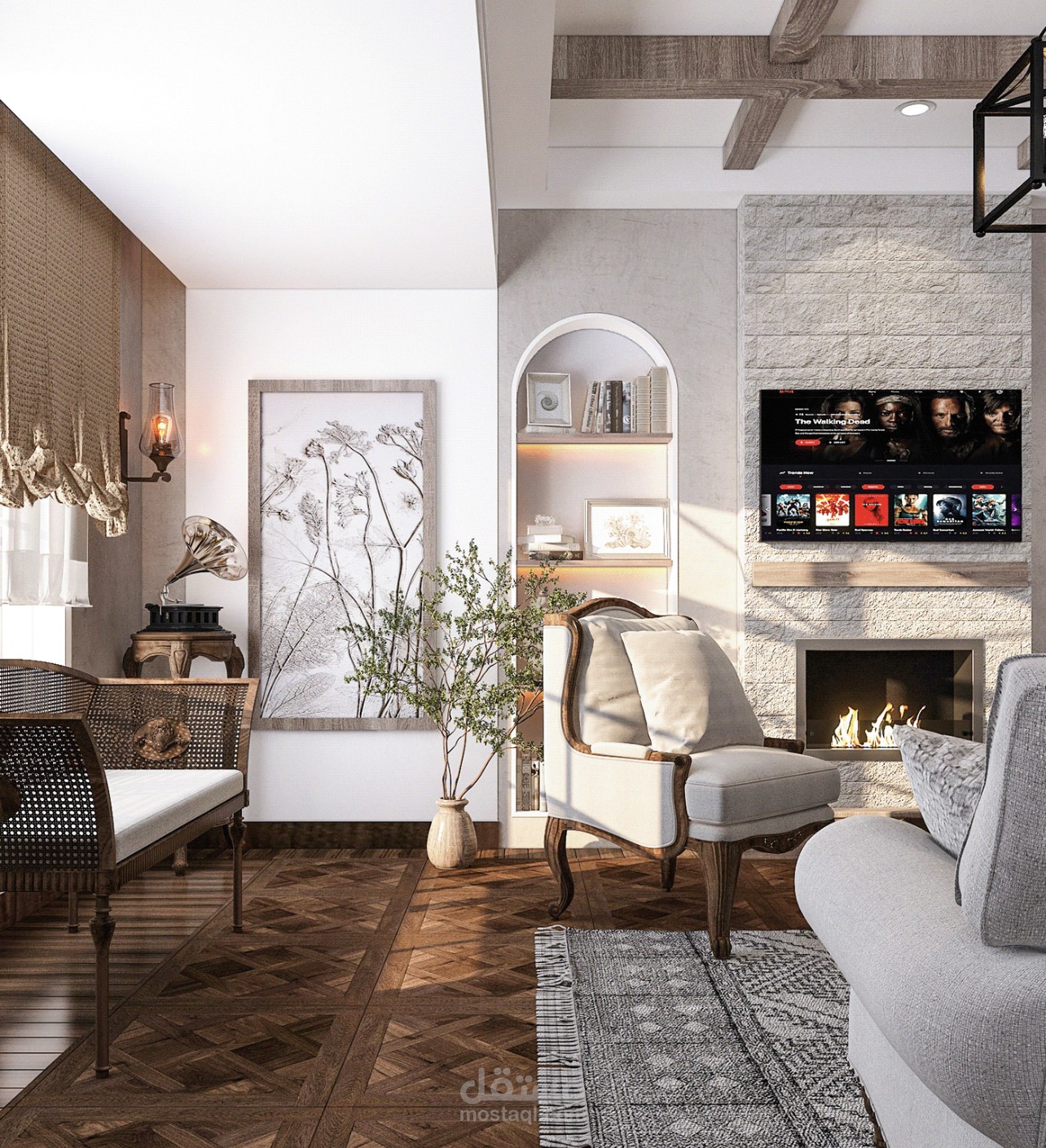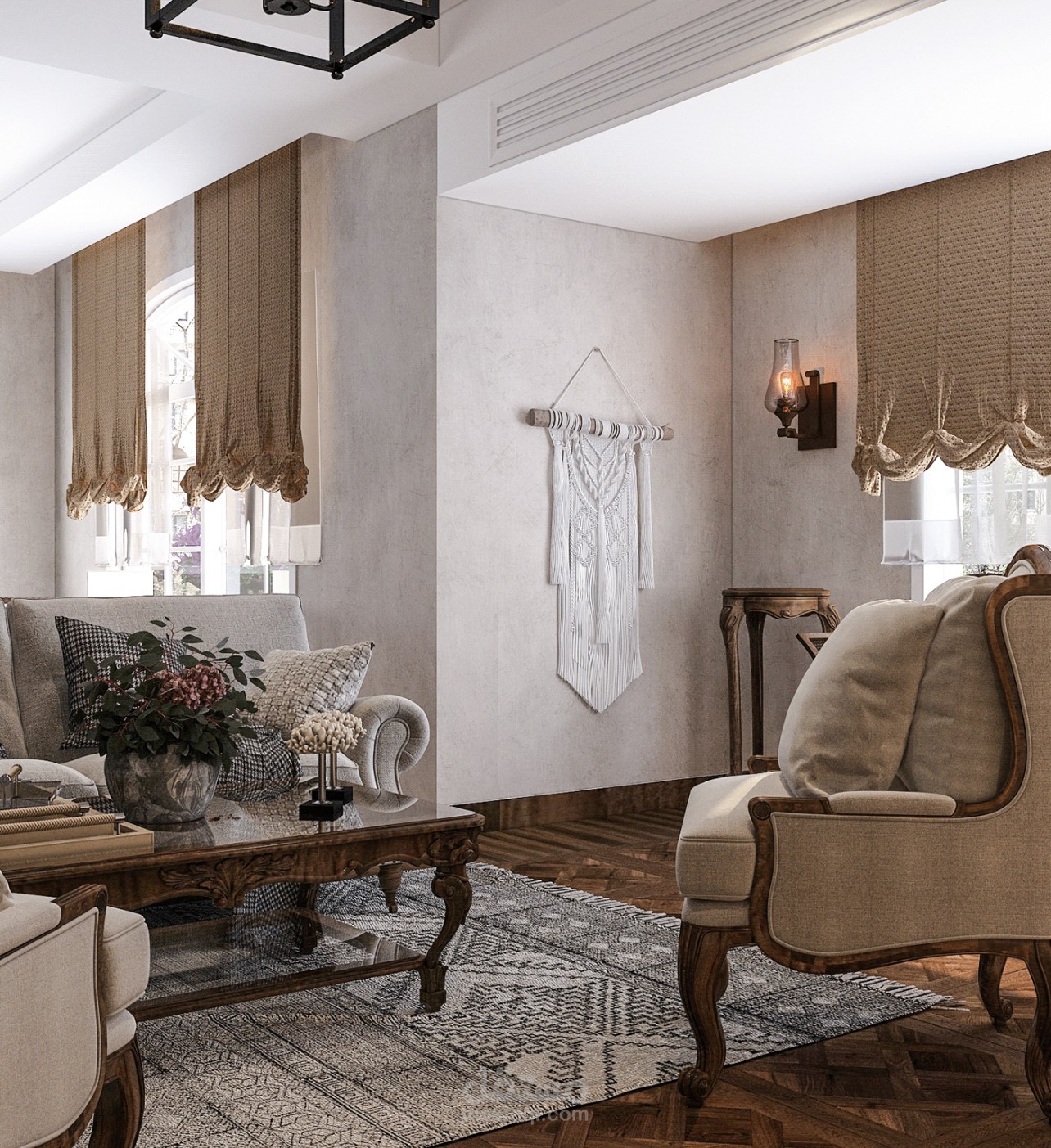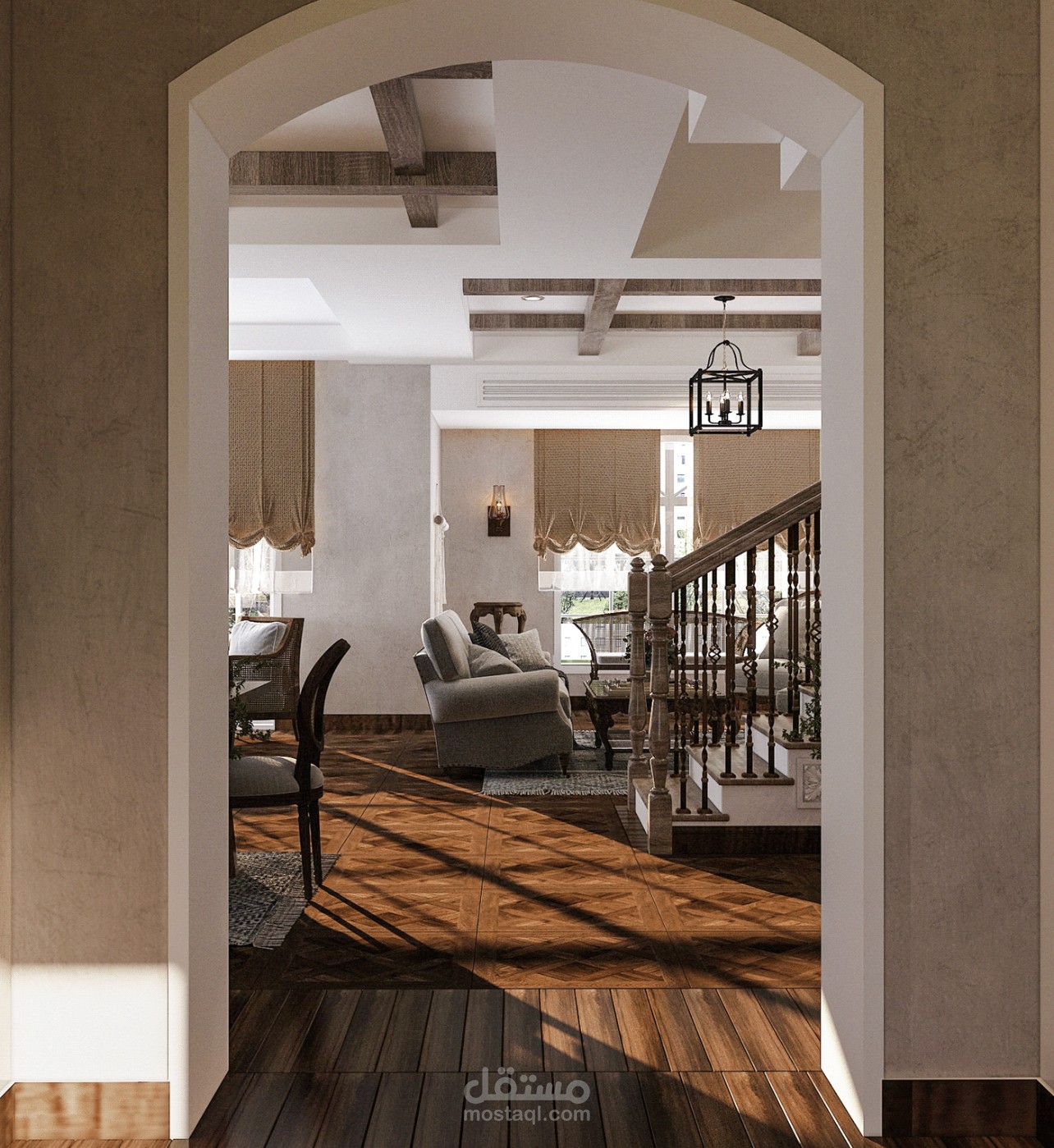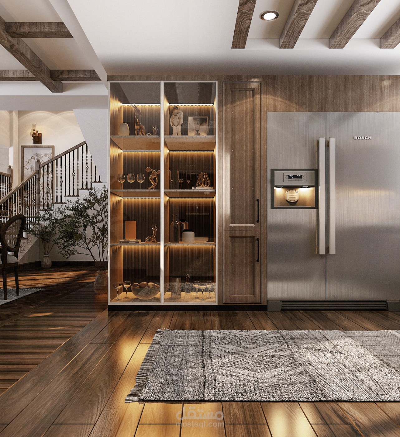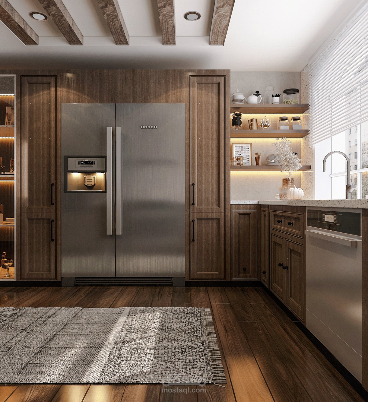 تصميم هادئ لصالة معيشة متصل بها مطبخ وصالة طعام.