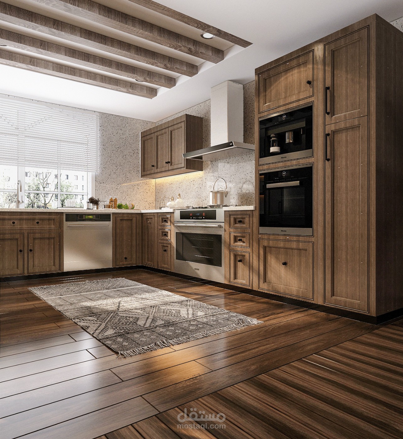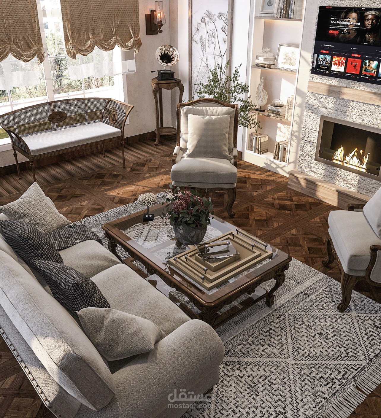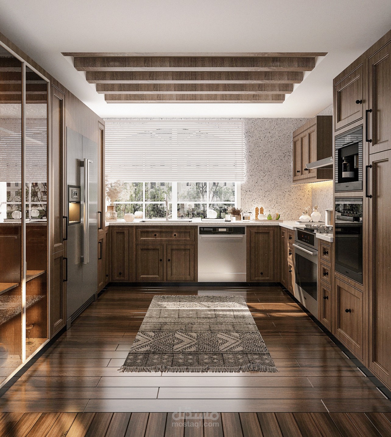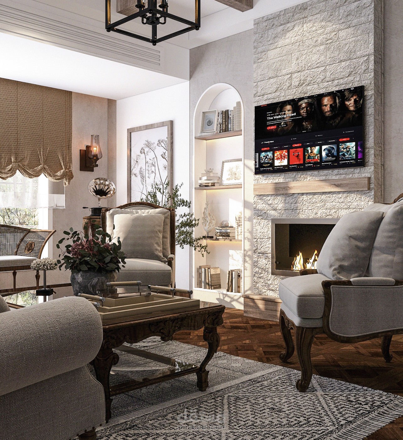 تصميم هادئ لصالة معيشة متصل بها مطبخ وصالة طعام.