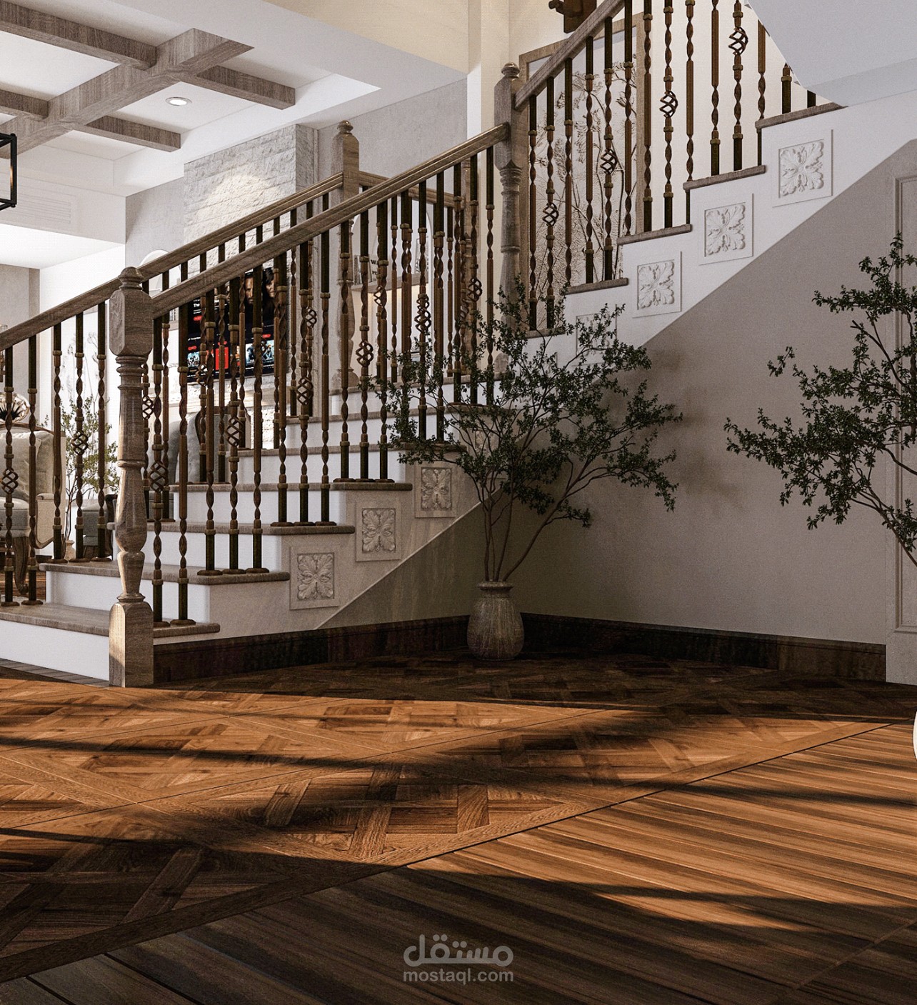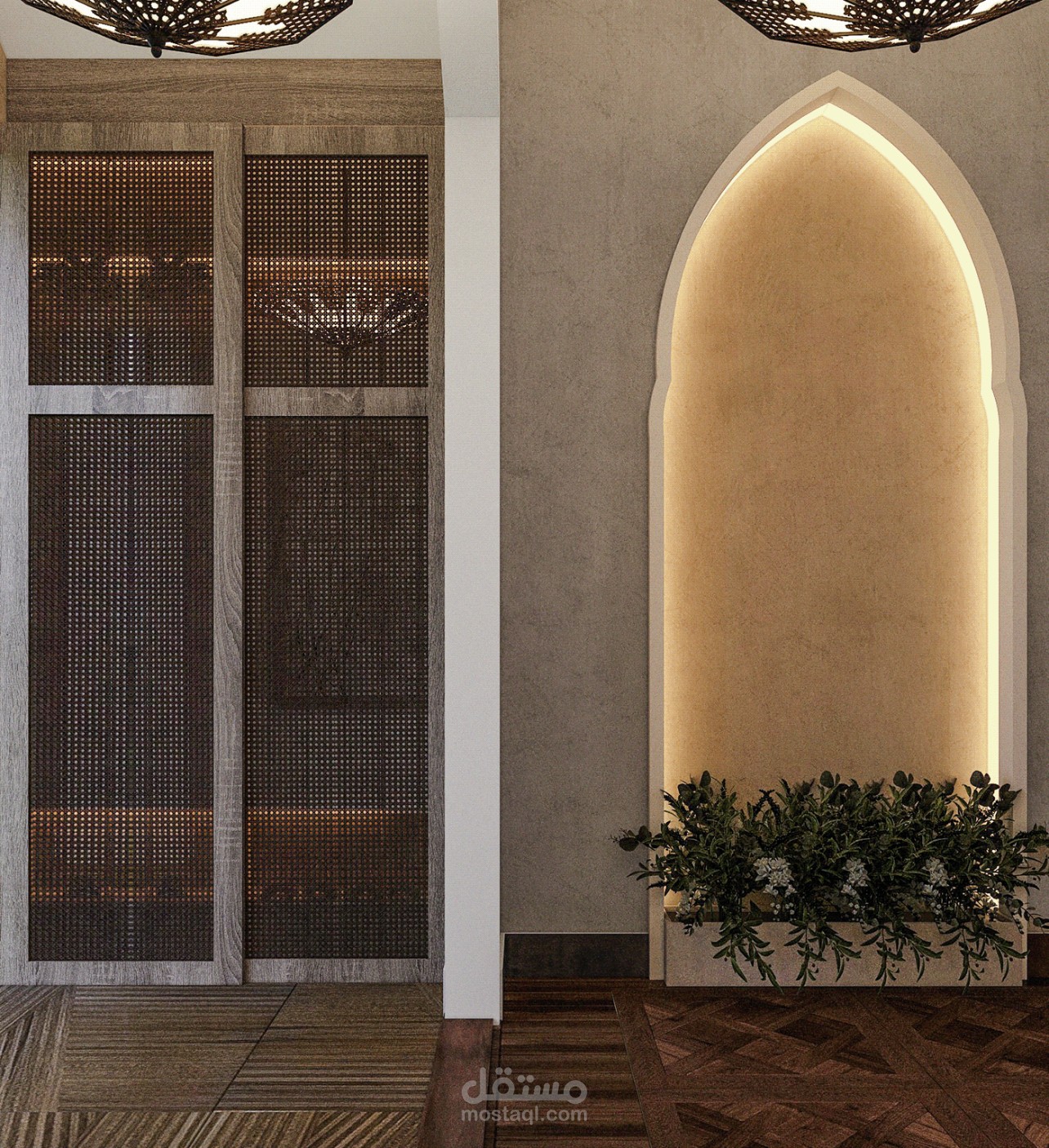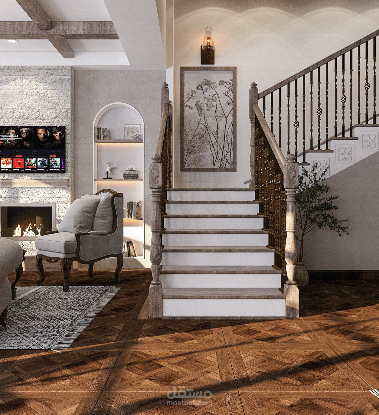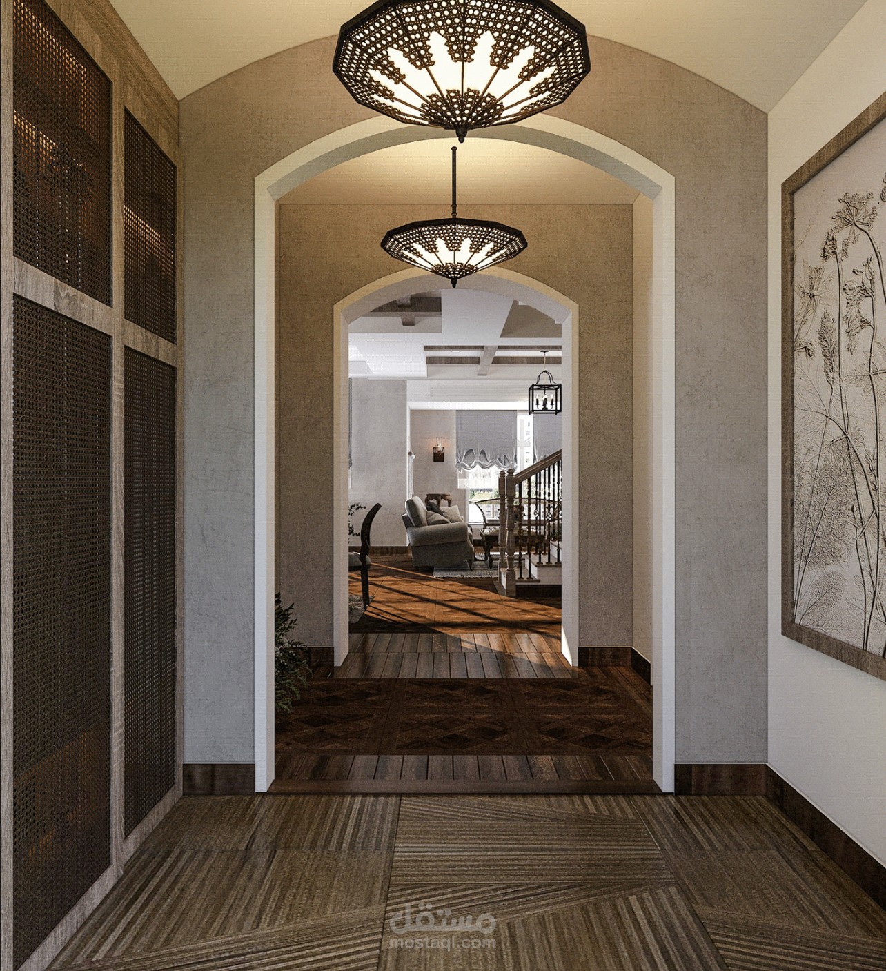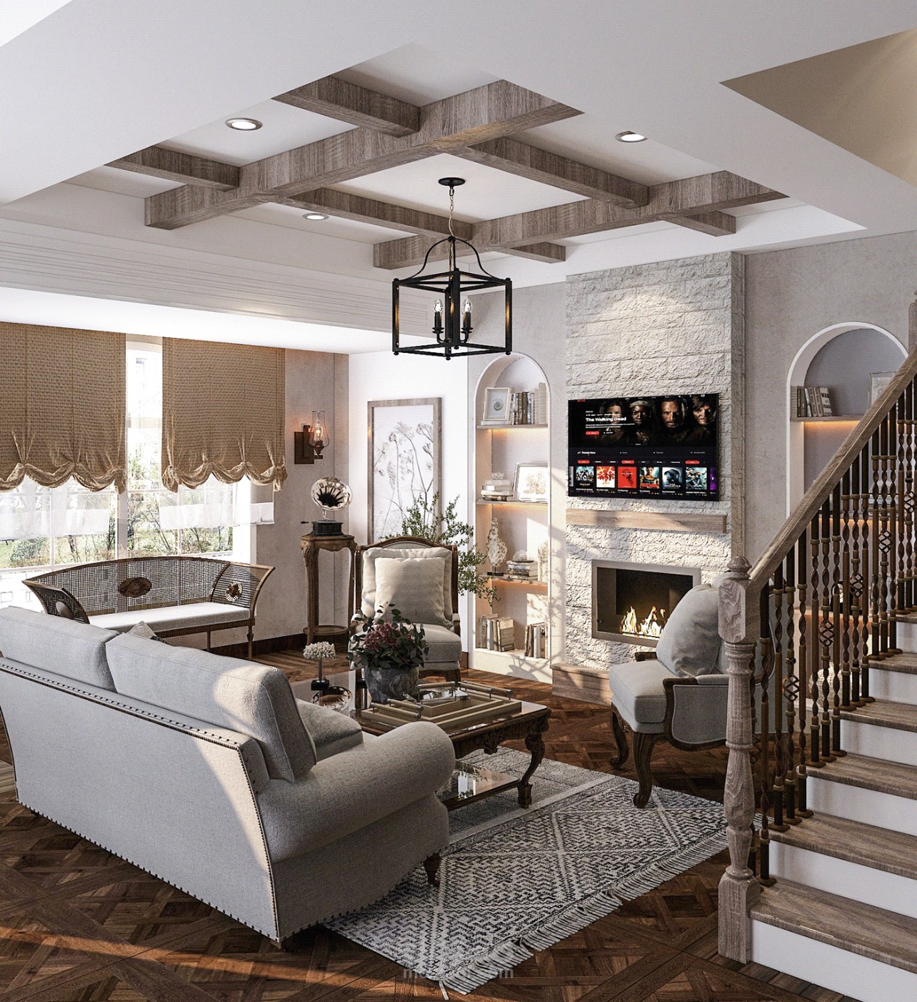 تصميم هادئ لصالة معيشة متصل بها مطبخ وصالة طعام.