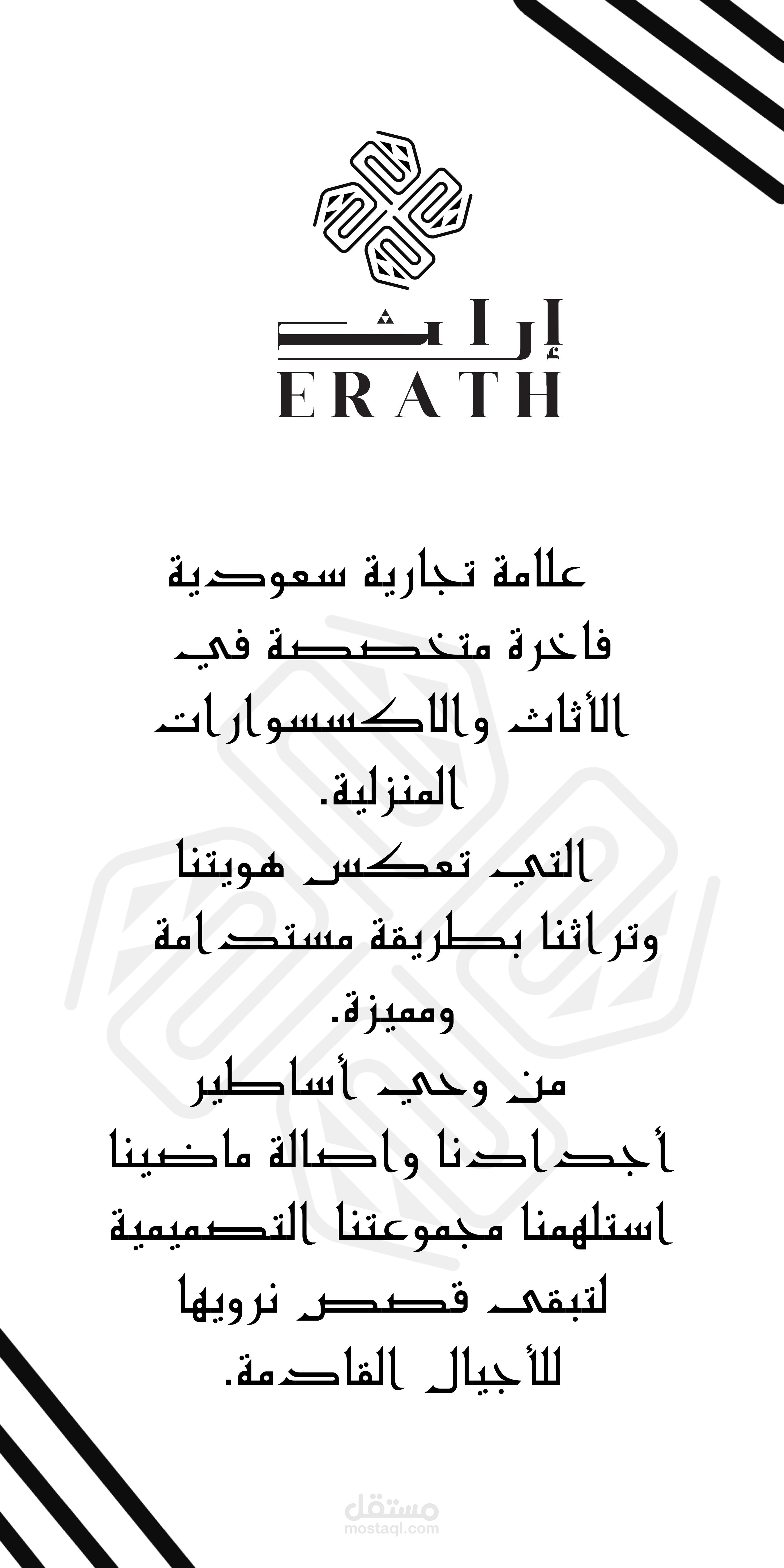 تم التعديل وإعادة هيكلة شعار مكتب اراث للديكور بنمط تكرار دائري لوحده تم تصميمها بالحرف الاول من اسم الماركة وهو حرف الe باللغة الانجليزية ،ويكون مصمم على شكل منزل إشارة إلى العمل على الديكورات المنزلية ،يحتوي أعلاه على اشكال زخرفية على شكل مثلث إشارة إلى التراث السعودي.