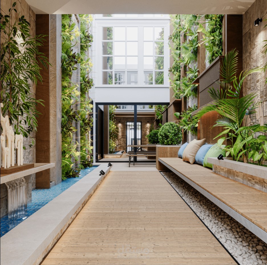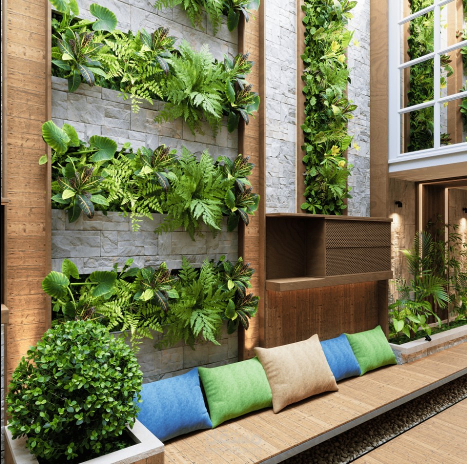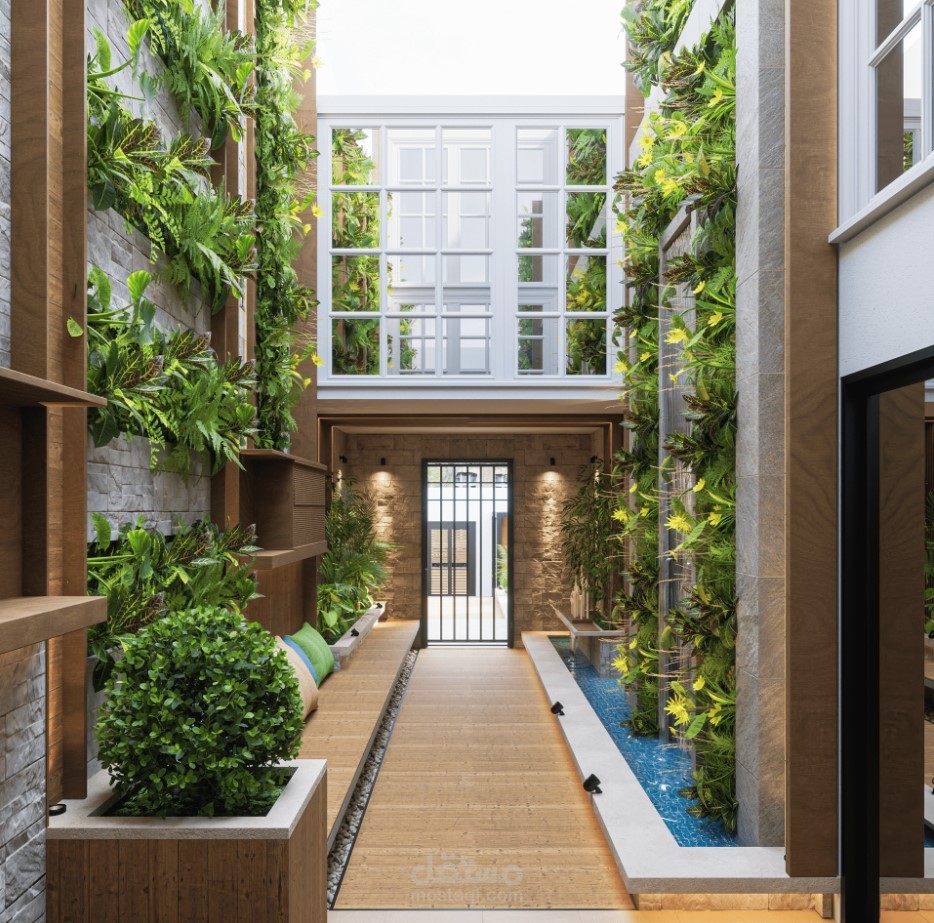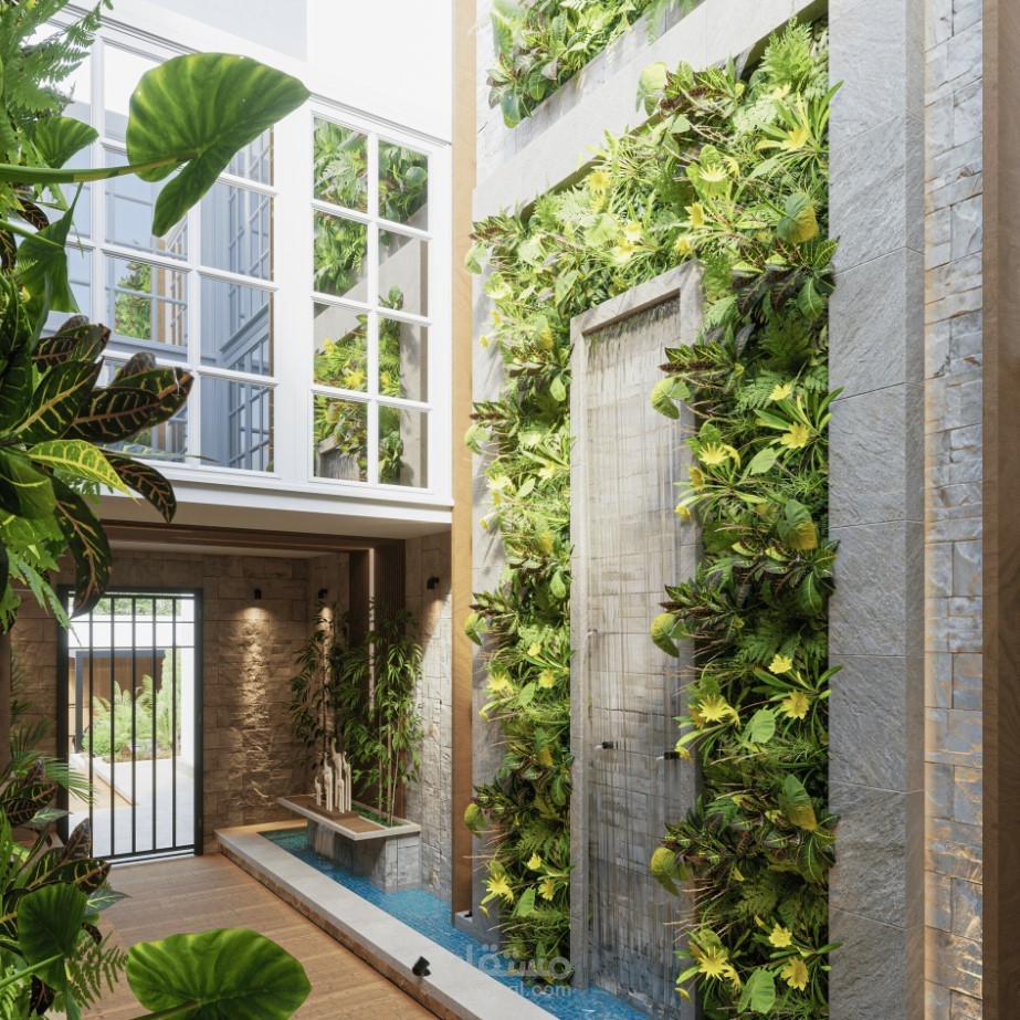 تصميم حديقة داخلية باستخدام ال green walls لإضافة عنصر الطبيعة في المساحات الضيقة