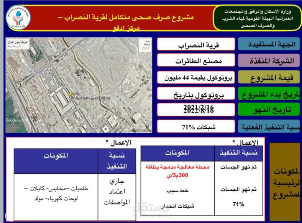 مكونات المشروع (شبكات انحدار باقطار مختلفه - مطابق باعماق مختلفه -محطه معالجه مدمجه- خط سيب نهائي)