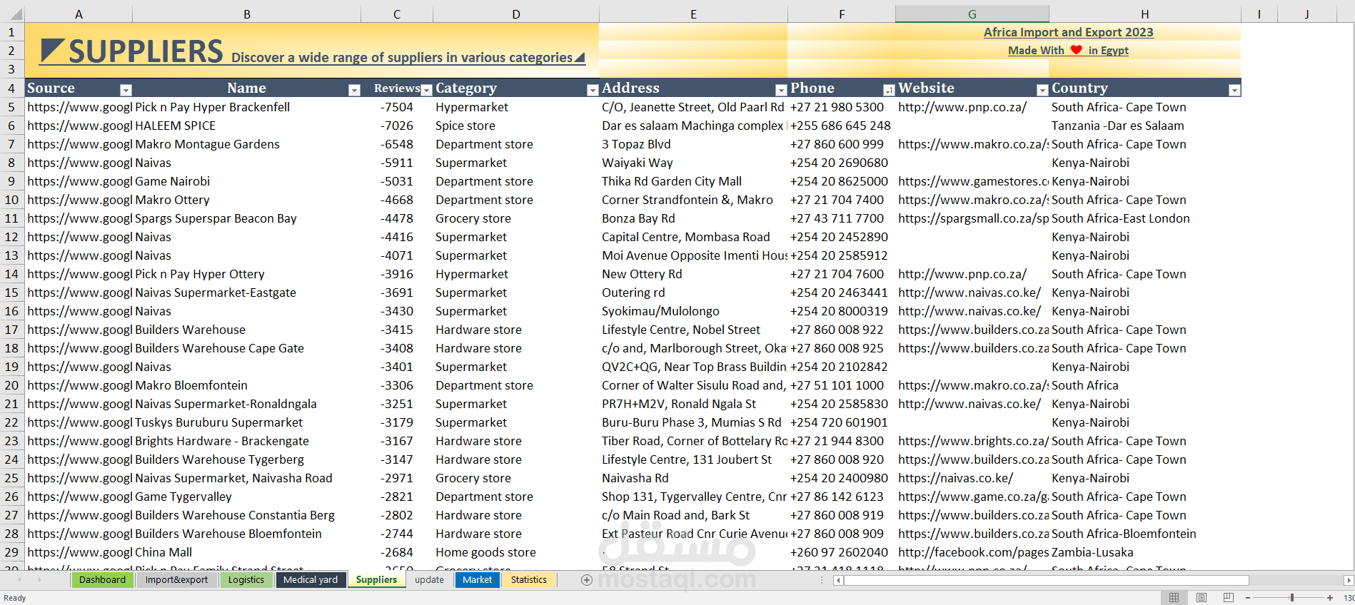 الميزات: 12000 صف مع فئات في ملف منظم ويمكن استخدام المرشحات للوصول بسهولة إلى النتائج المرجوة