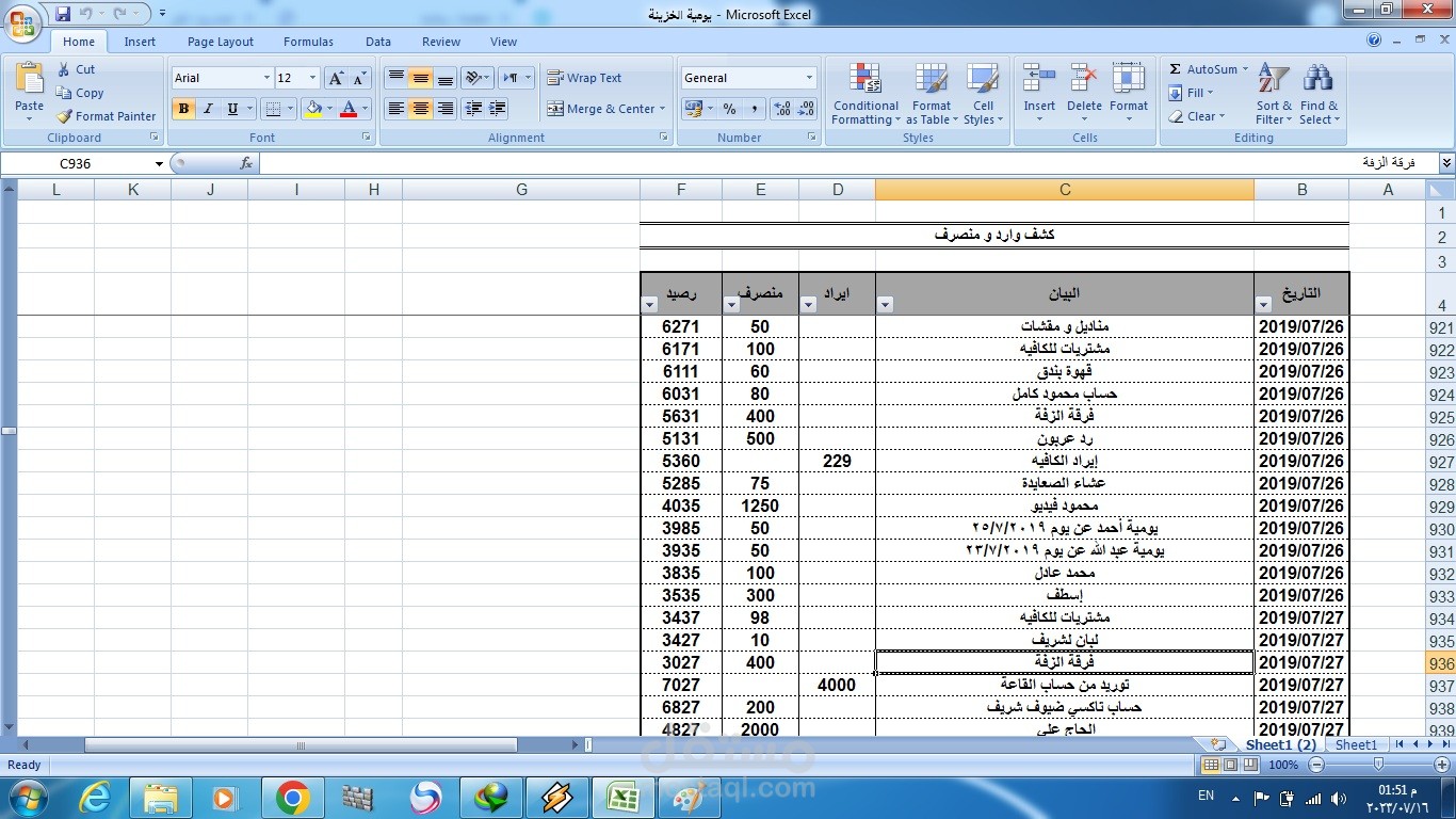 كشف حساب خزينة يوضح الوارد و المنصرف و بيانات كلا منهما