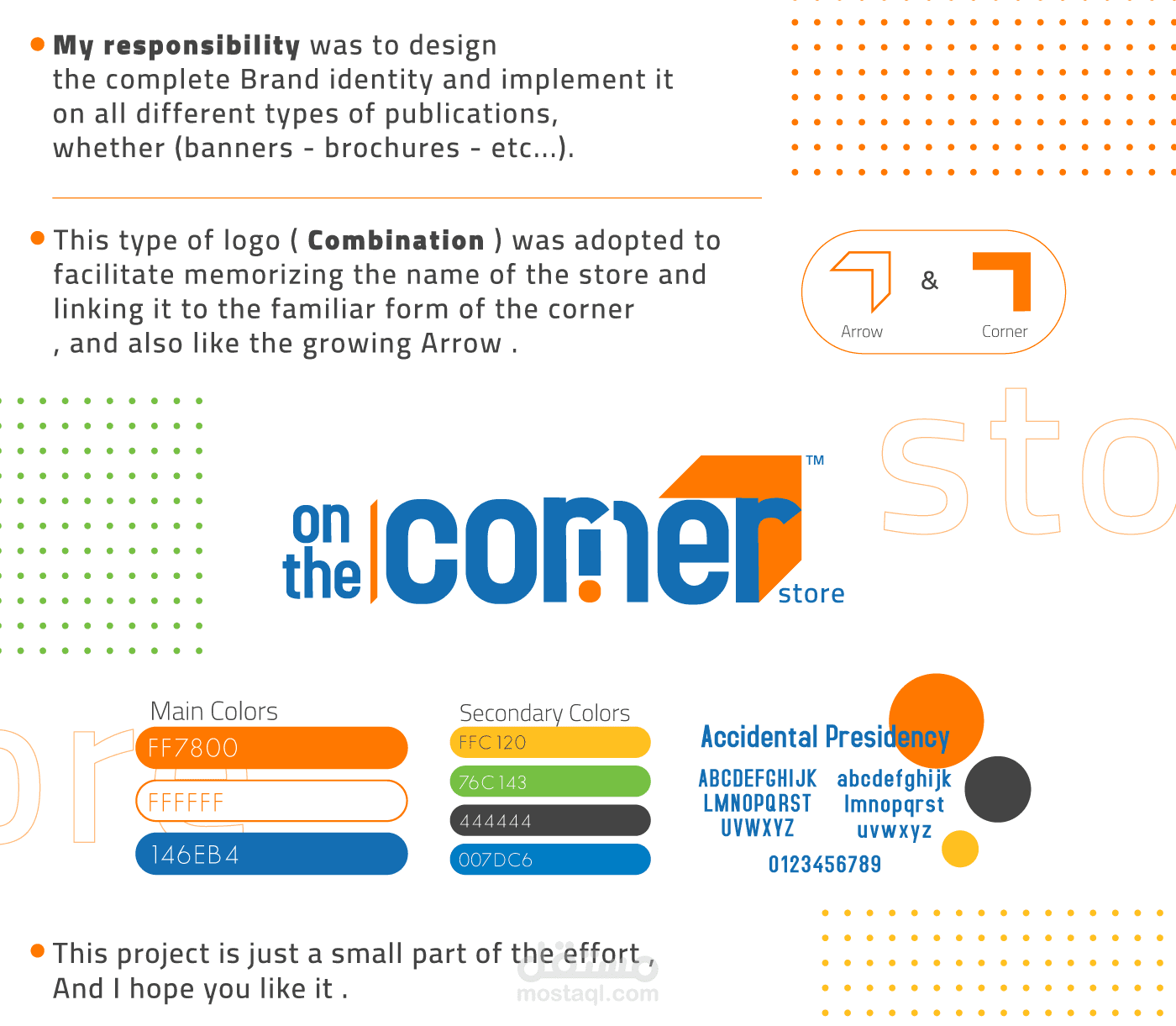و كان الهدف من تصميم الشعار هو ترسيخ و تثبيت اسم المتجر في ذهن العميل و تسهيل أمر الحفظ عن طريق بساطة الخط و الرمز المستخدم في الشعار و هو الزاوية , فكلما زادت بساطة الشعار كلما كان سهل تذكره , و أتمنى أن ينال هذا العمل اعجابكم .