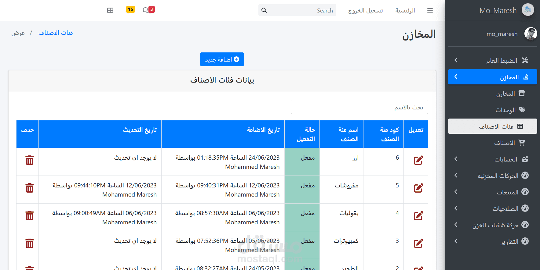 - كل حركة بيع، شراء أو جرد على الأصناف يتم تسجيلها في جدول حركات الأصناف.