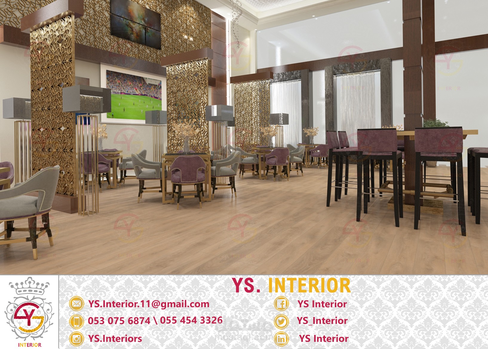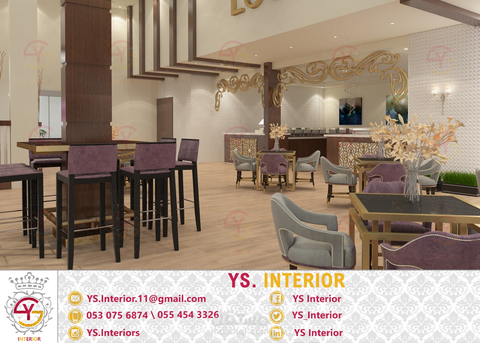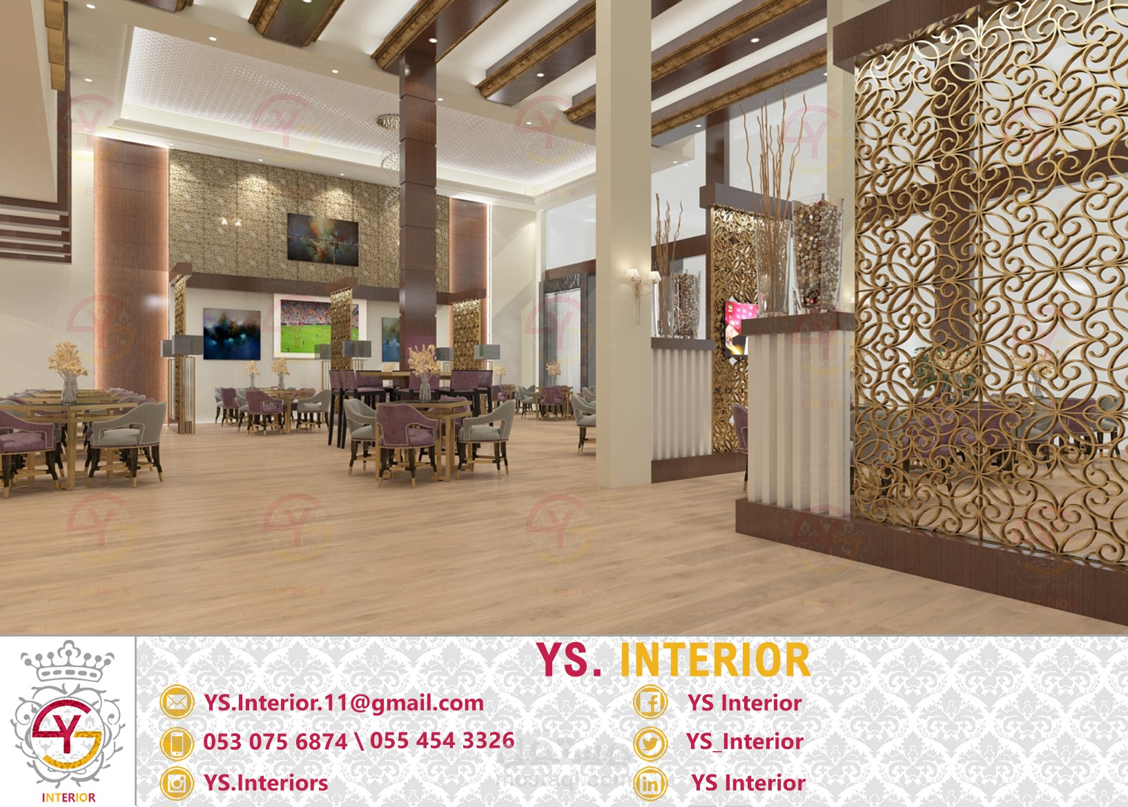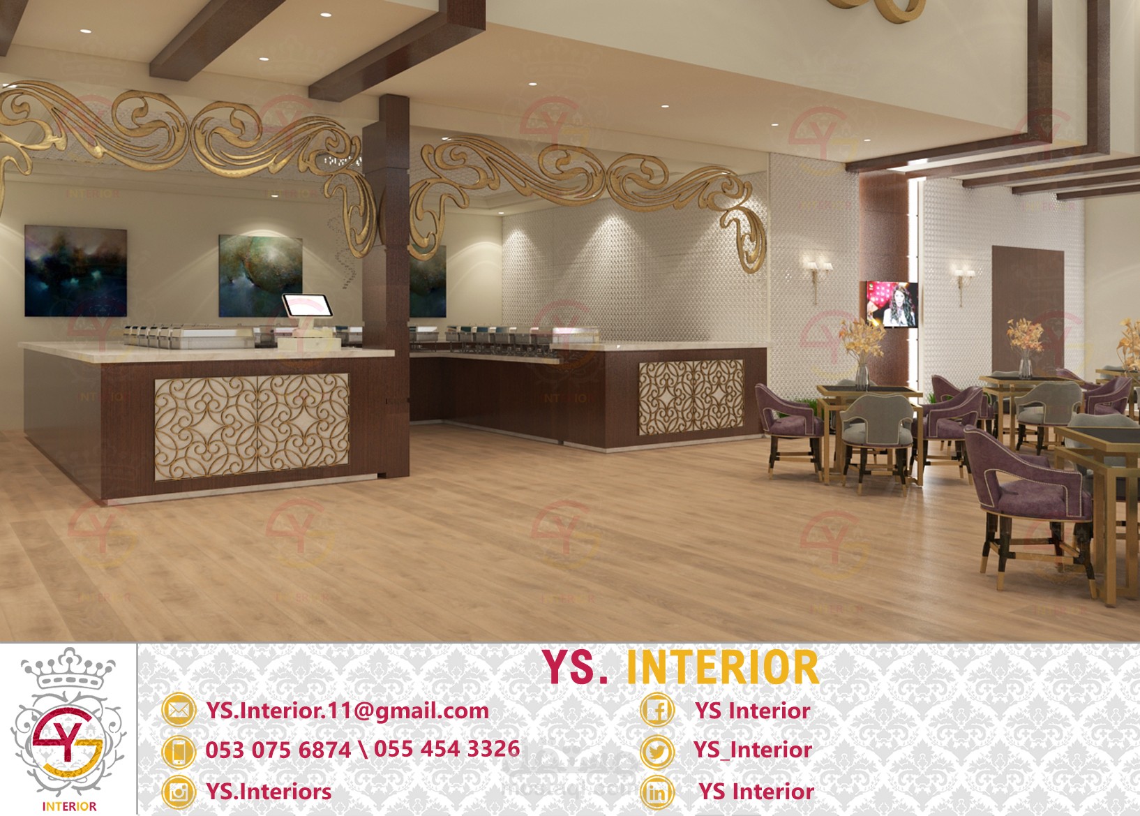 تصميم لمطعم في فندق في مدينة الخفجي - السعودية .. تم التصميم على الطراز النيوكلاسيك حسب طلب العميل .. تسليم التصميم كان مع كامل المخططات التنفيذية على برنامج الاوتوكاد لضمان جودة التنفيذ
