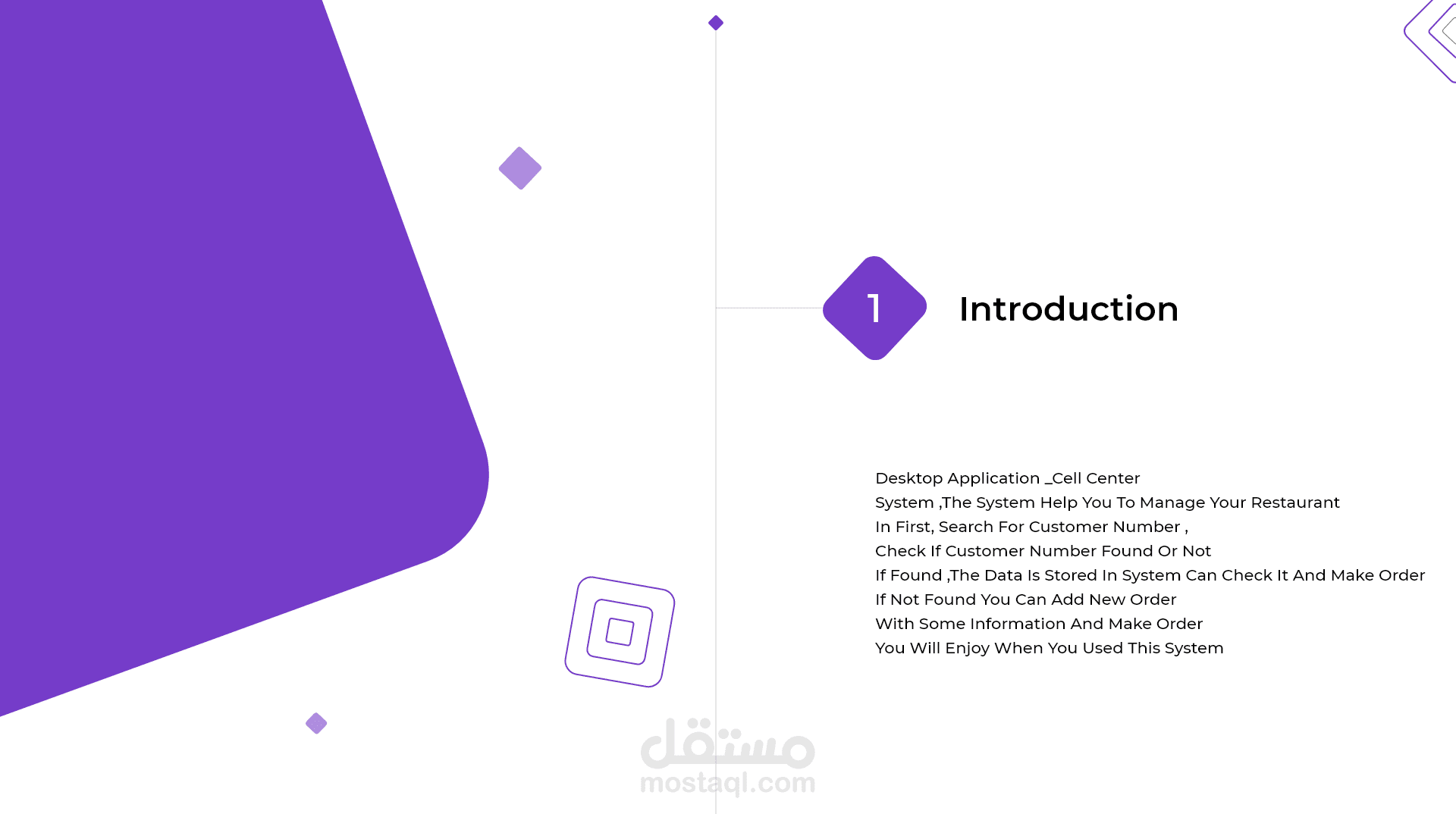 call center desktop system سيستم يستخدم في بعض من المطاعم ليقوم الاشخاص الذين يسلتمون الطلبات بعمل اوردرات بشكل سريع للclients يقوم من خلاله تحديد المنتجات و الاضافه الي رقم العميل ثم يمكن من خلال السيستم متابعه الاوردر حتي الوصول للعميل و تقديم شكاوي و مراجعه جمع الاوردرات خلال اليوم