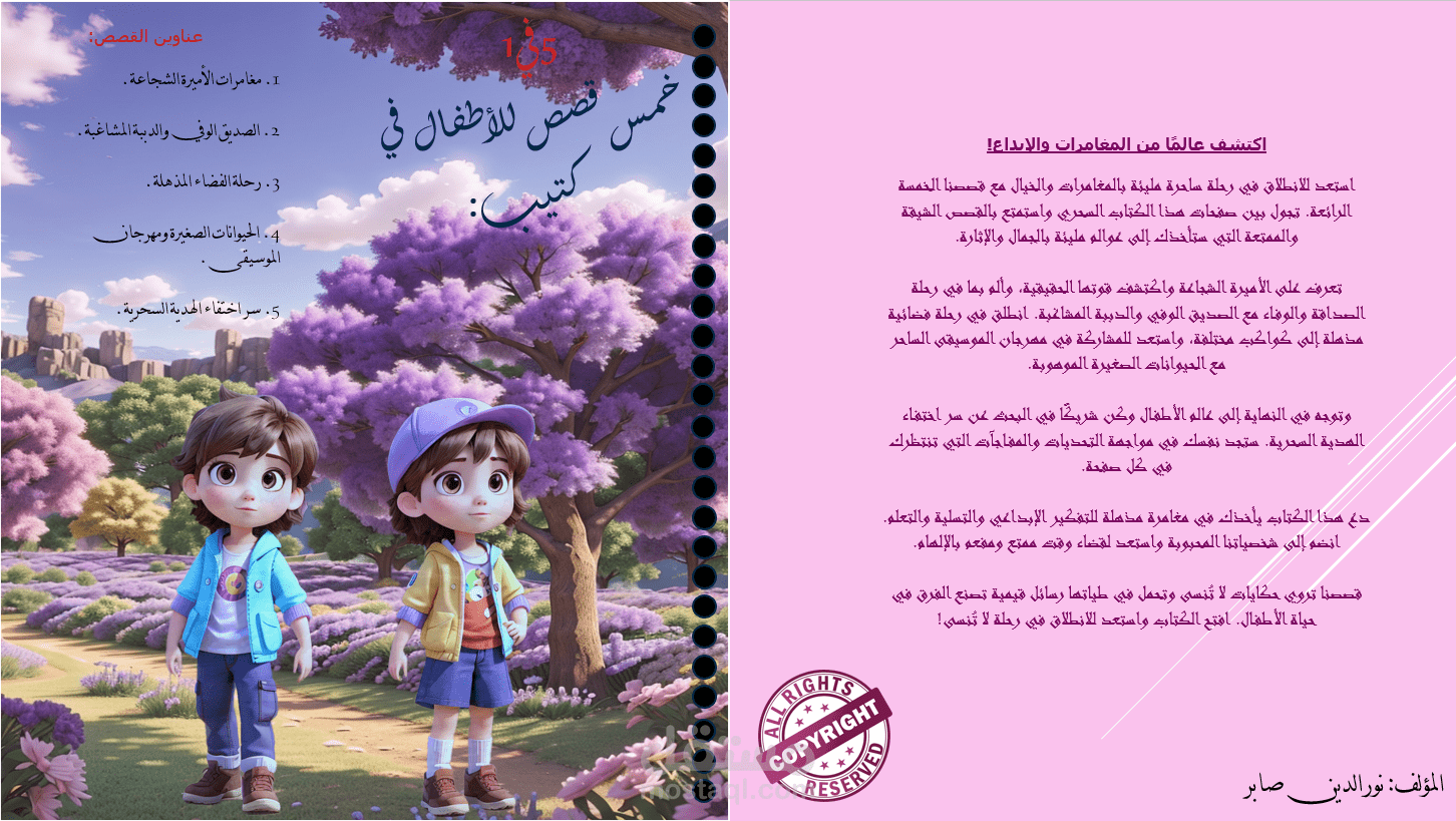 مرحبا، هذا عمل من اعمالنا المنجزة، كتاب للاطفال يحتوي على خمس قصص مرفوقة بصور خاصة بكل قصة اليكم تفاصيل القصص: