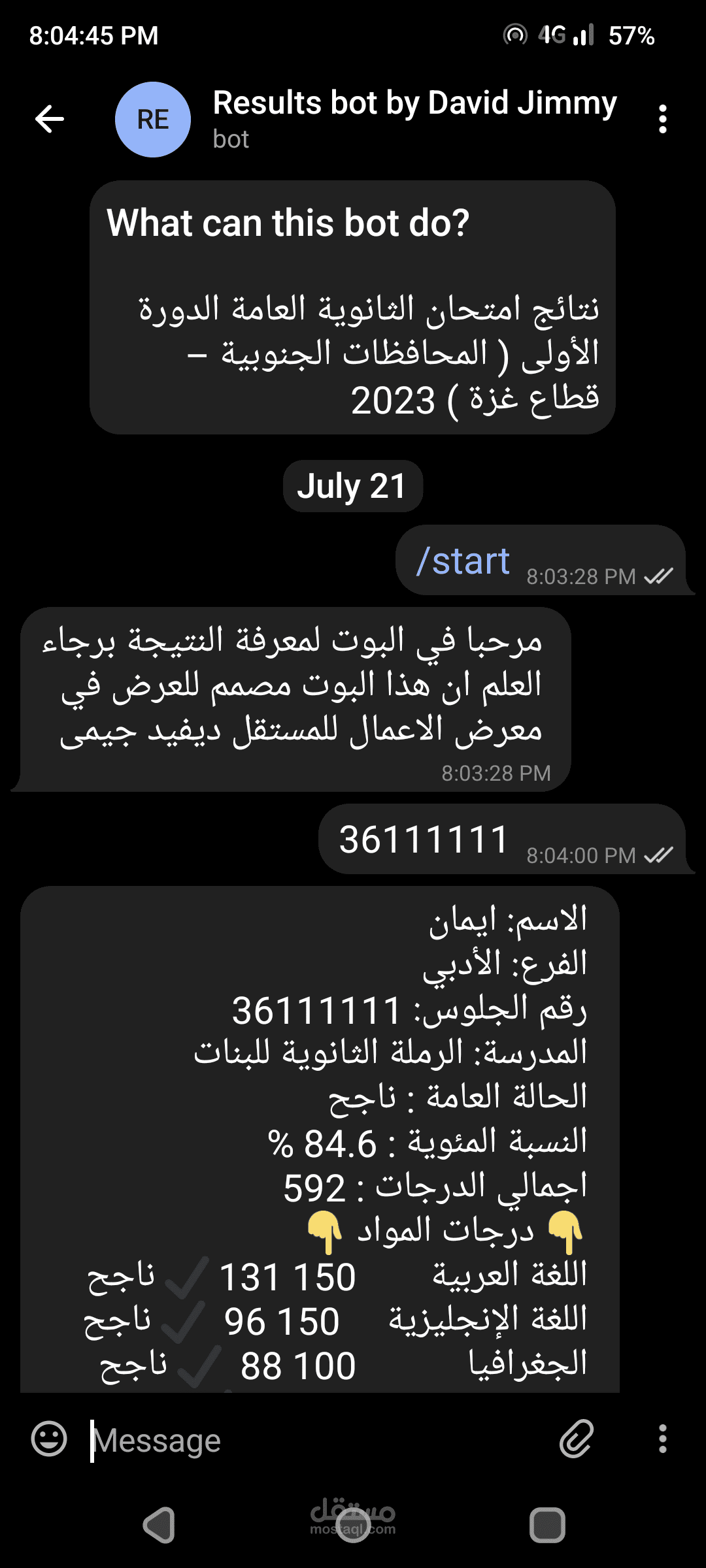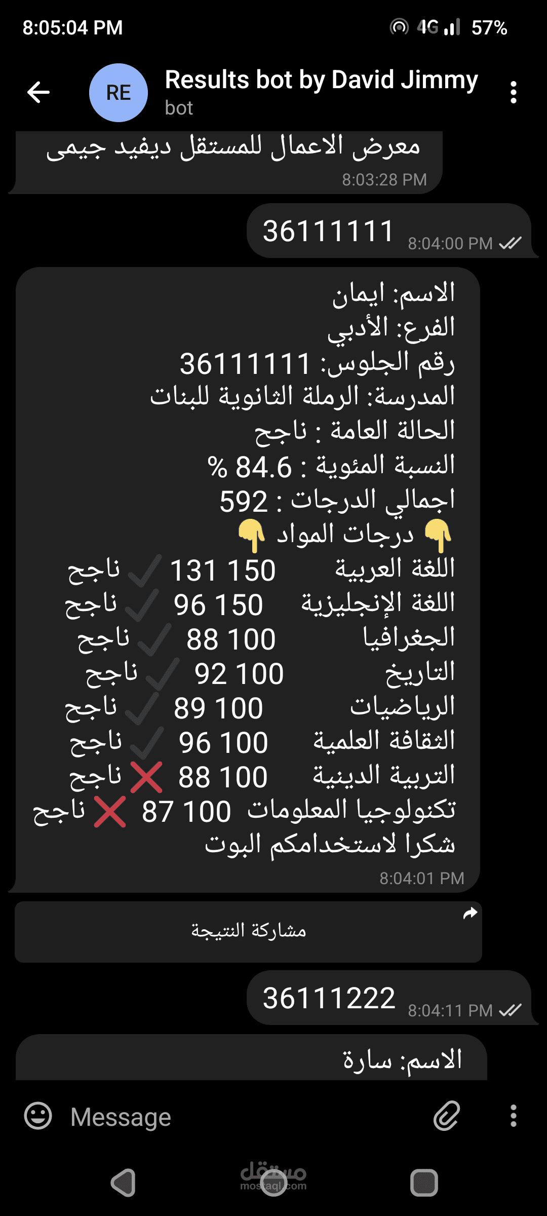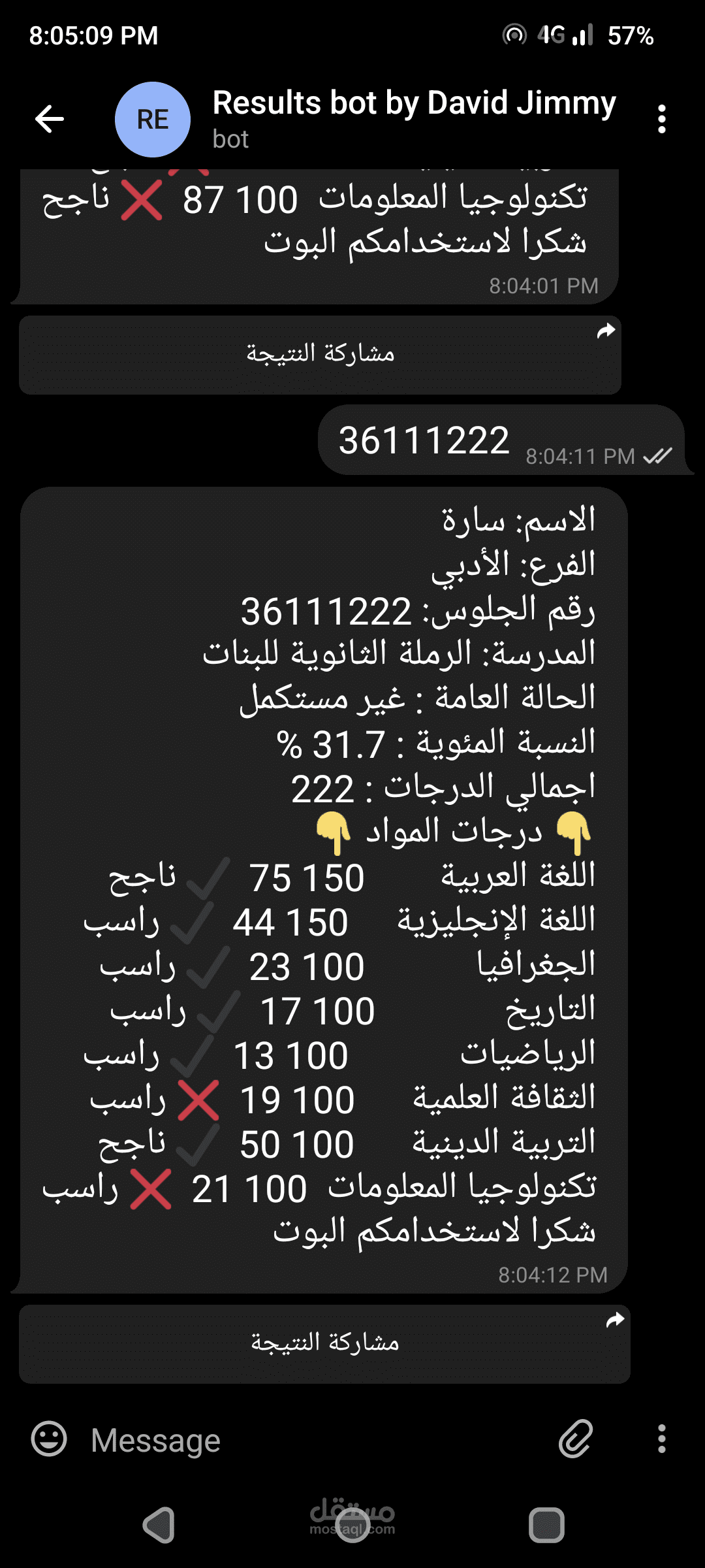 طريقة استخدام البوت، ترسل له رقم الجلوس يرد عليك بالاتي