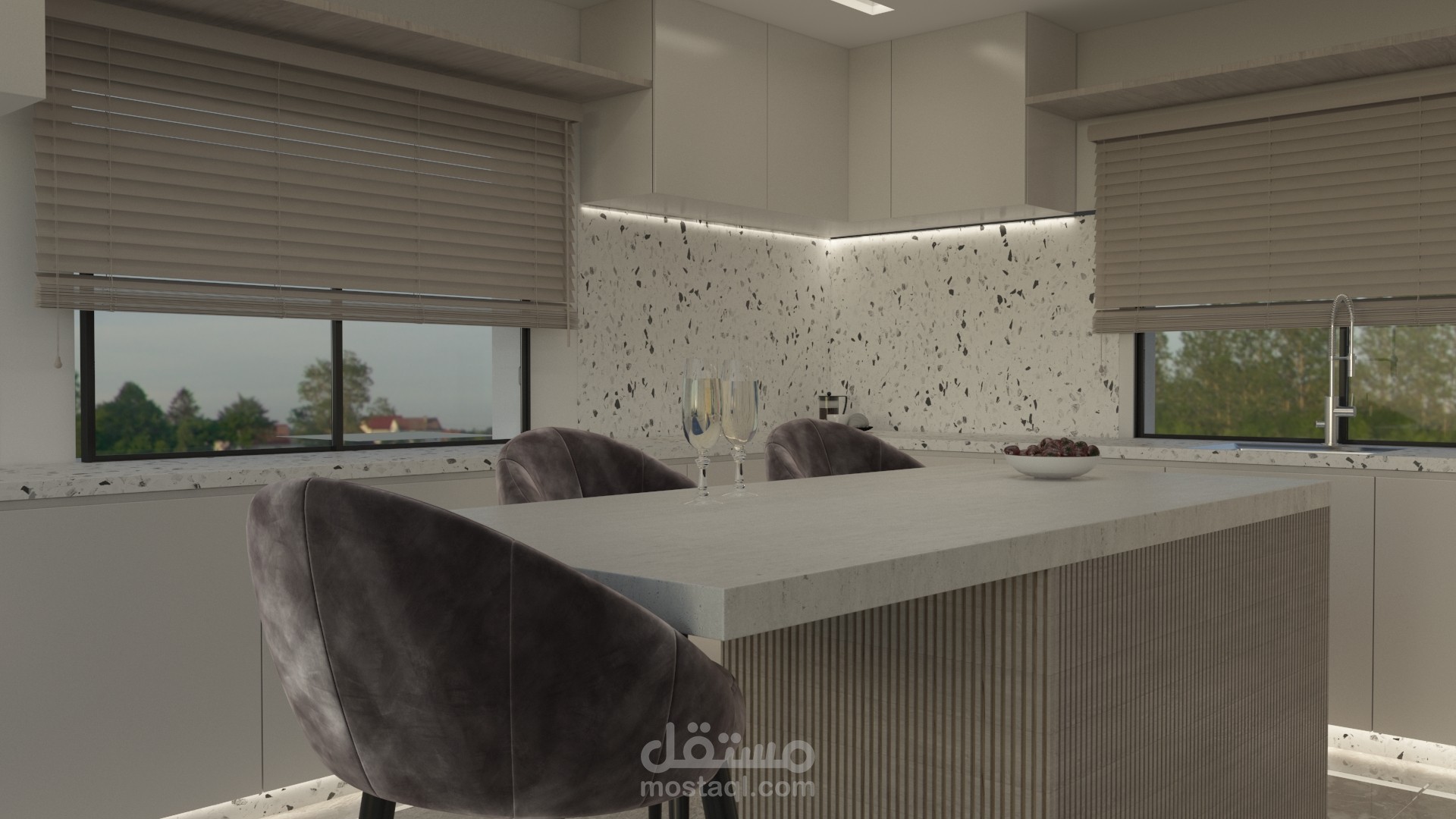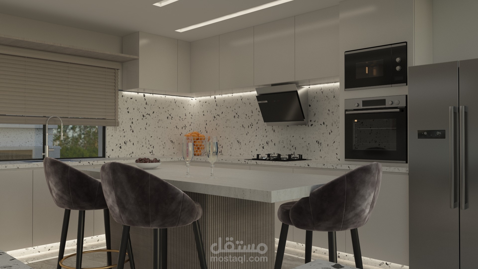 مع مراعاة وجود جزيرة تخديمية في المطبخ