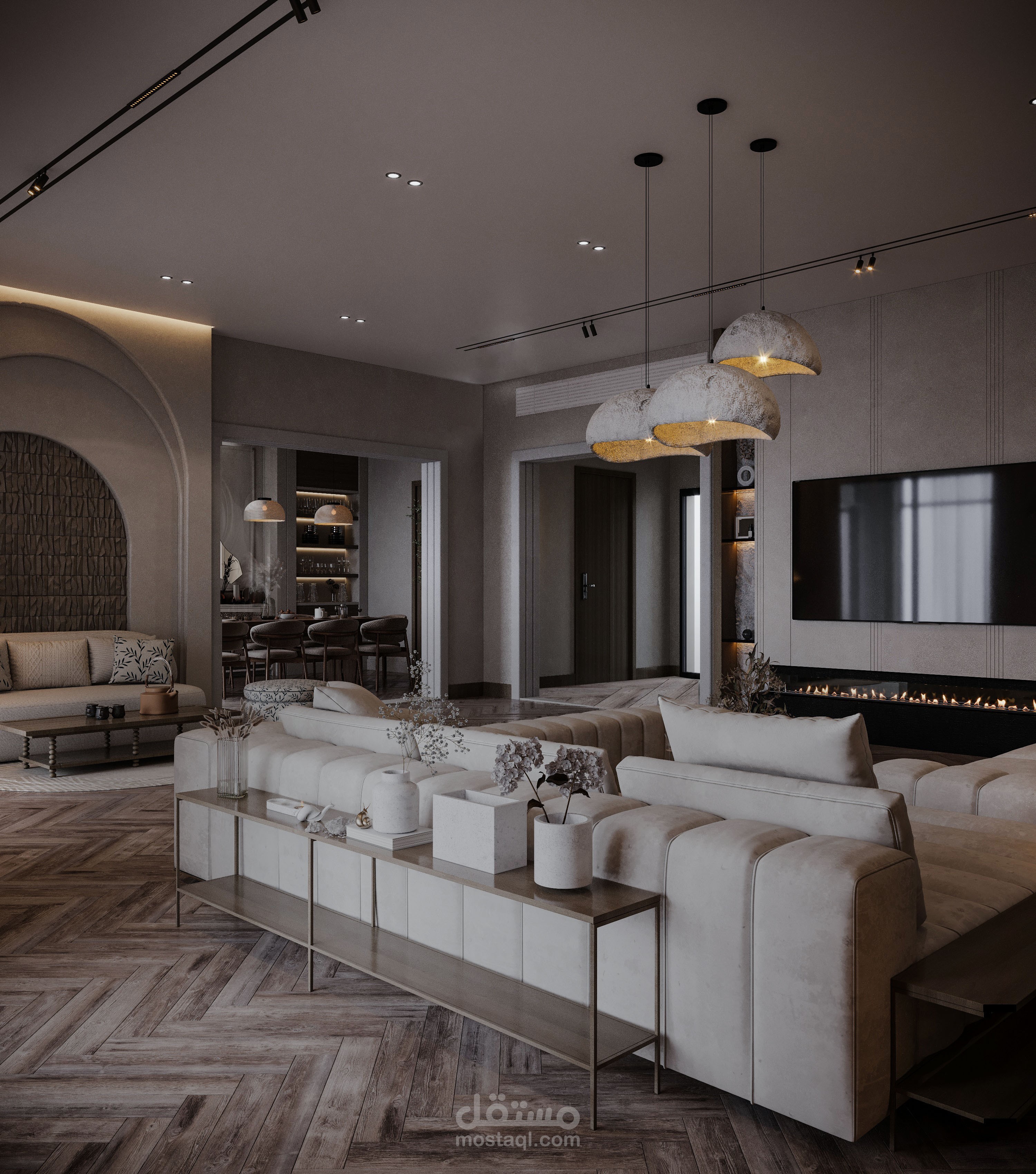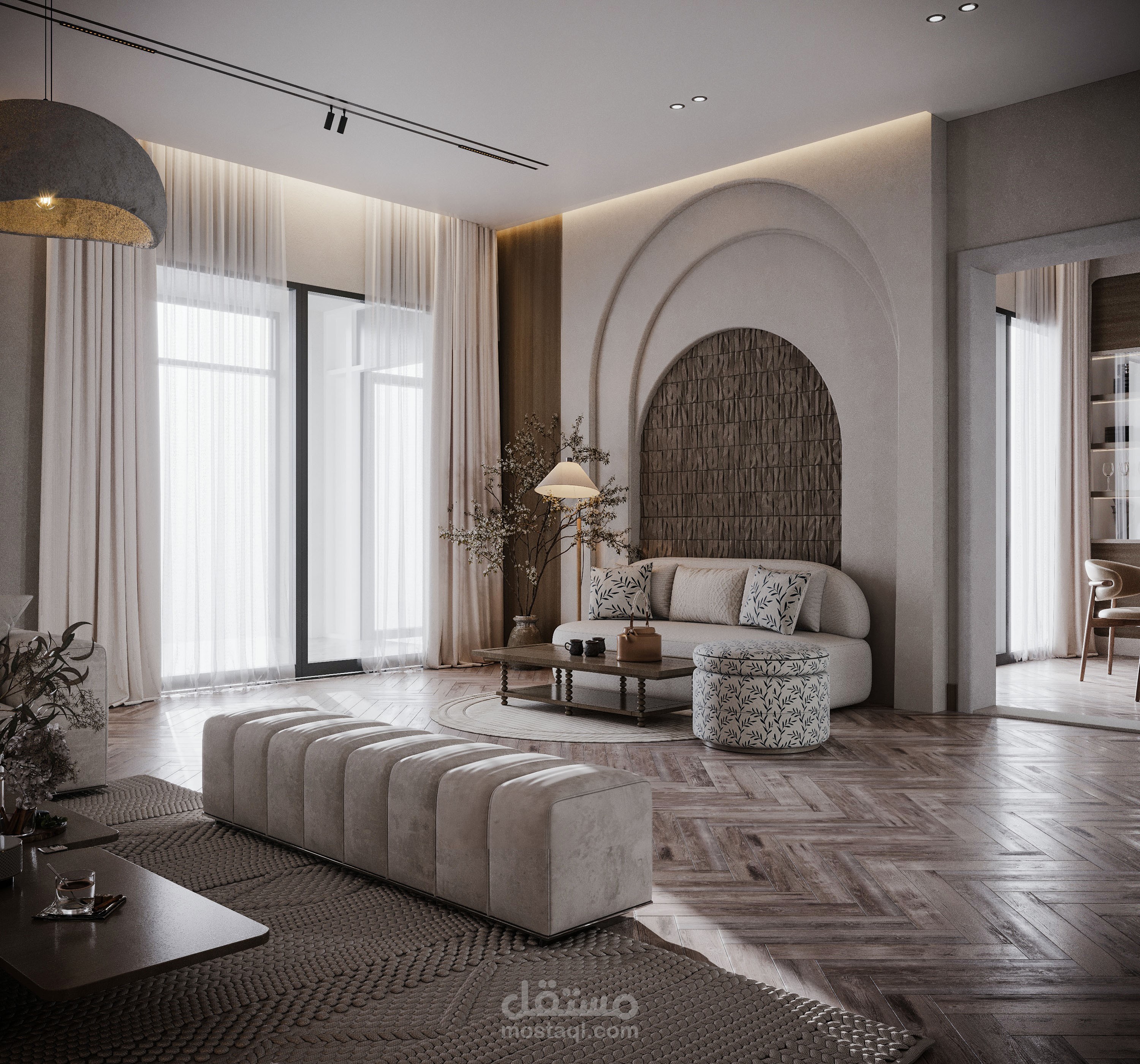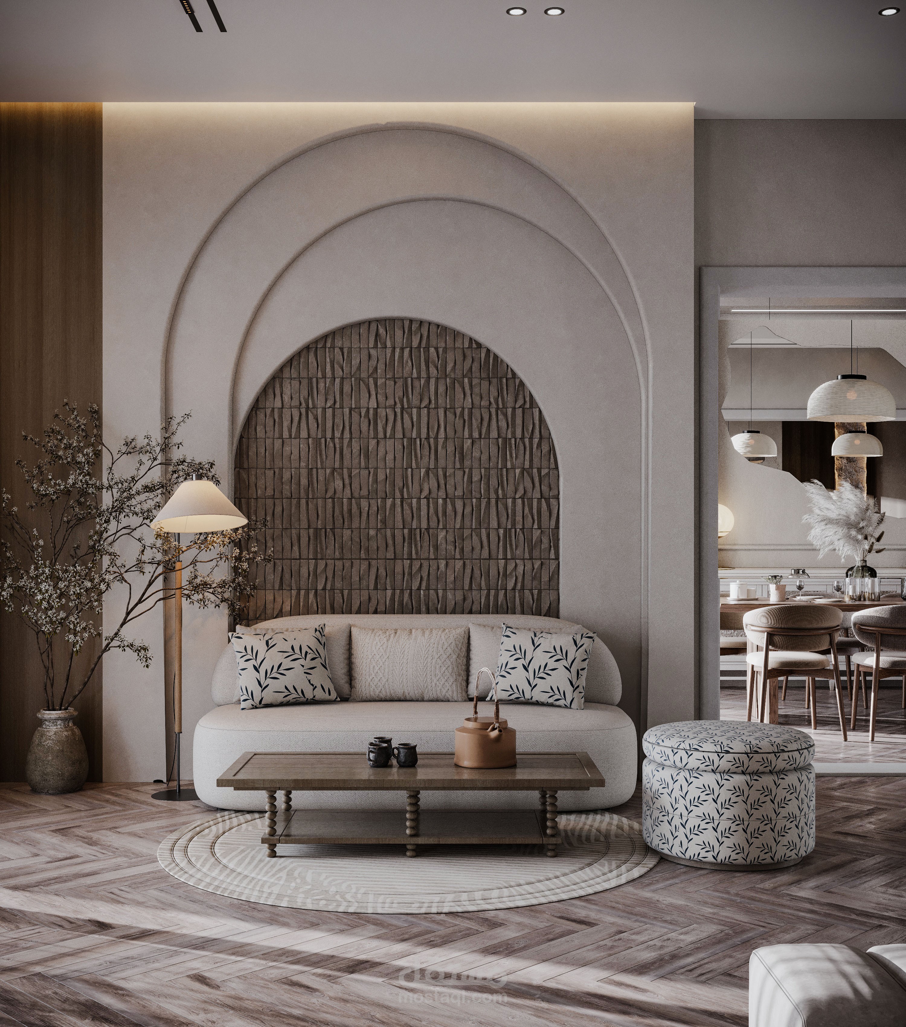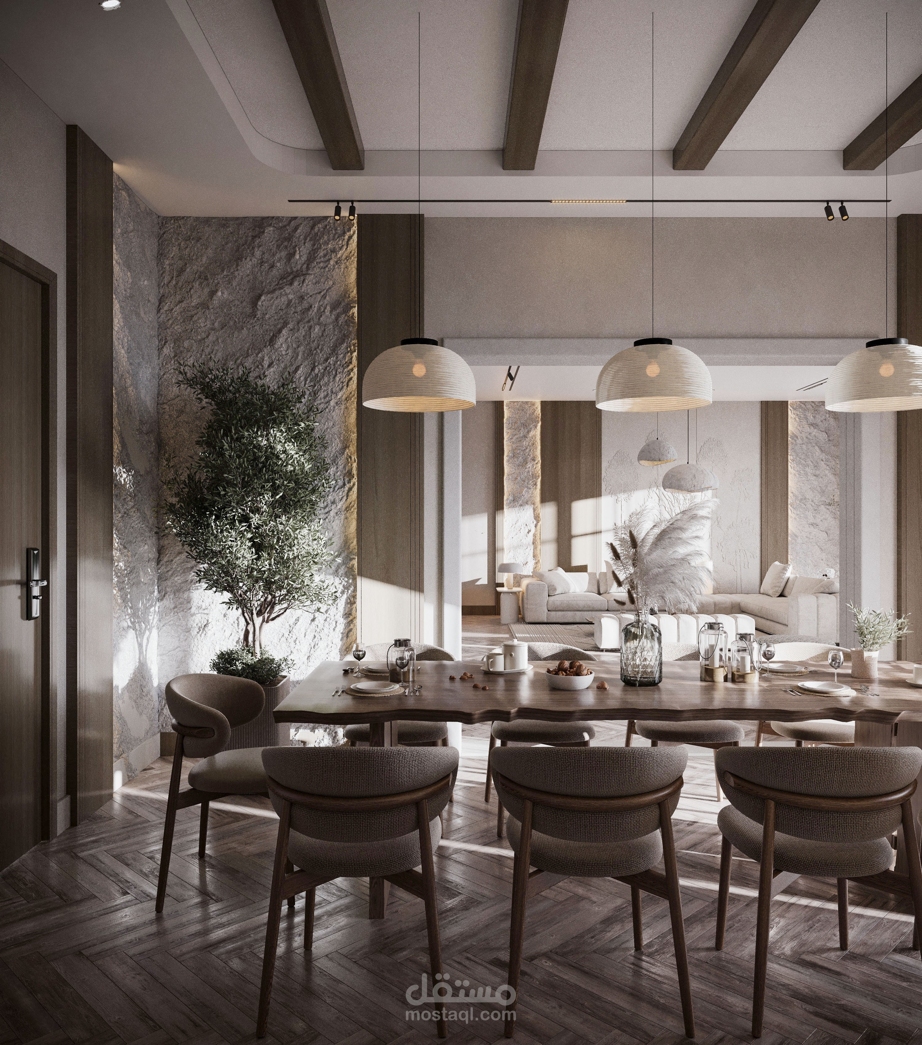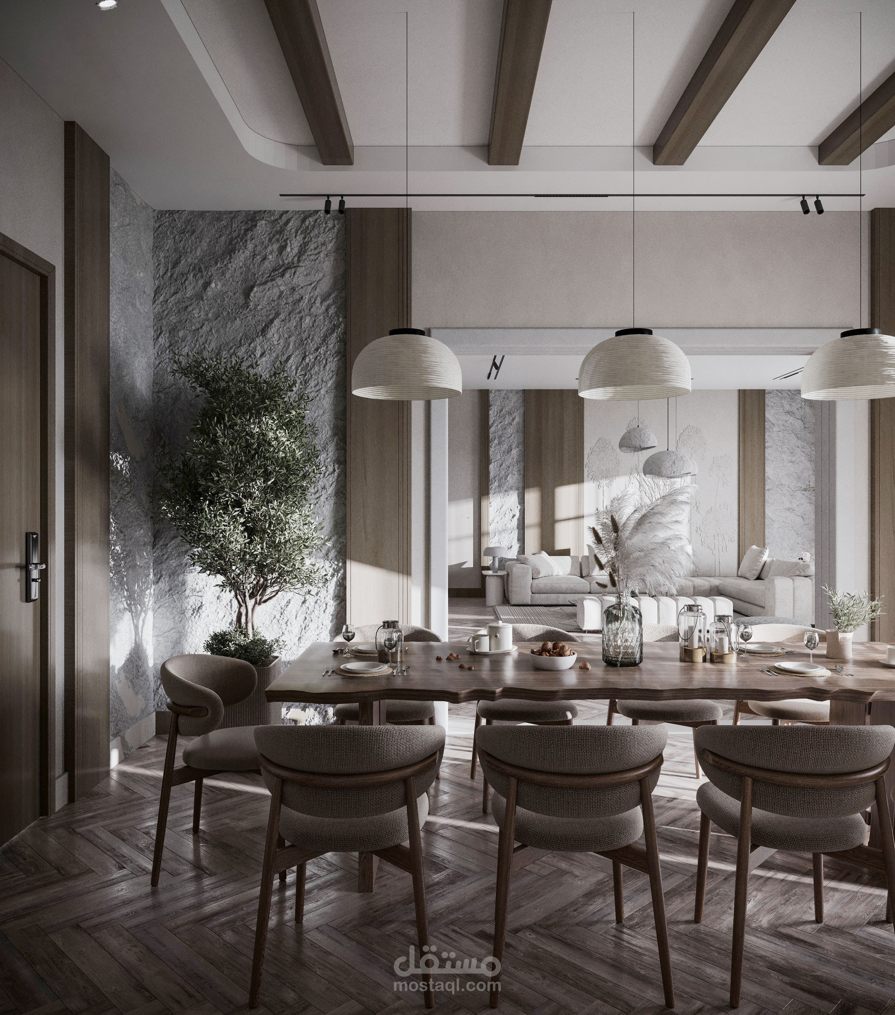تصميم صالة استقبال مع صالة طعام بطراز وابي سابي.