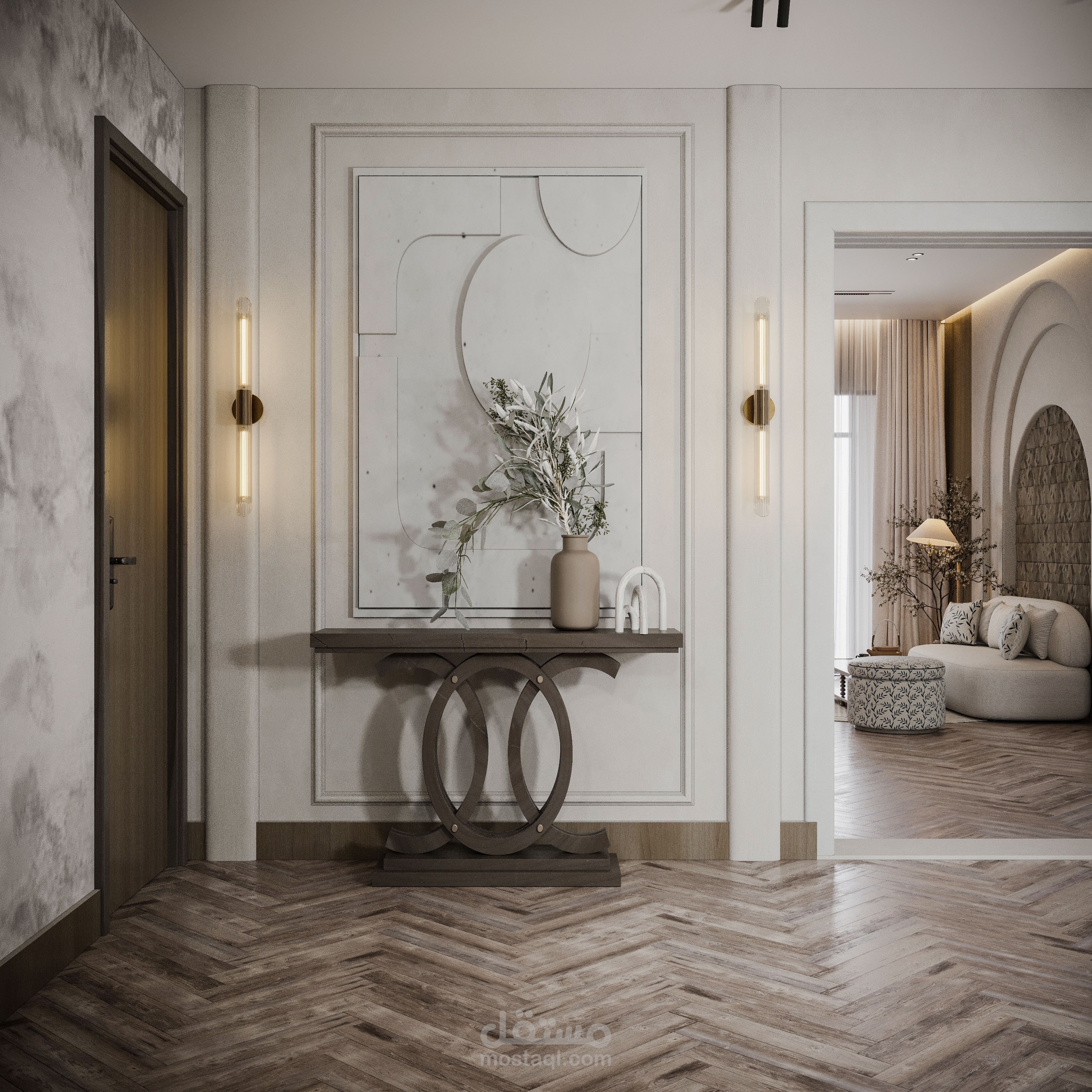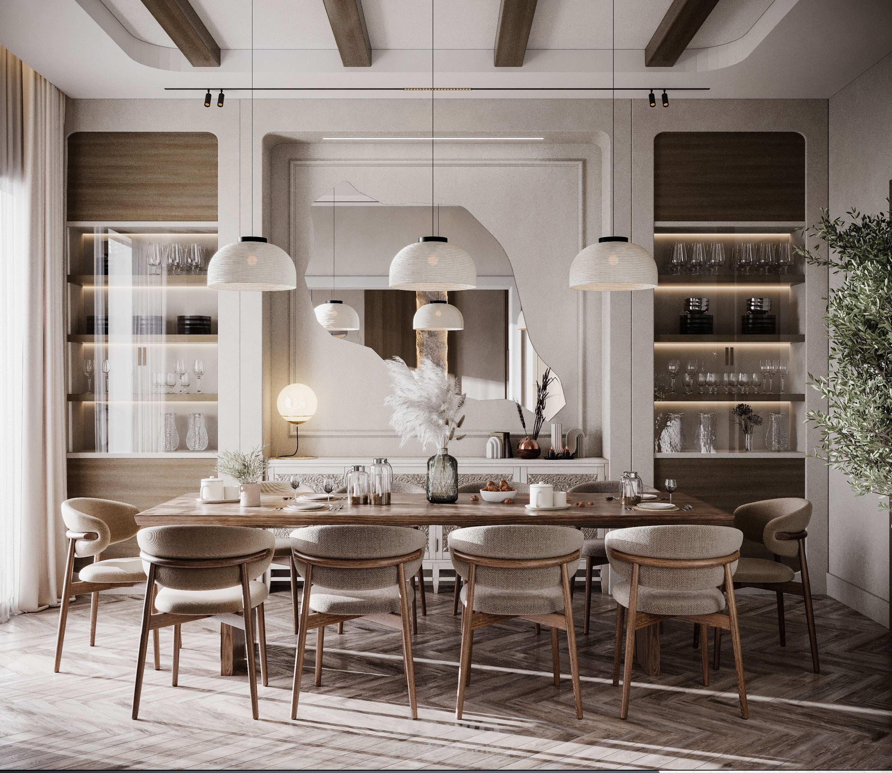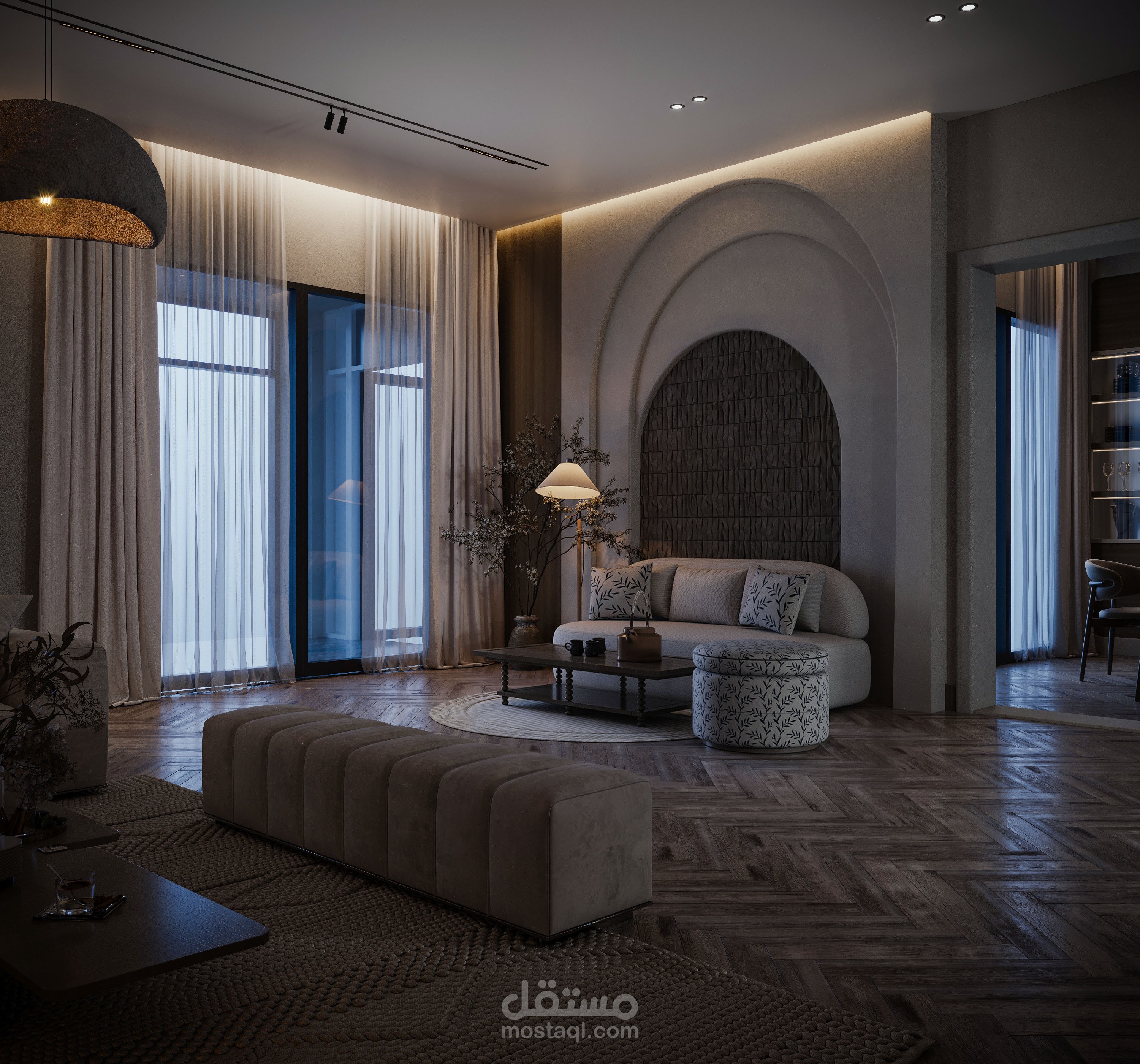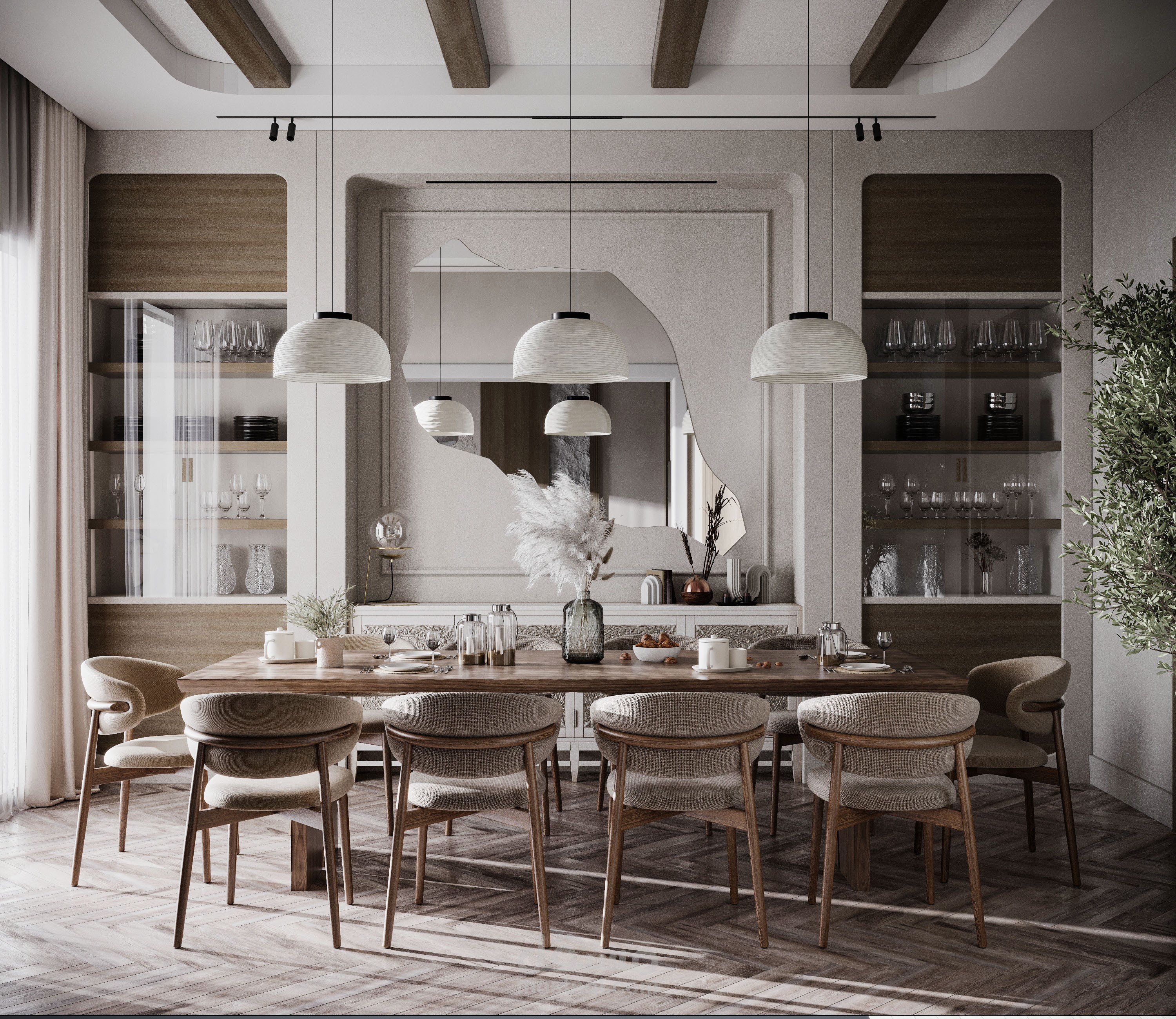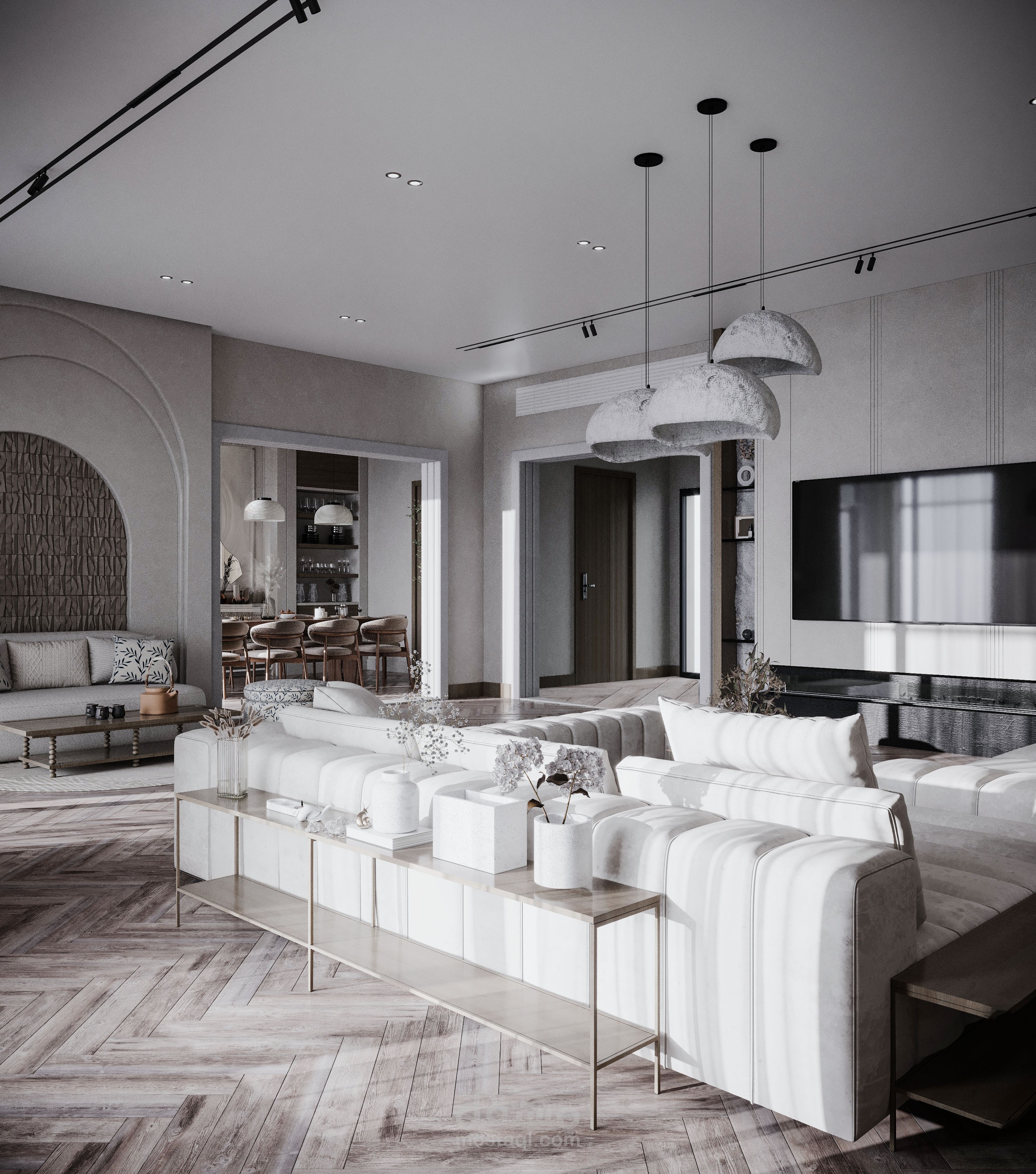 تصميم صالة استقبال مع صالة طعام بطراز وابي سابي.