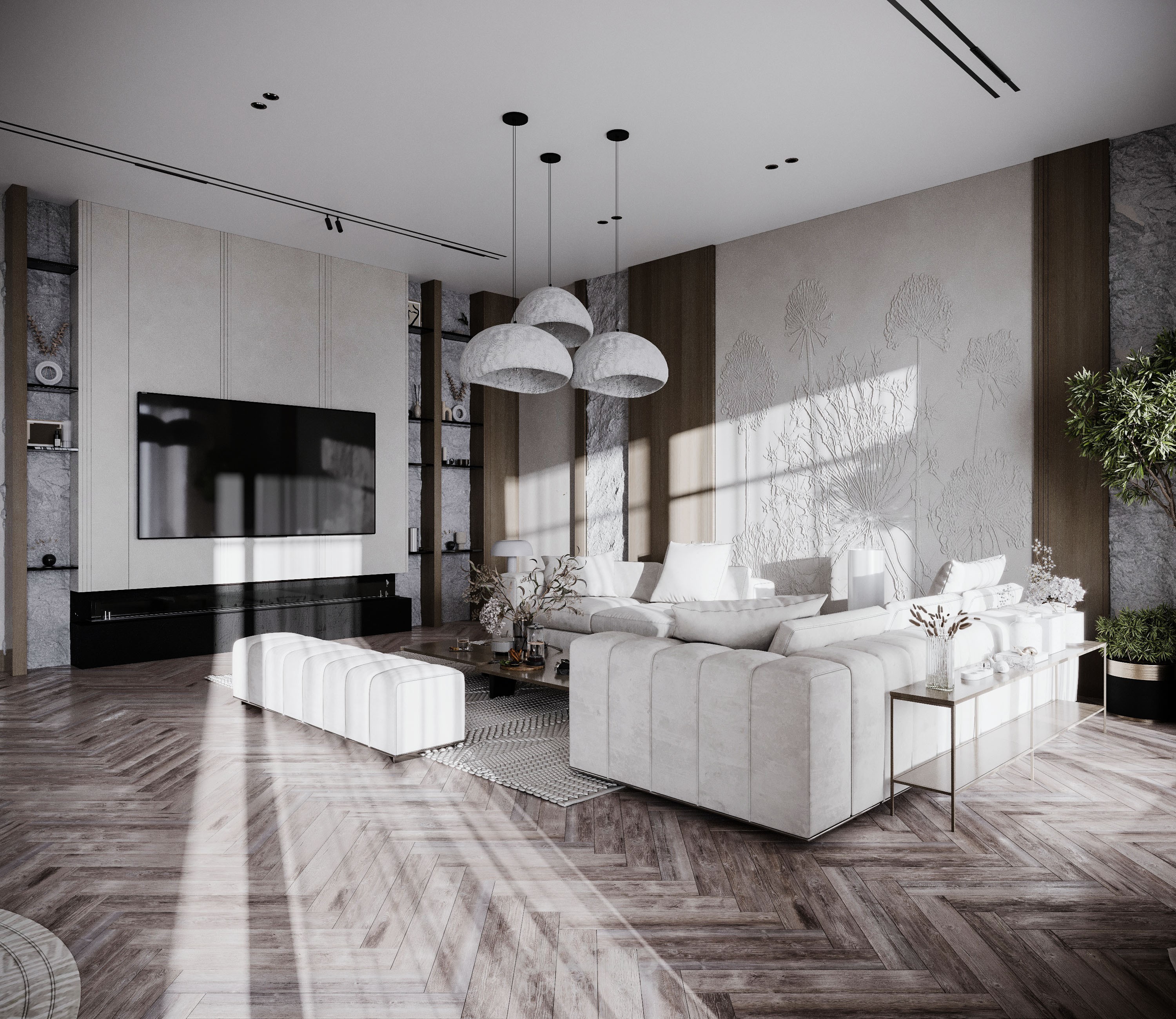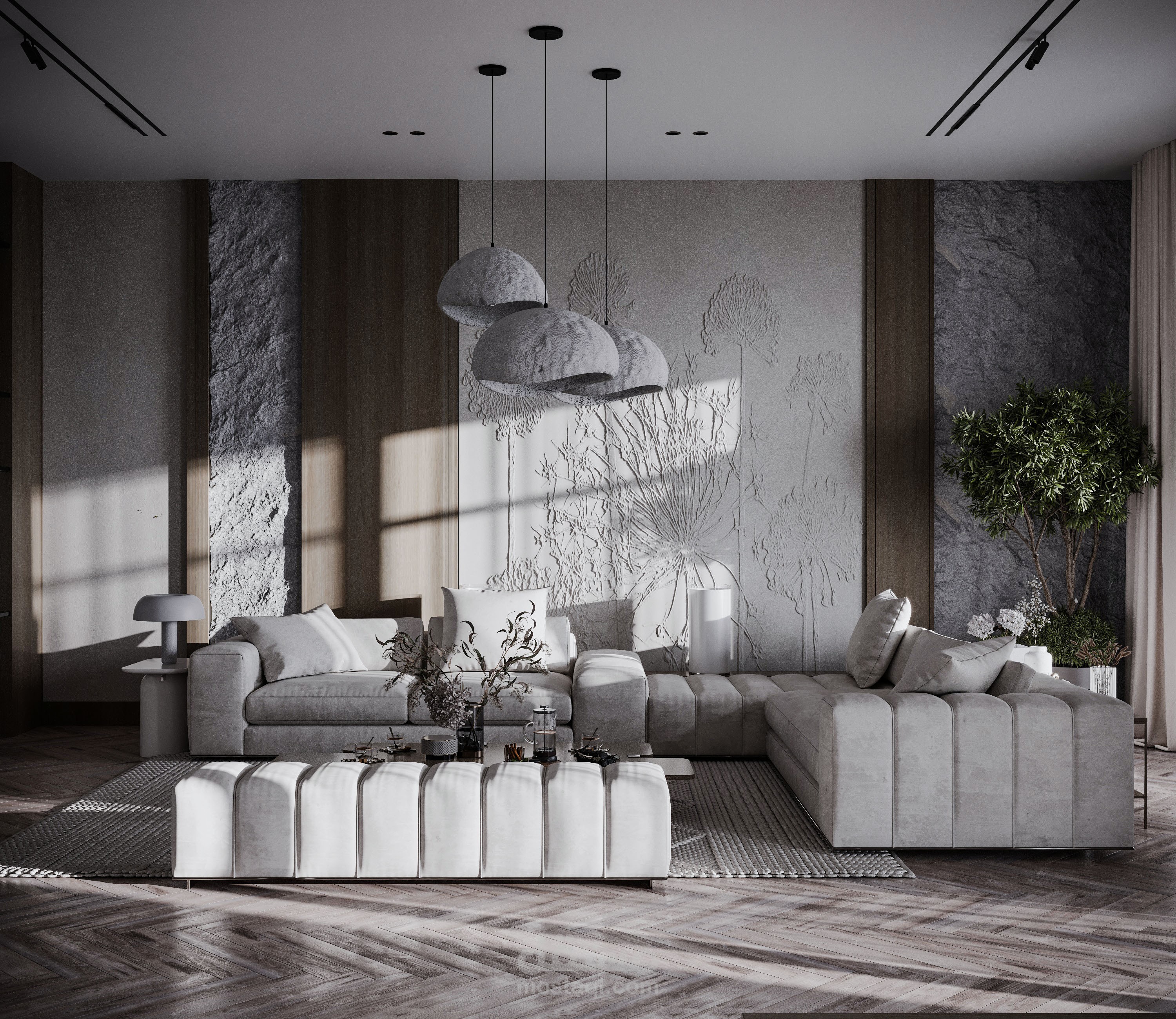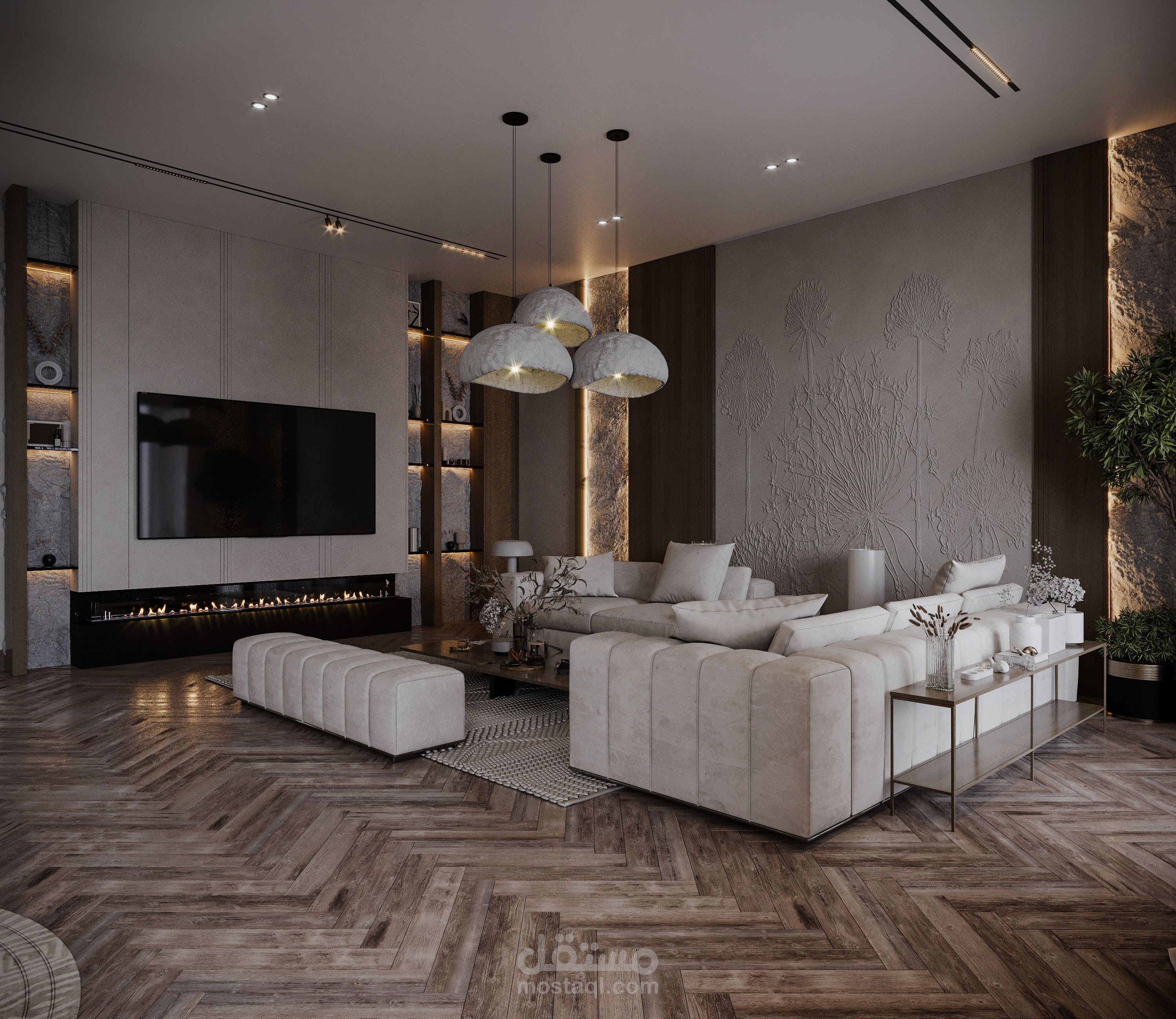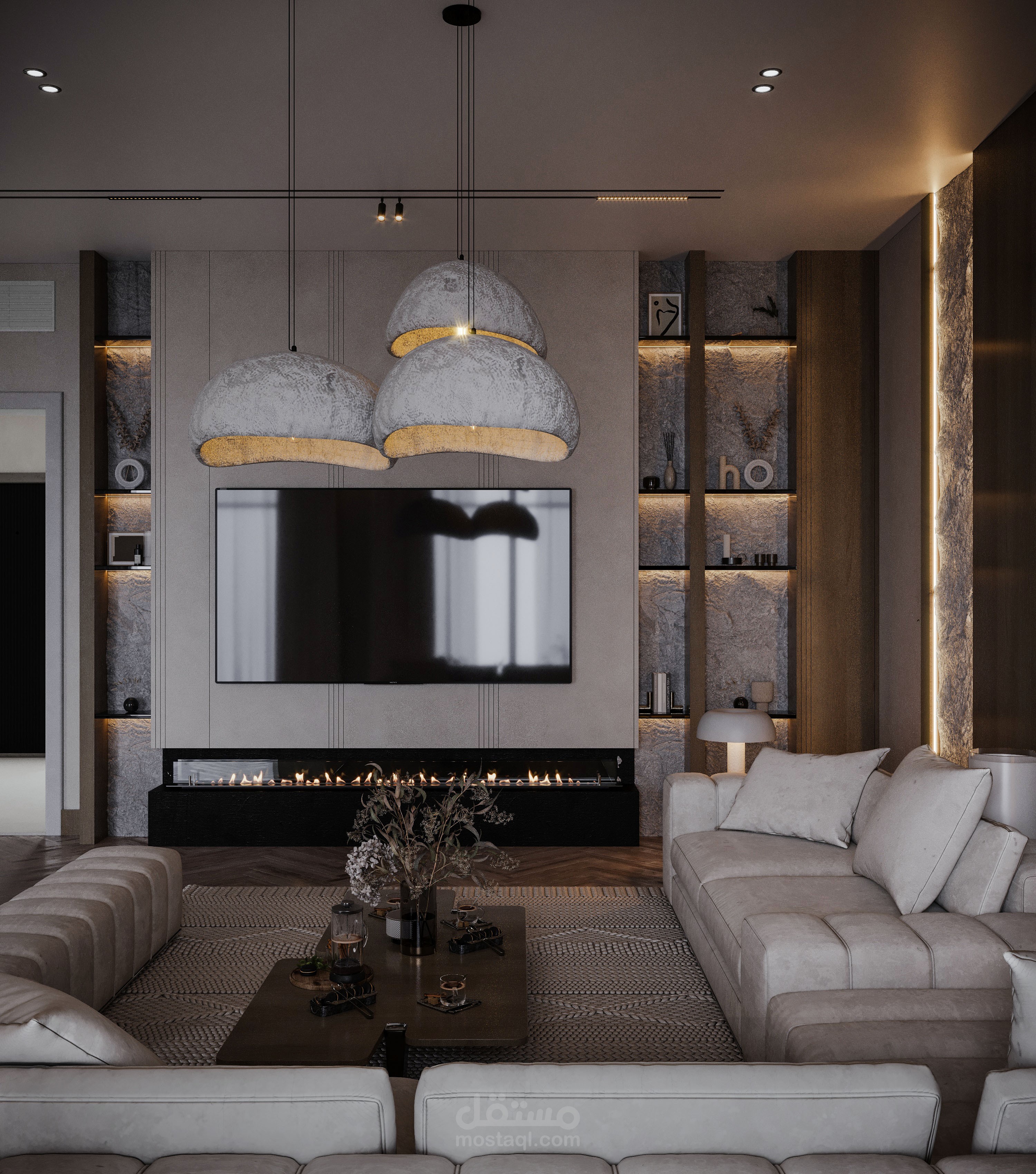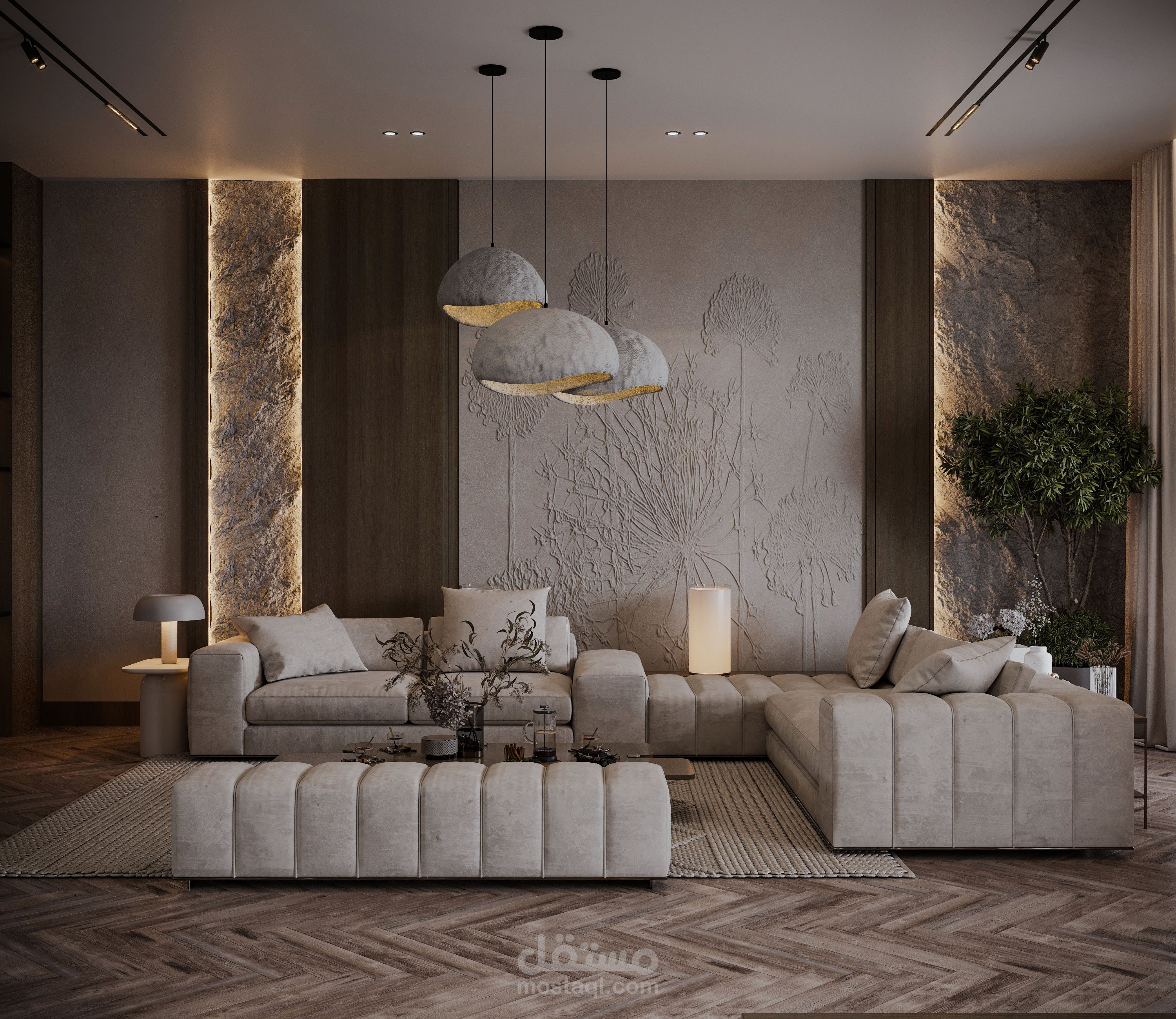 تصميم صالة استقبال مع صالة طعام بطراز وابي سابي.