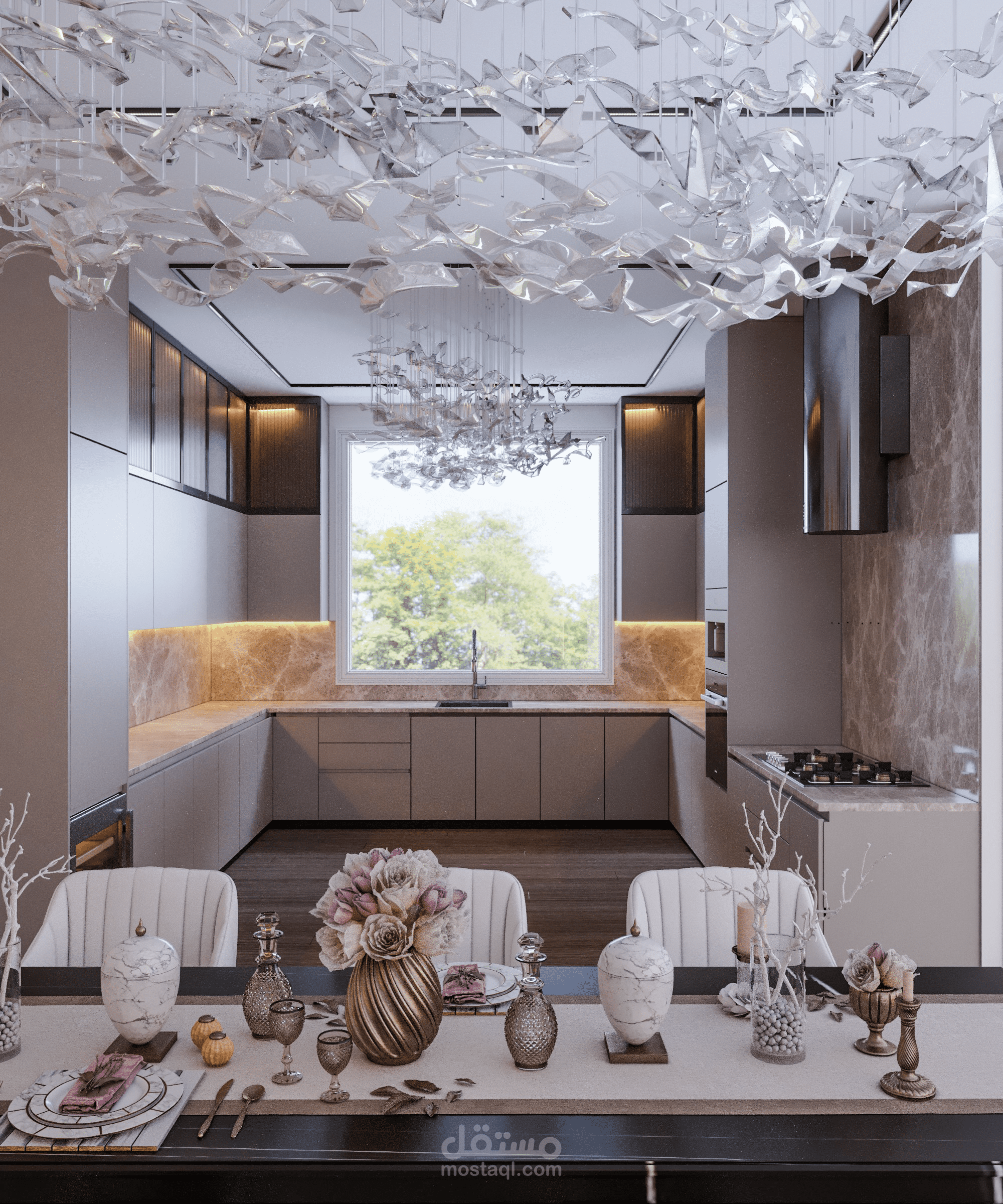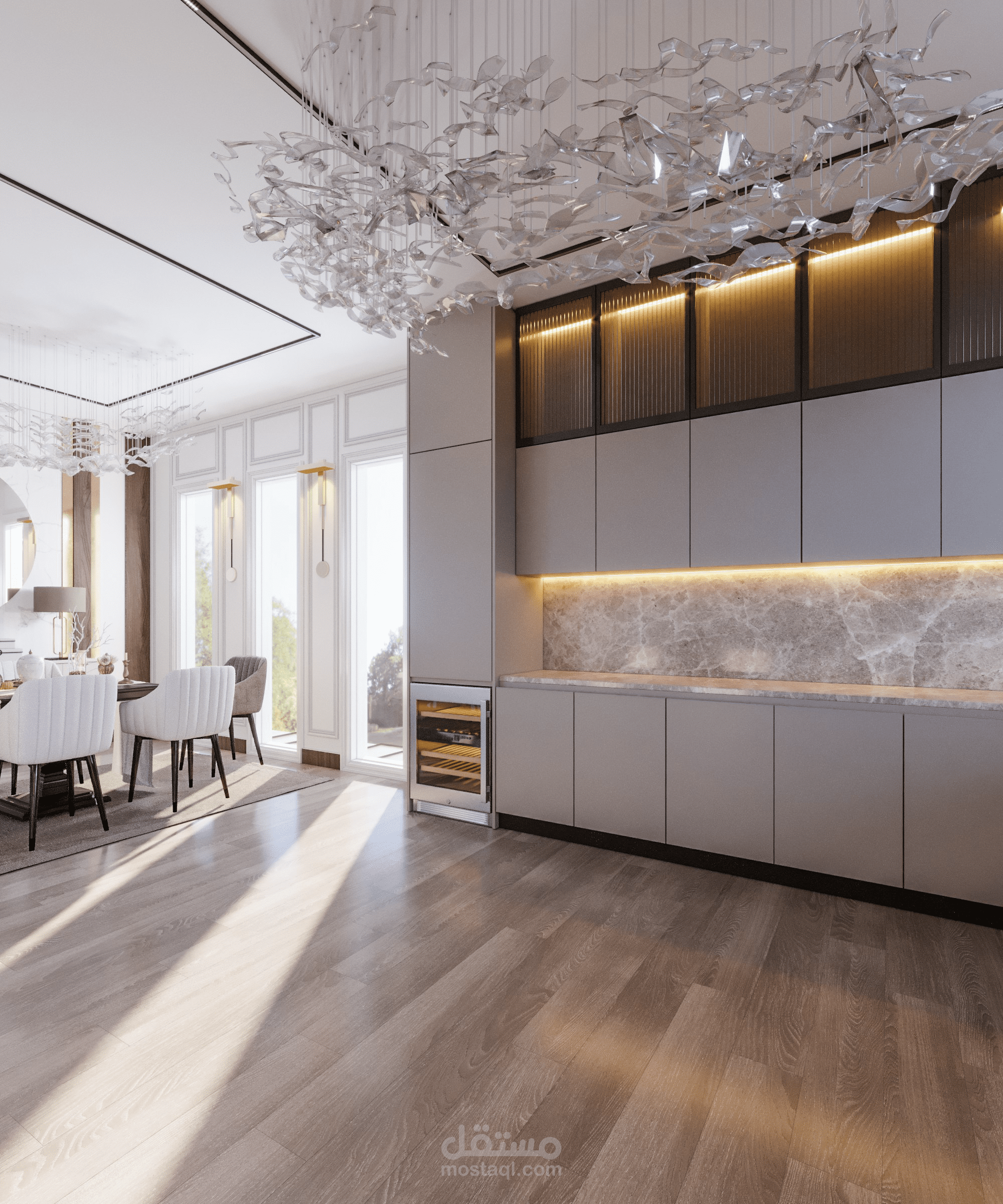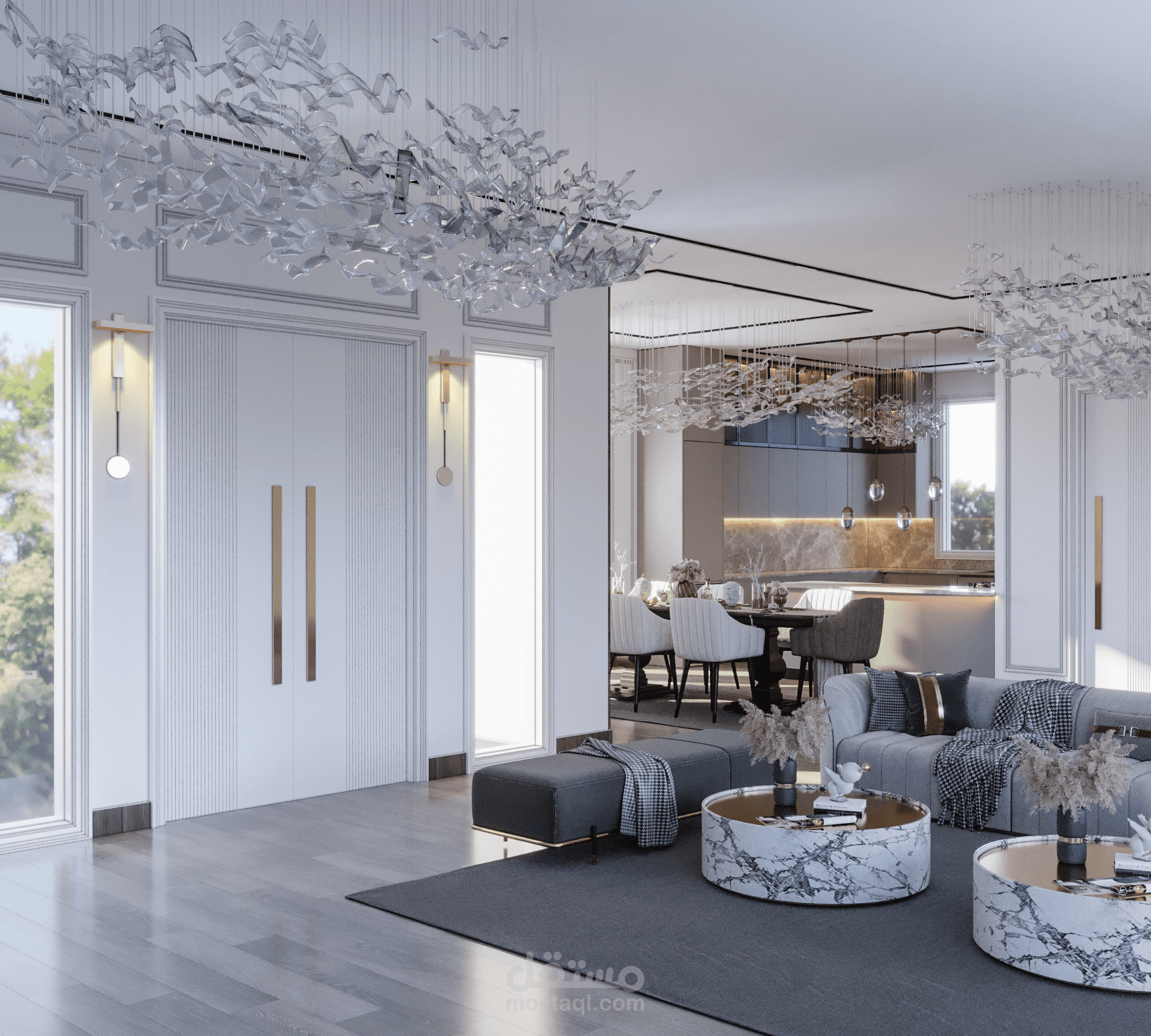 مطبخ اميركان مودرن مفتوح علي صالة استقبال.