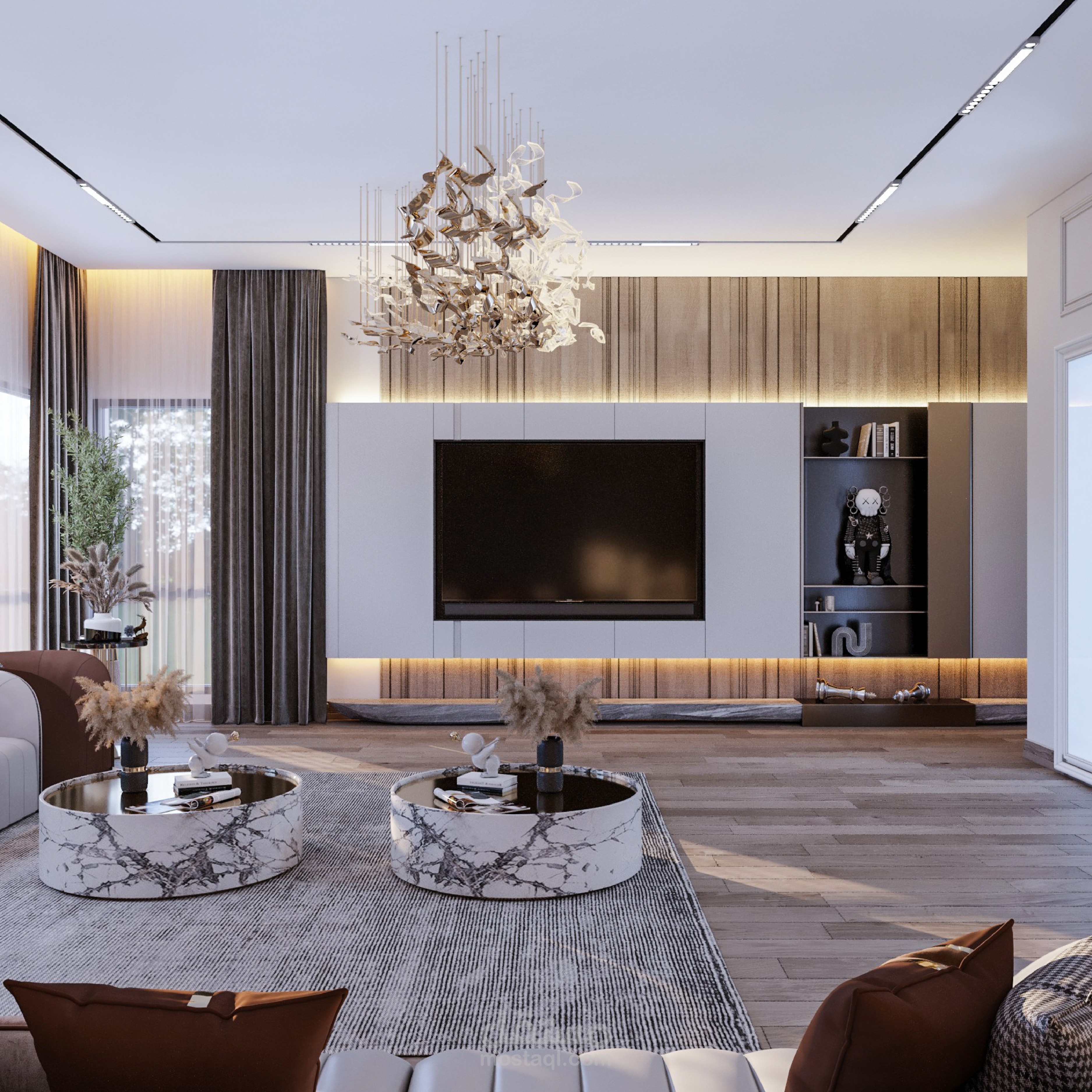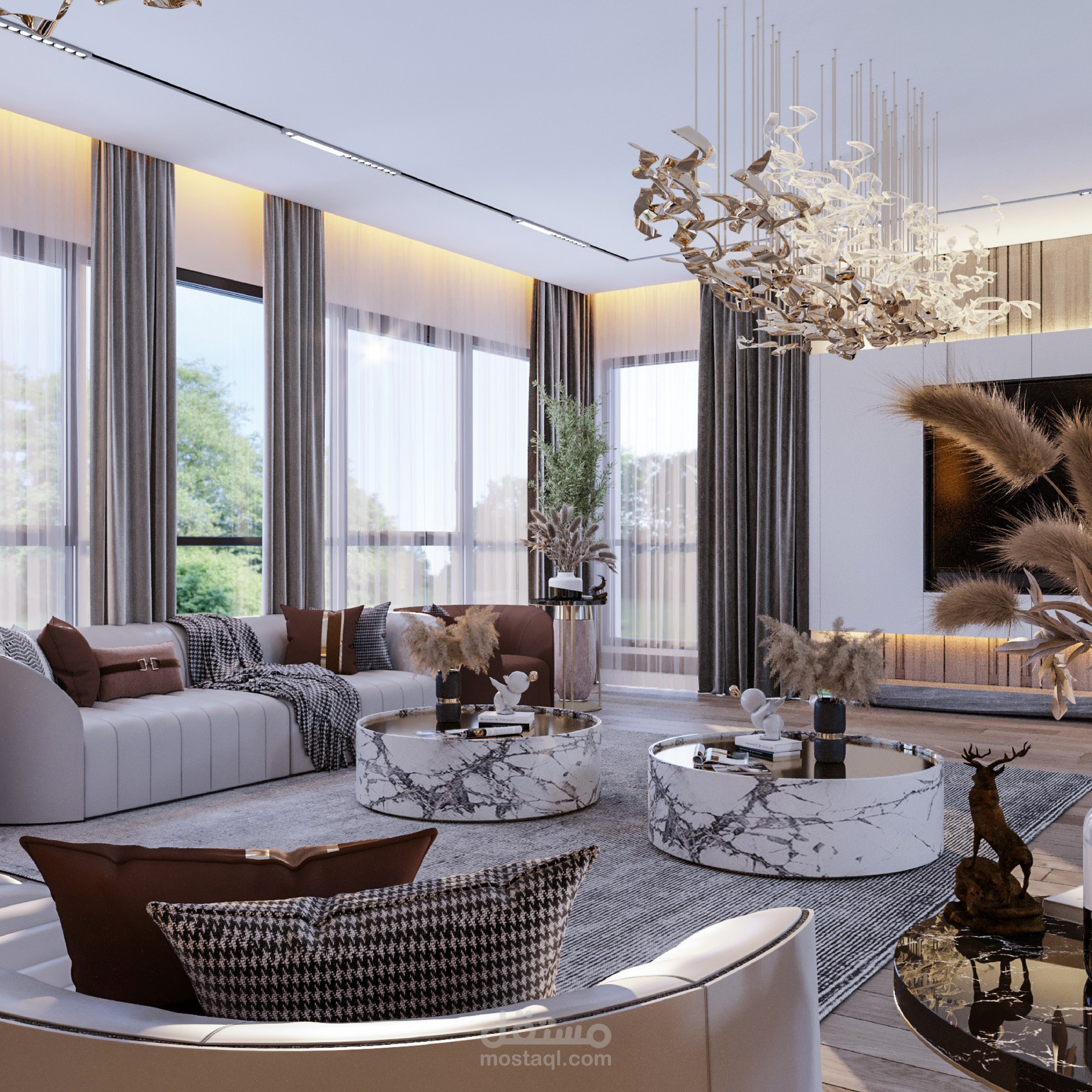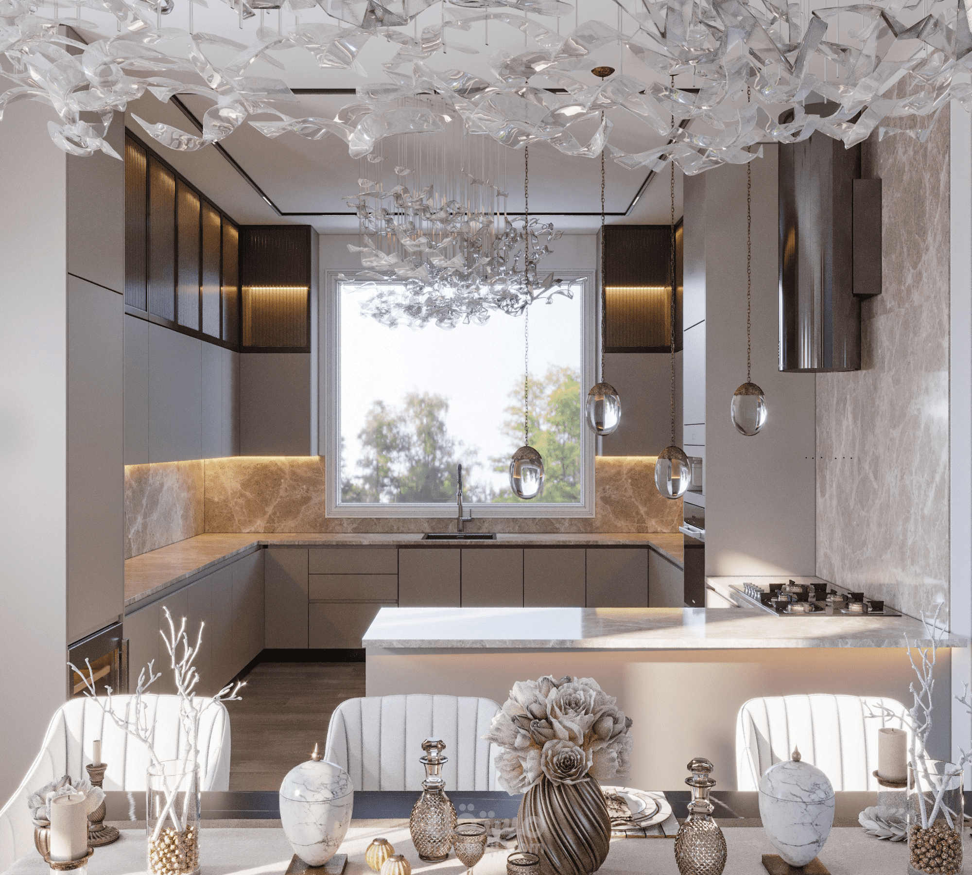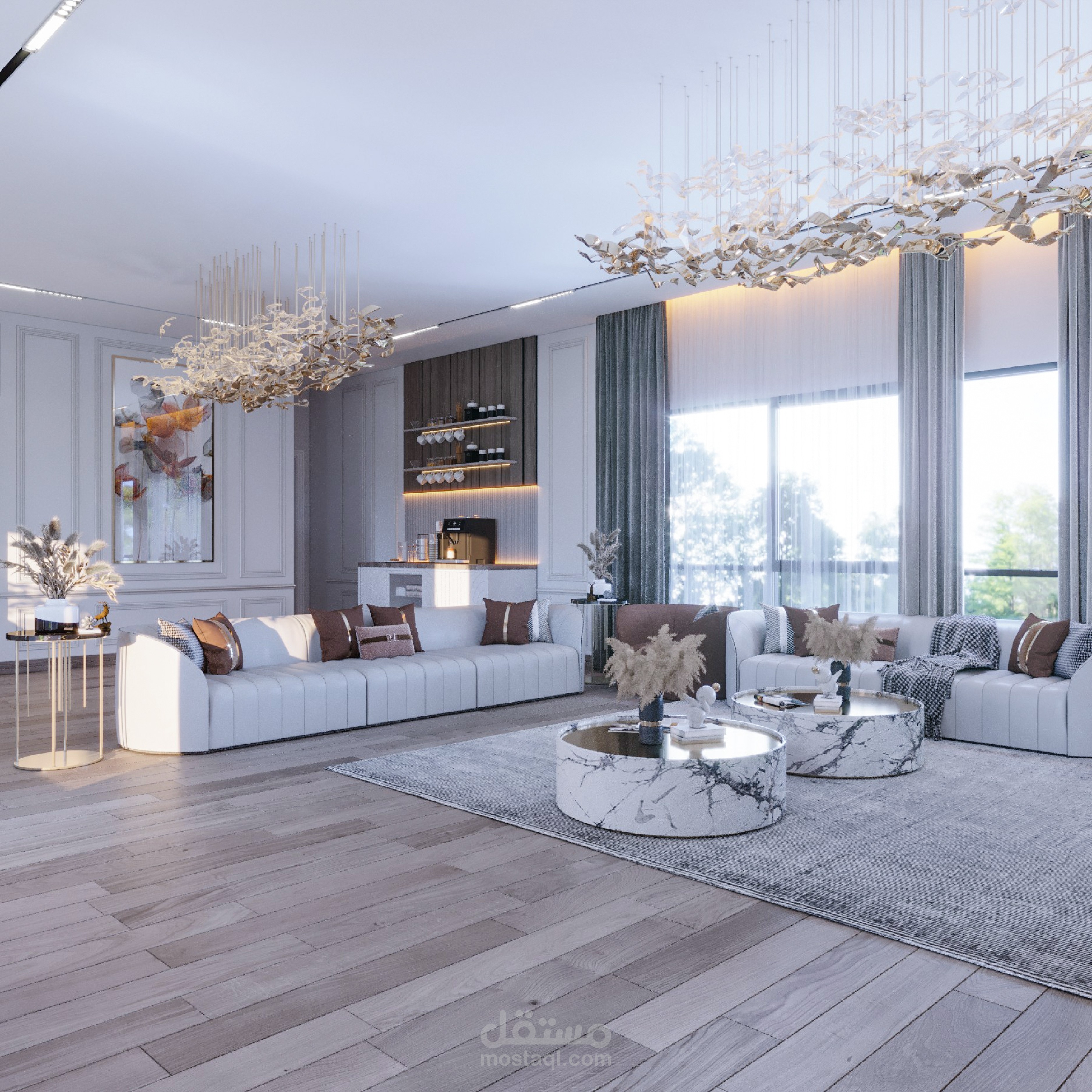 مطبخ اميركان مودرن مفتوح علي صالة استقبال.
