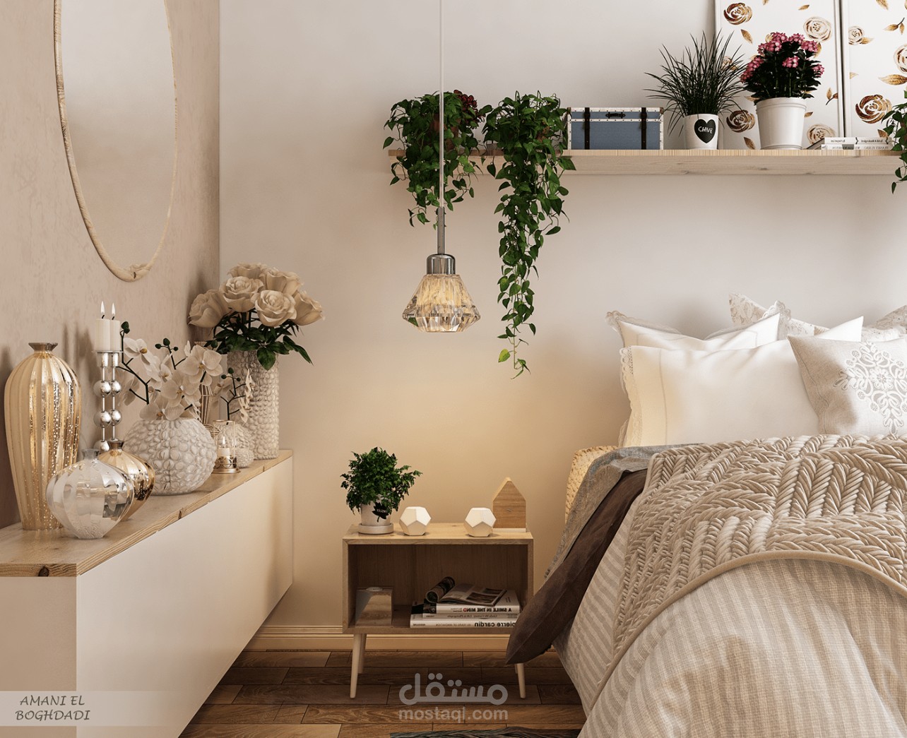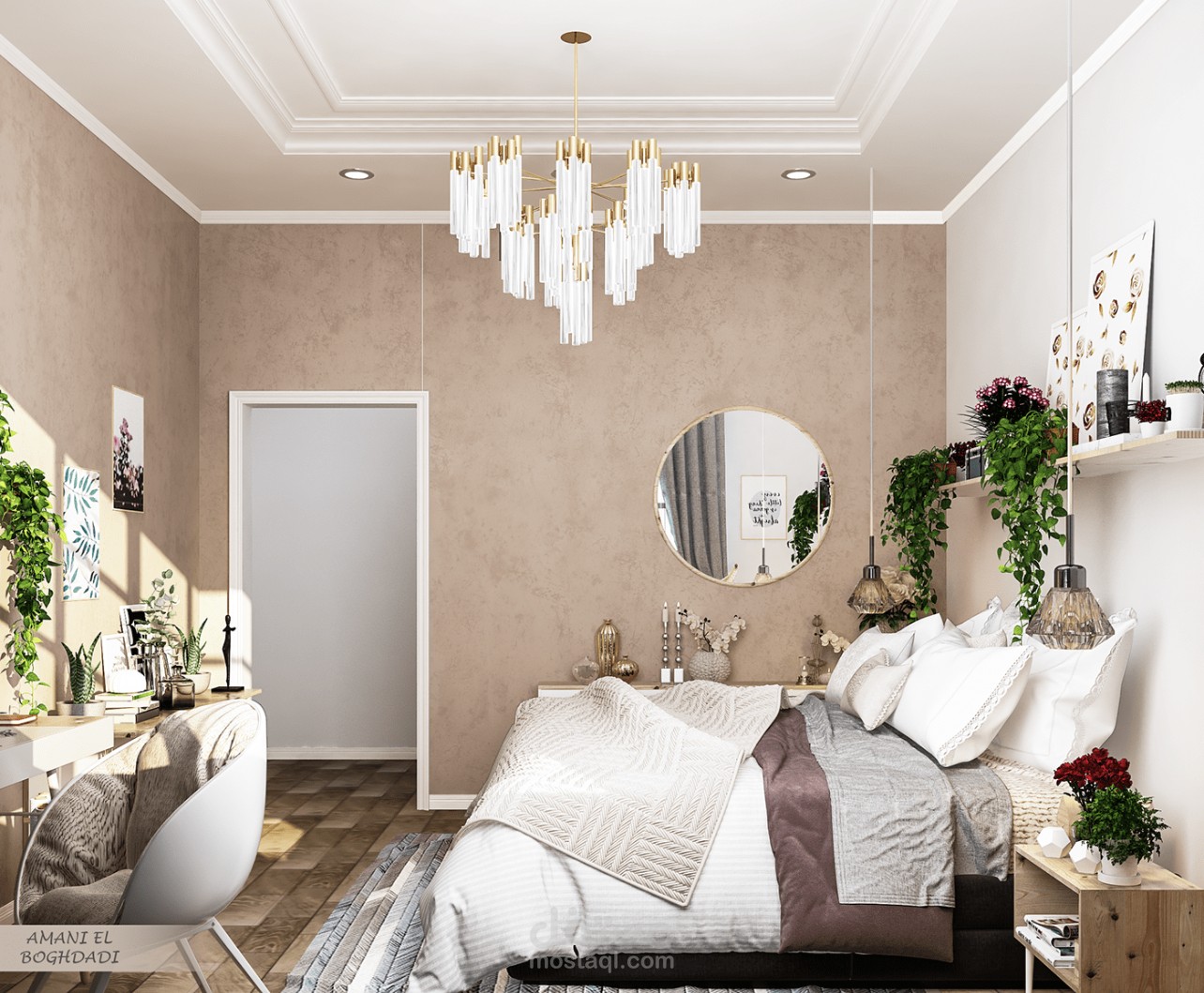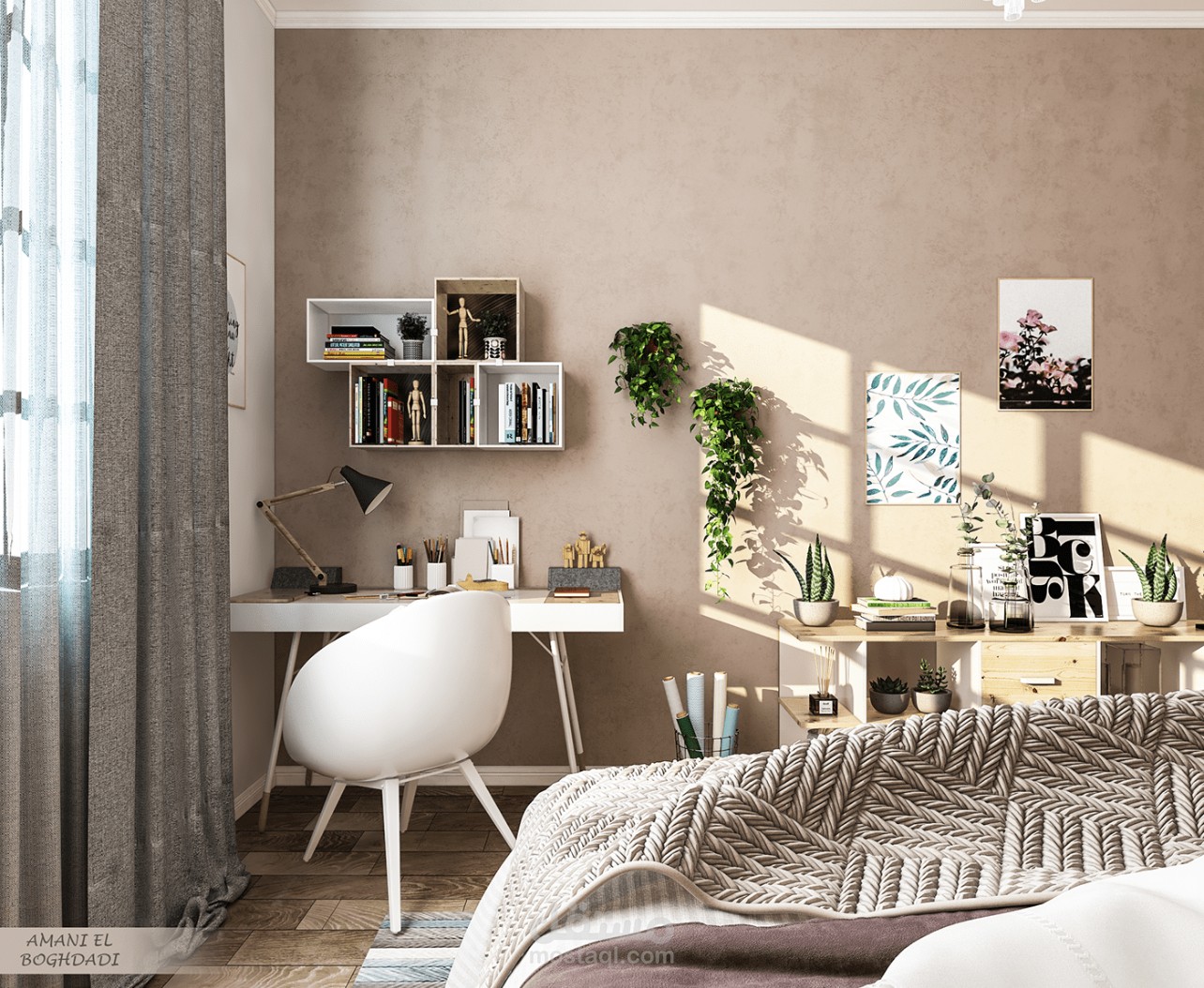 تصميم مودرن هادئ وناعم لغرفة نوم بناتيه.