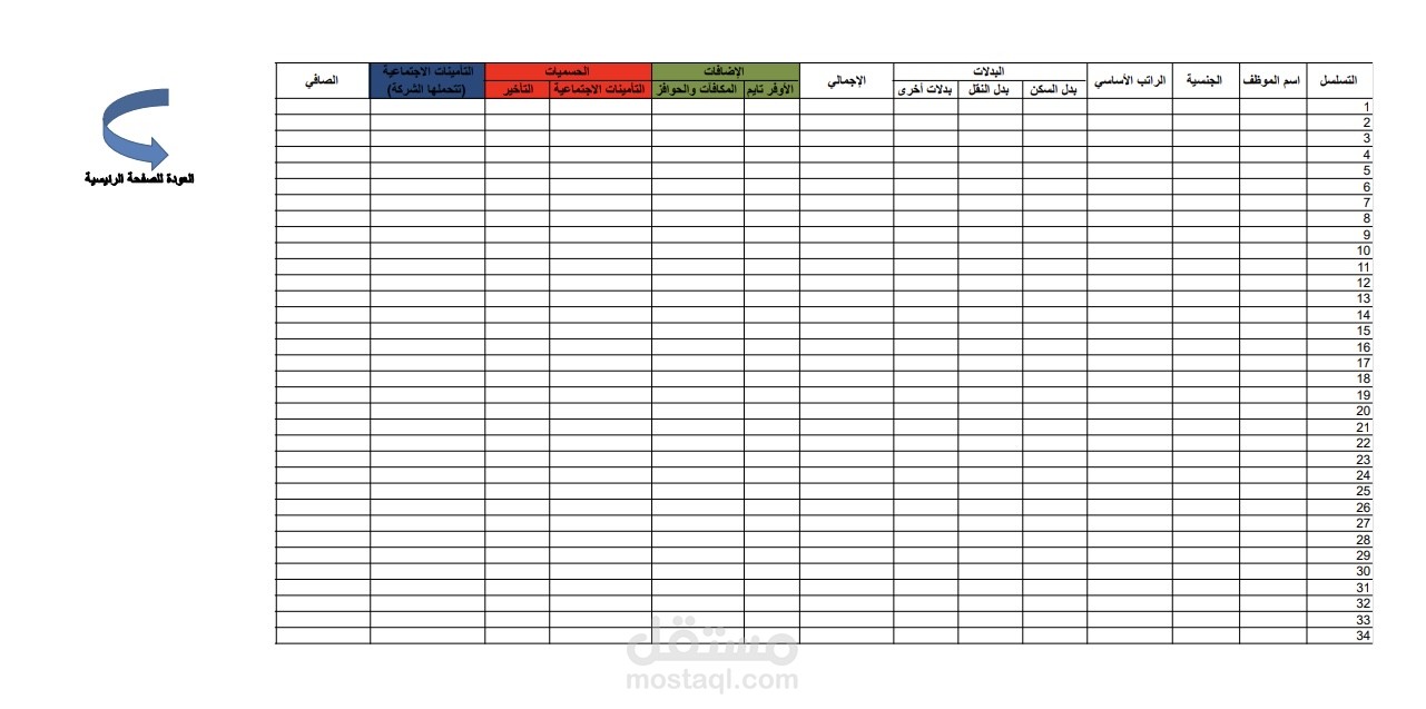 عمل مسير الرواتب للموظفين يتم اختيار الجنسية ويتم الحساب تلقائي لخصم التأمينات اللتي يتحملها الموظف والشركة حتى وصولًا للصافي