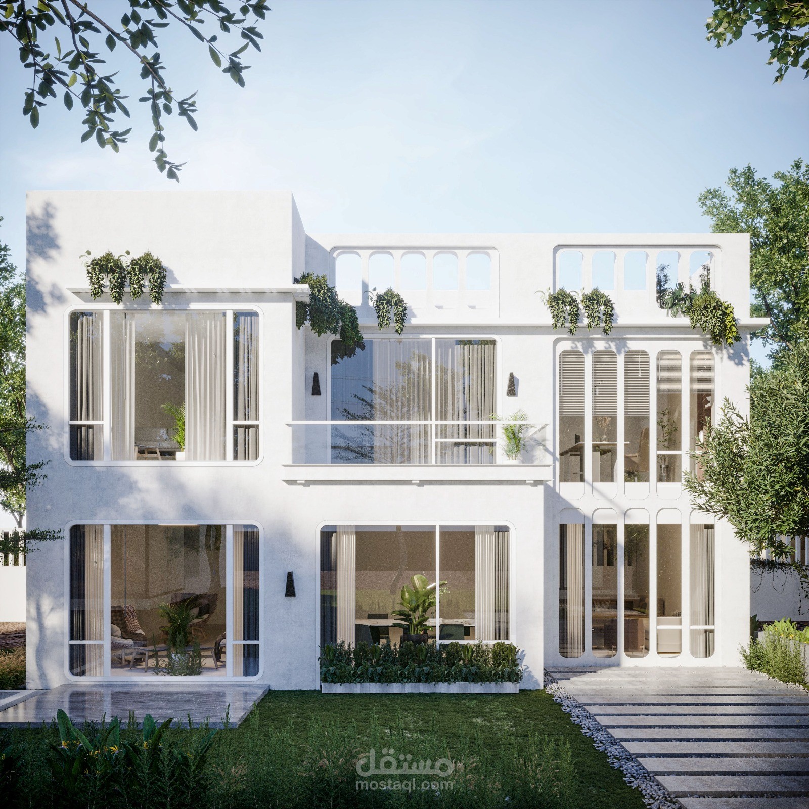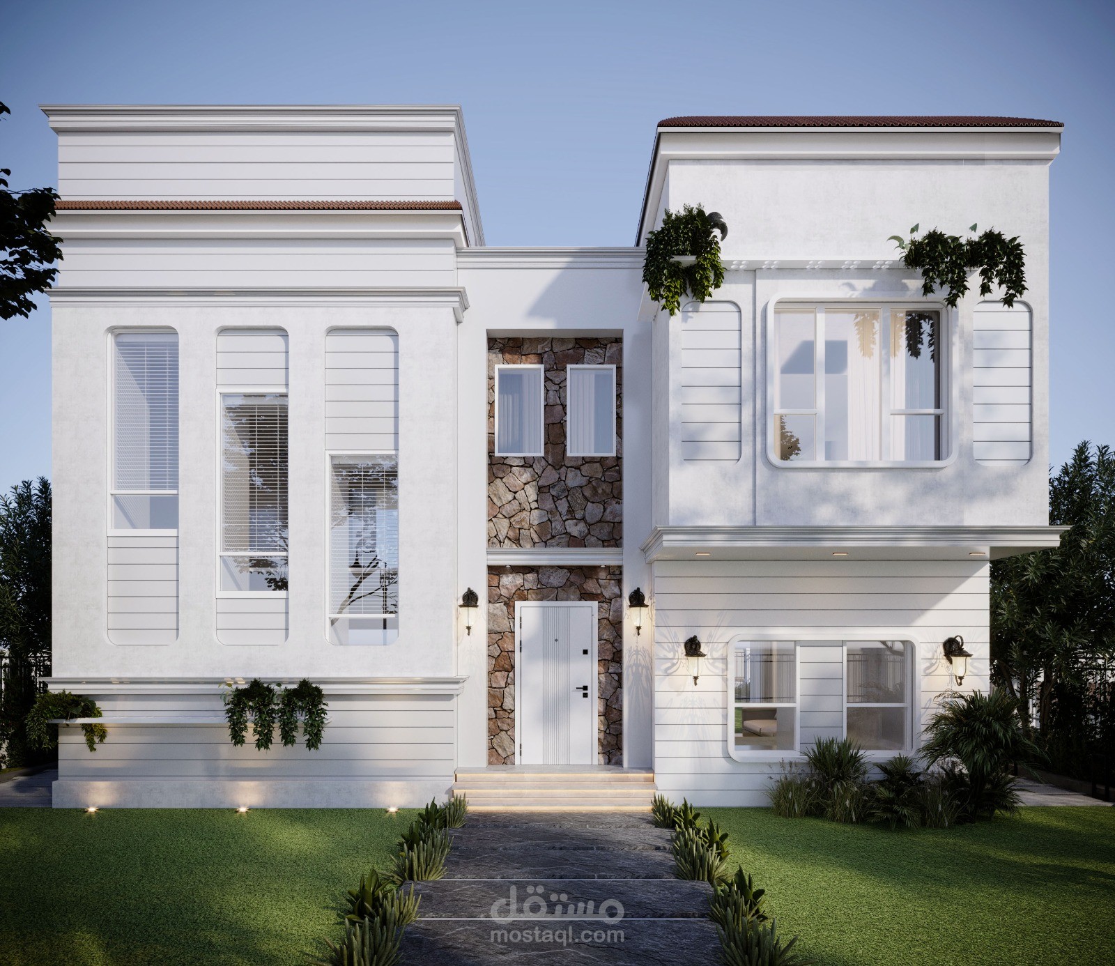تصميم ڤيلا لها واجهتين بطراز الارت ديكو. مع مراعاة فتحات الشبابيك الموجودة بالفعل.