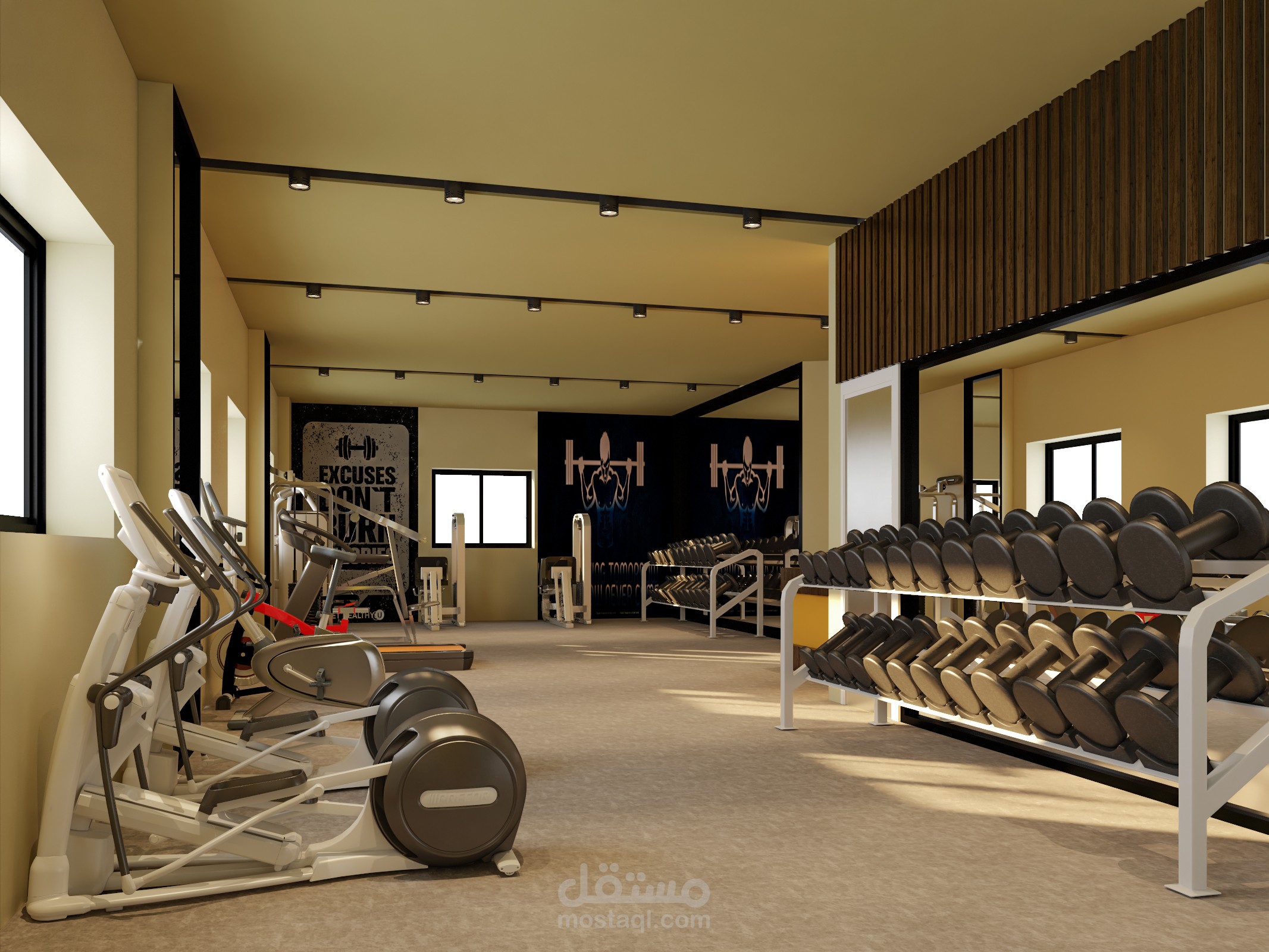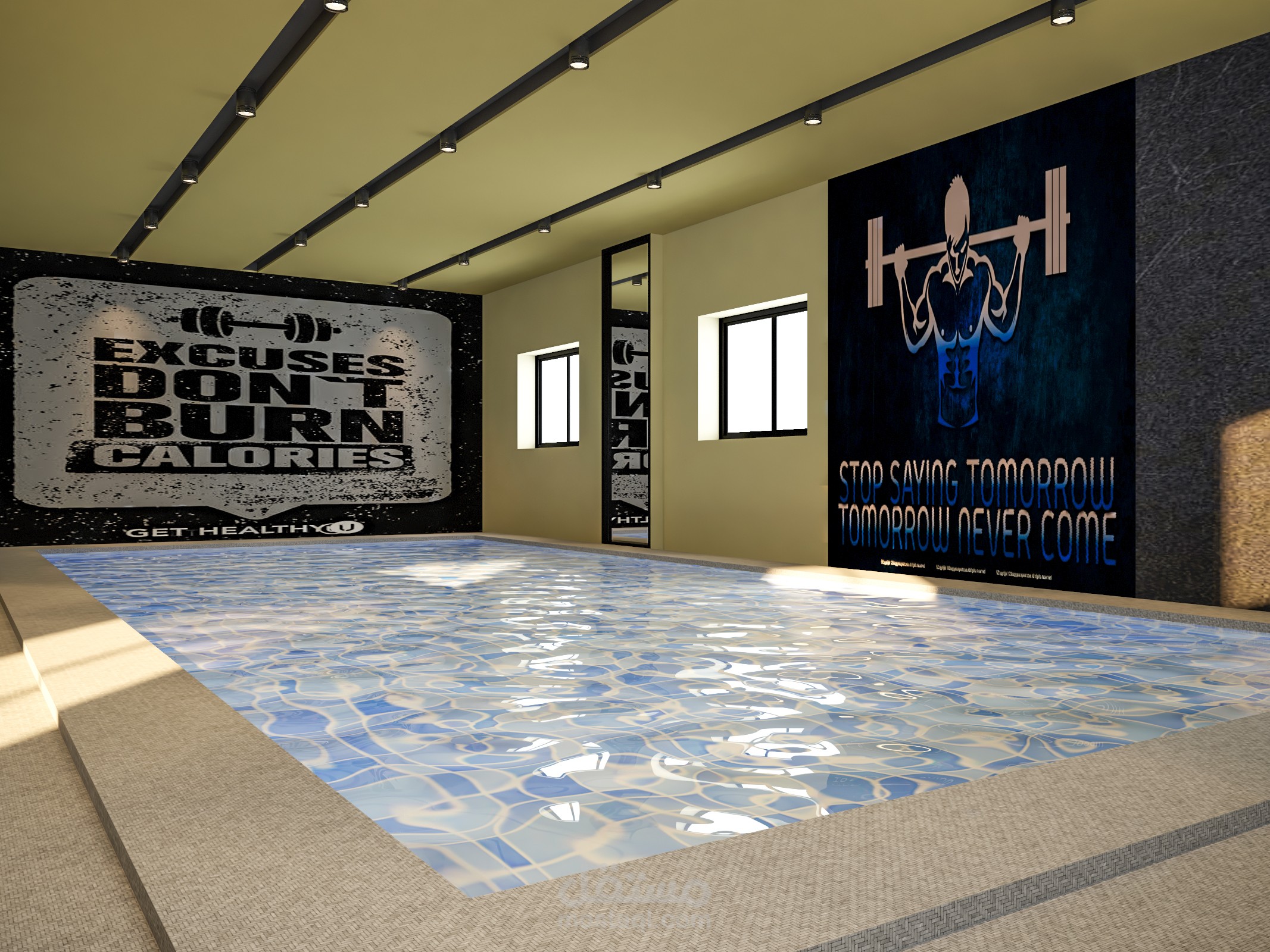 تصميم نادي رياضي مع منطقة صغيرة لمسبح داخل عمارة سكنية .
