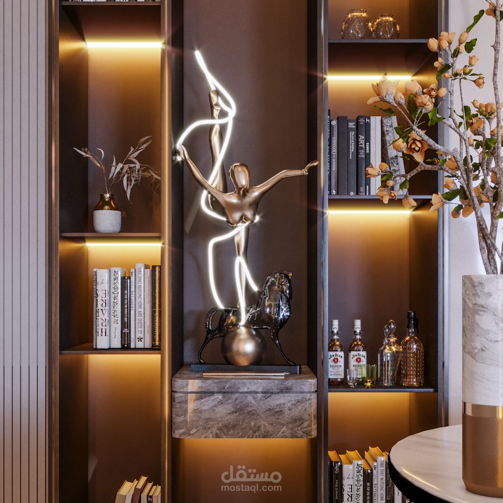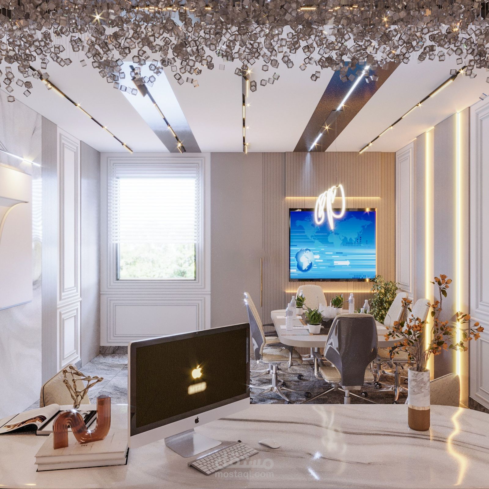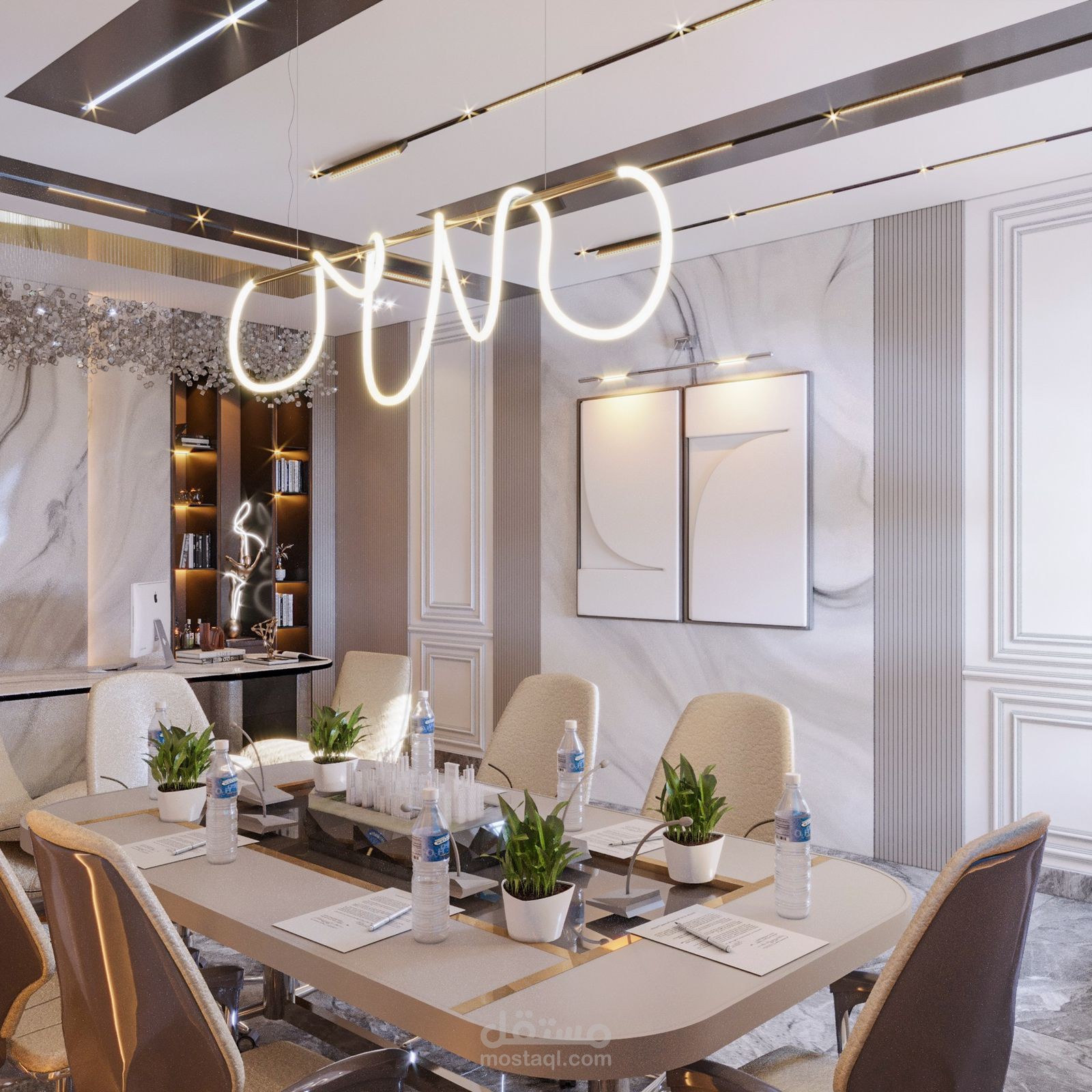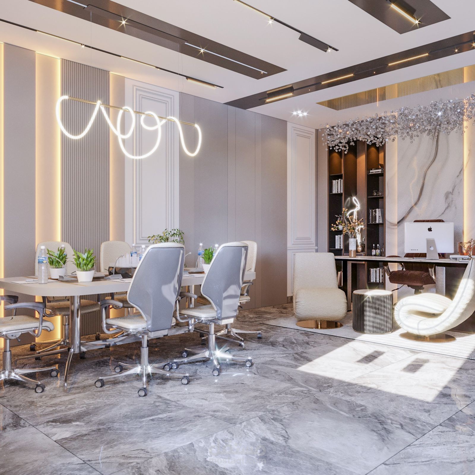 تصميم مودرن وفخم لمكتب مدير يحتوي علي طاولة اجتماعات.