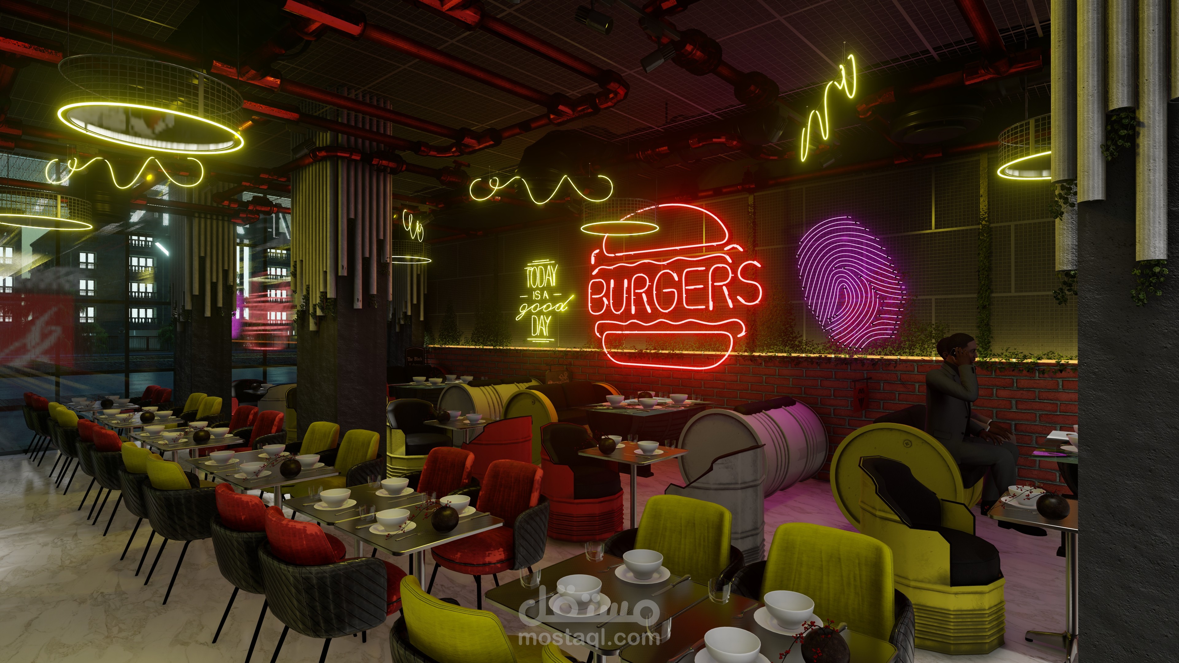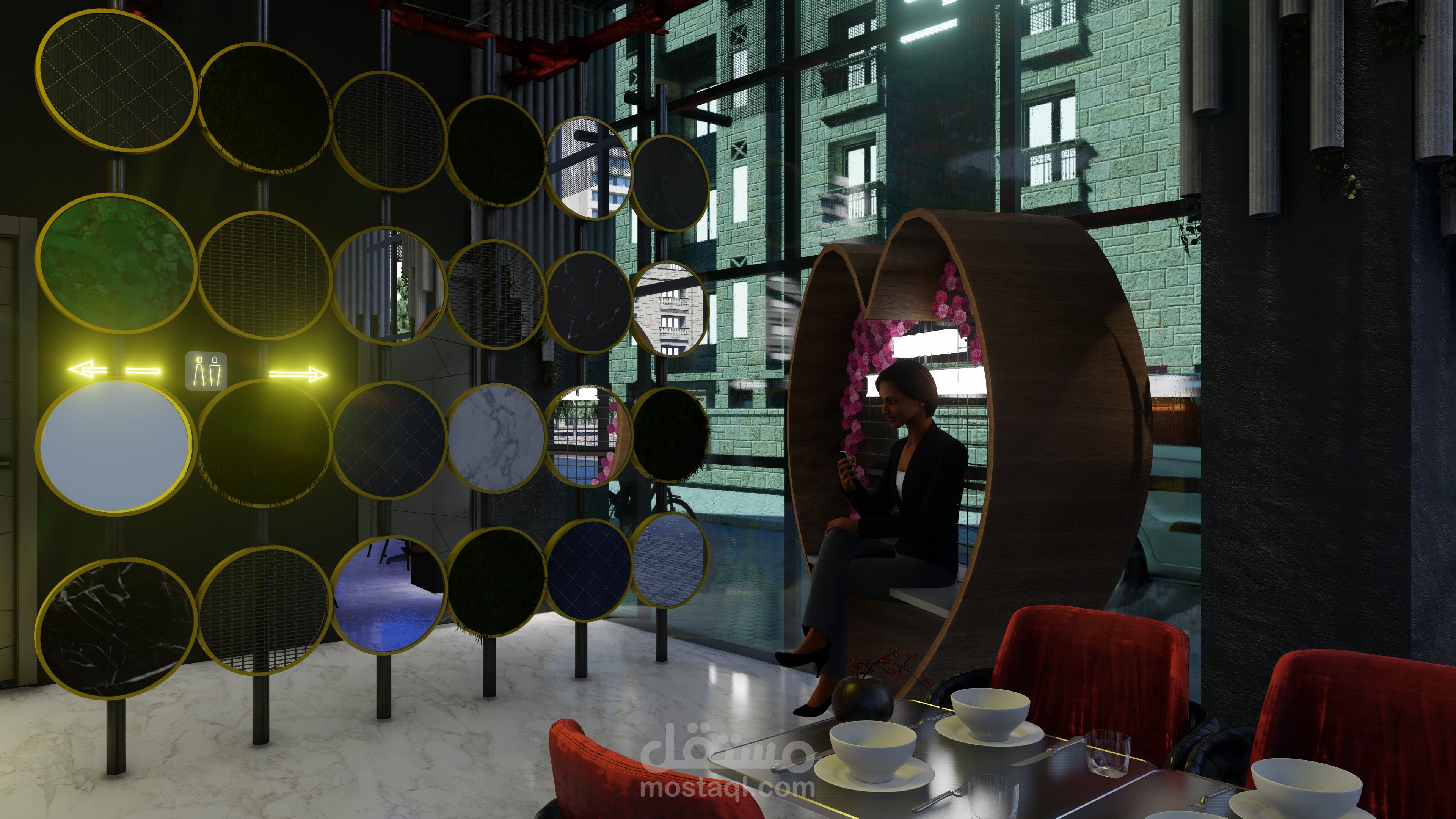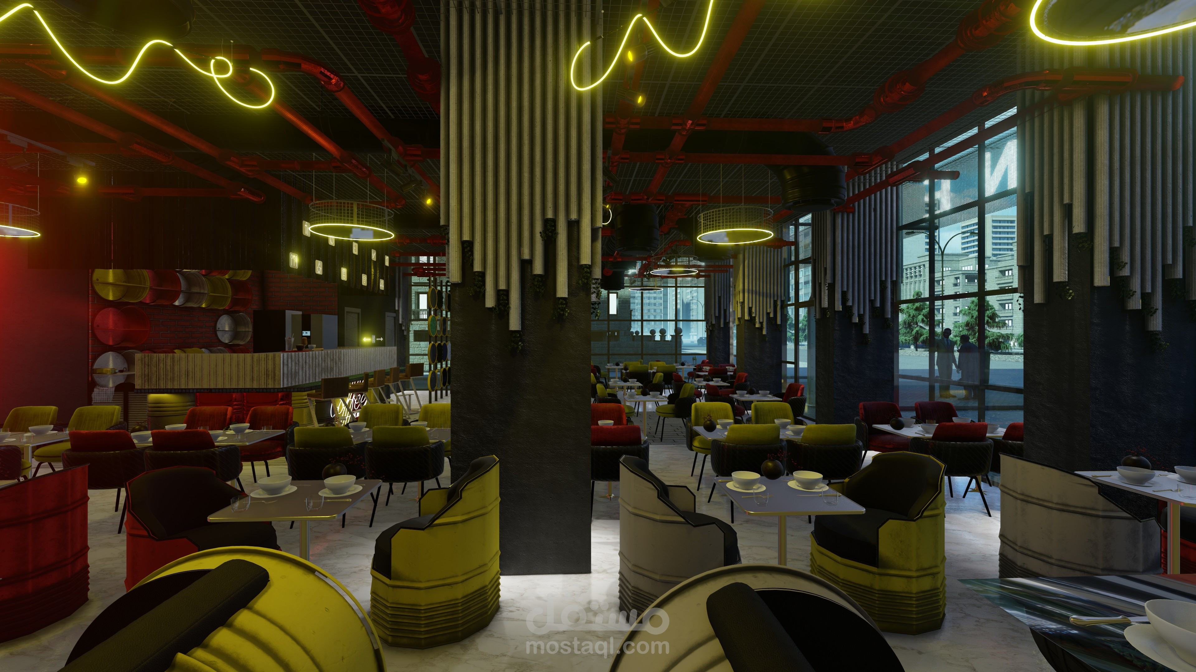 تم وضع البراميل في تكوين البار والكراسي والكراسي الثنائية والطاولات ,المغاسل