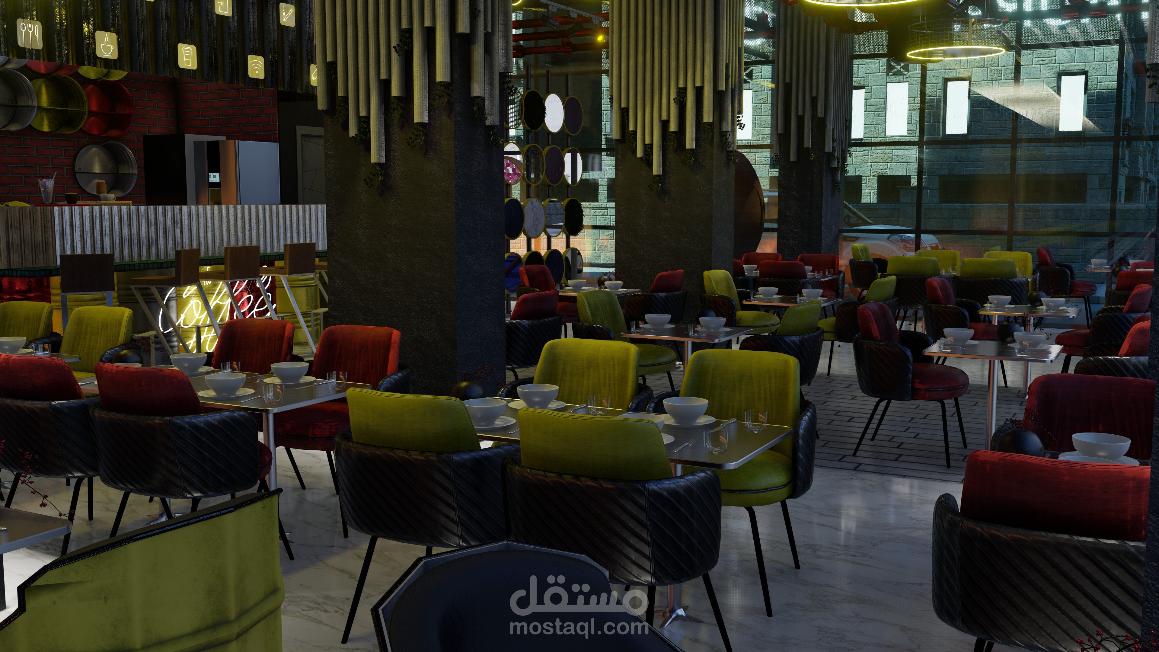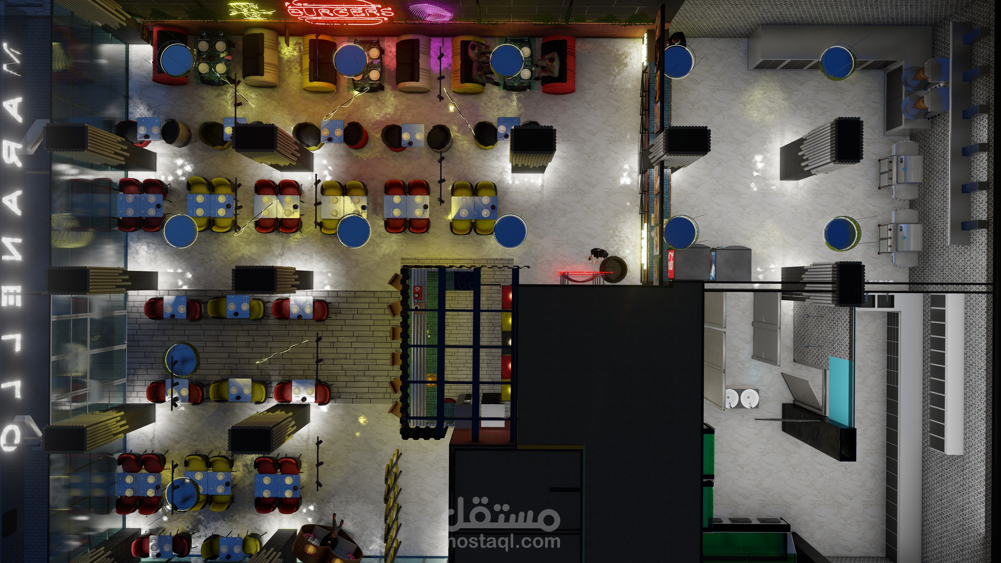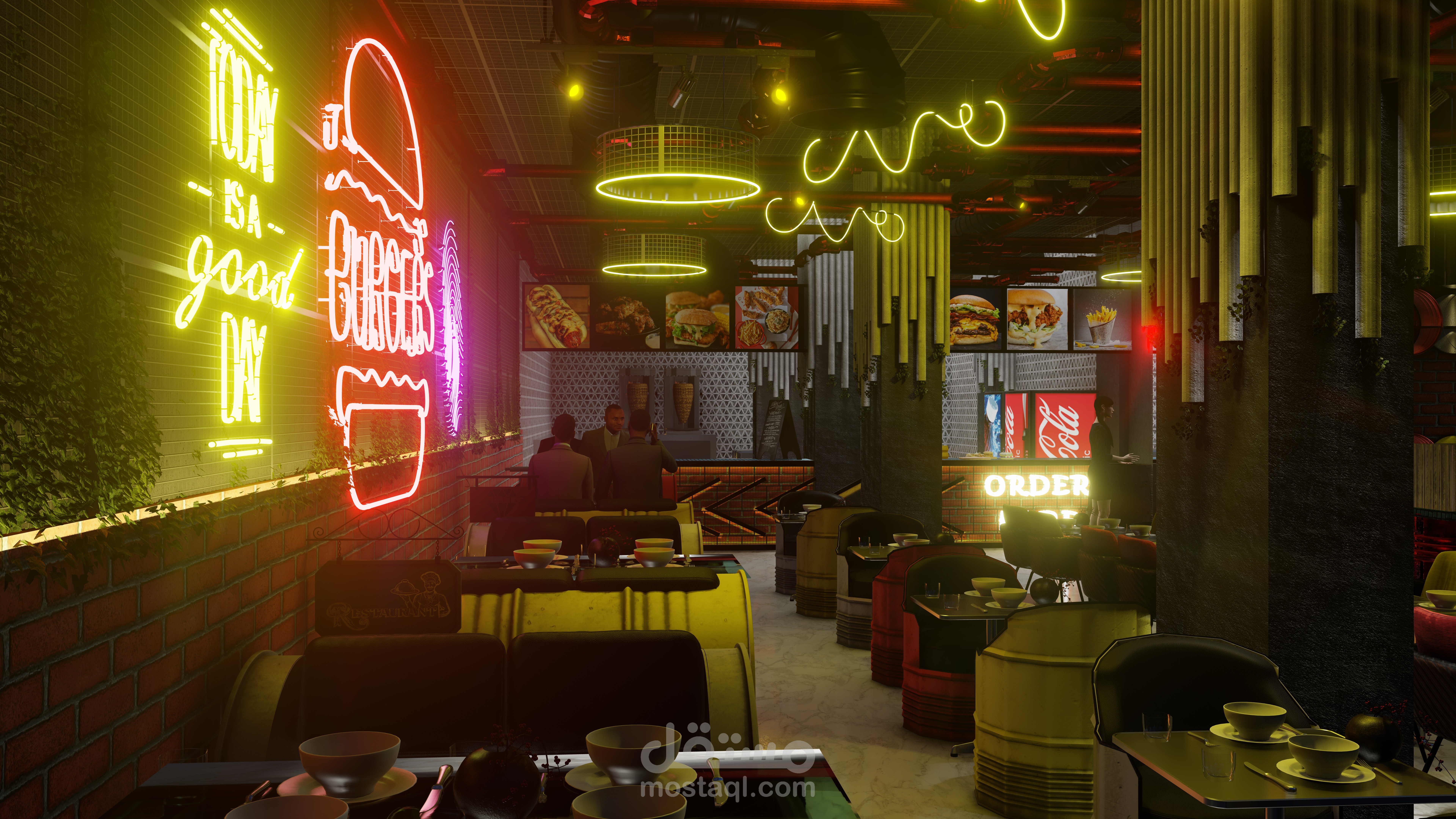 تم وضع البراميل في تكوين البار والكراسي والكراسي الثنائية والطاولات ,المغاسل