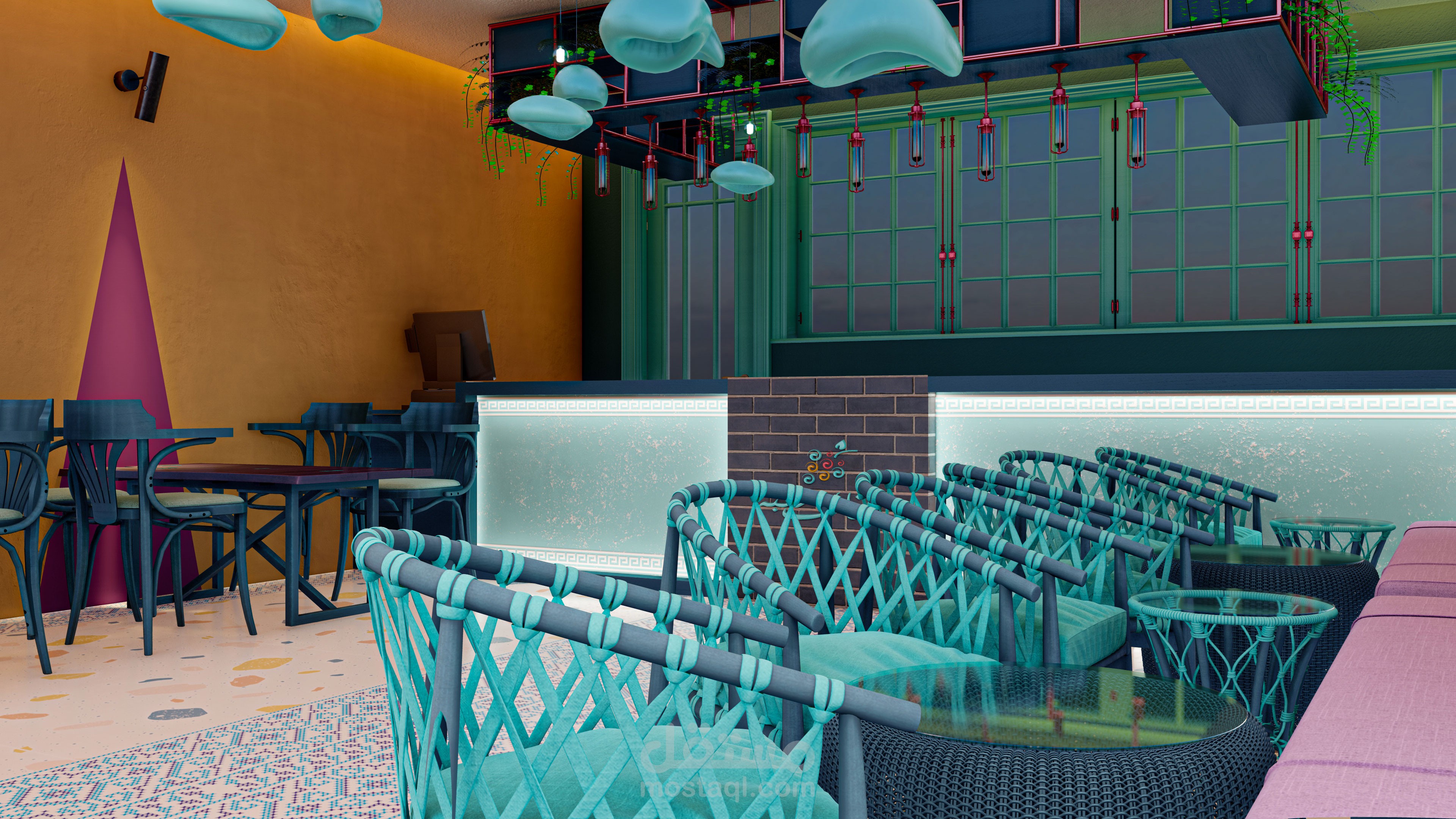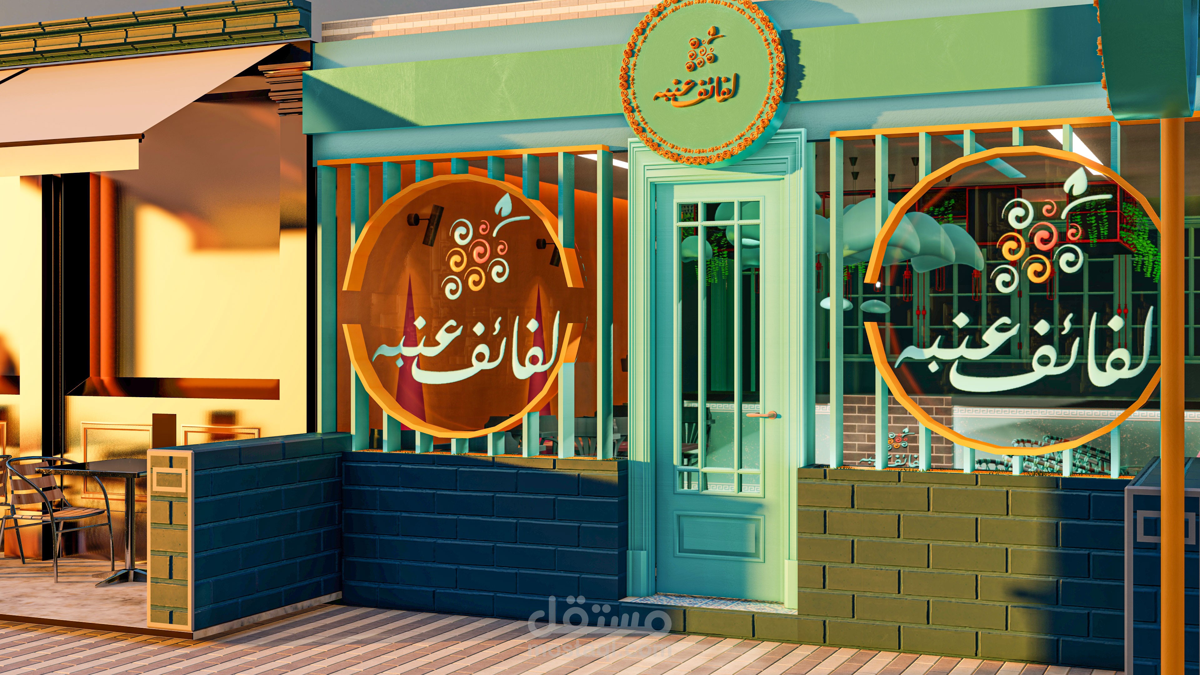 تم تصميم المطعم على الطراز اليوناني ، مع إضافة عدة ألوان ، في الهوية البصرية