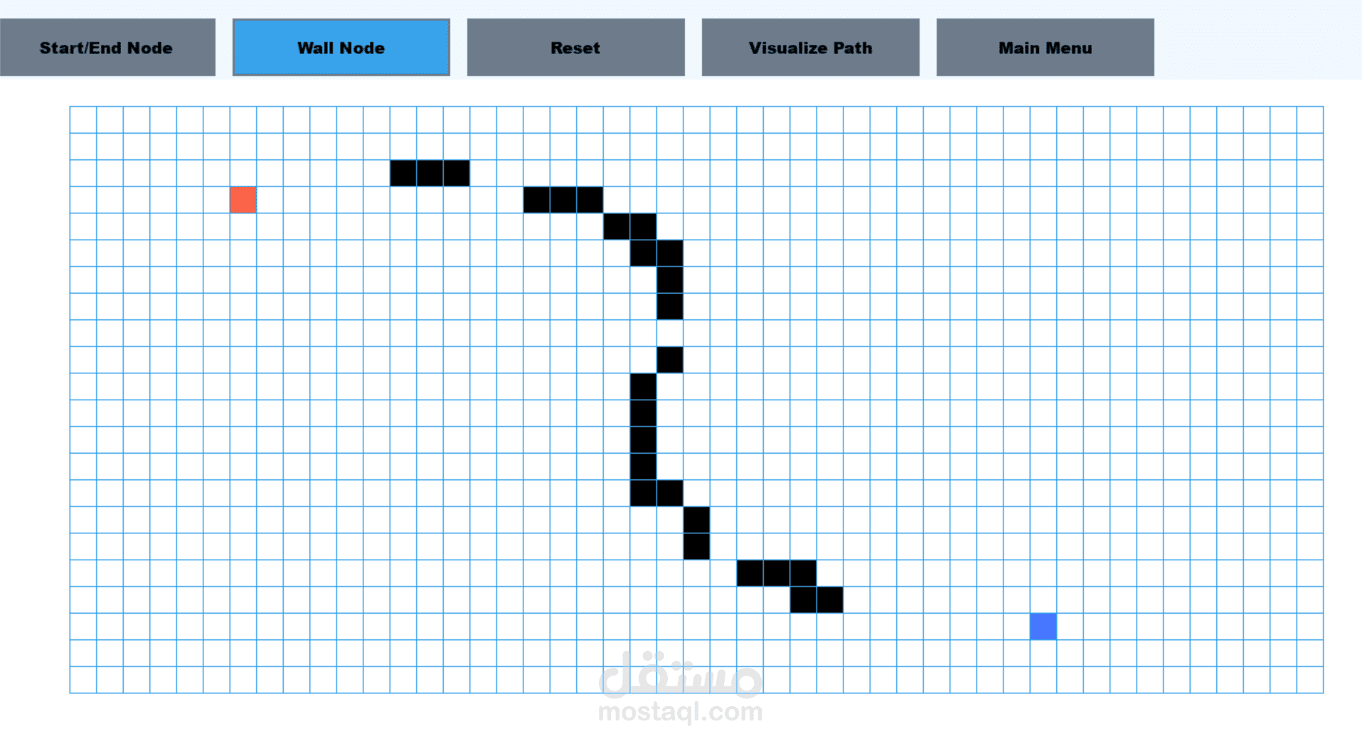 لعبة تجعل اللاعب يختار عقدة البداية والنهاية للمتاهة وعقد الحائط والخوارزمية من 4 خوارزميات سيتم تطبيقها لإيجاد المسار الصحيح