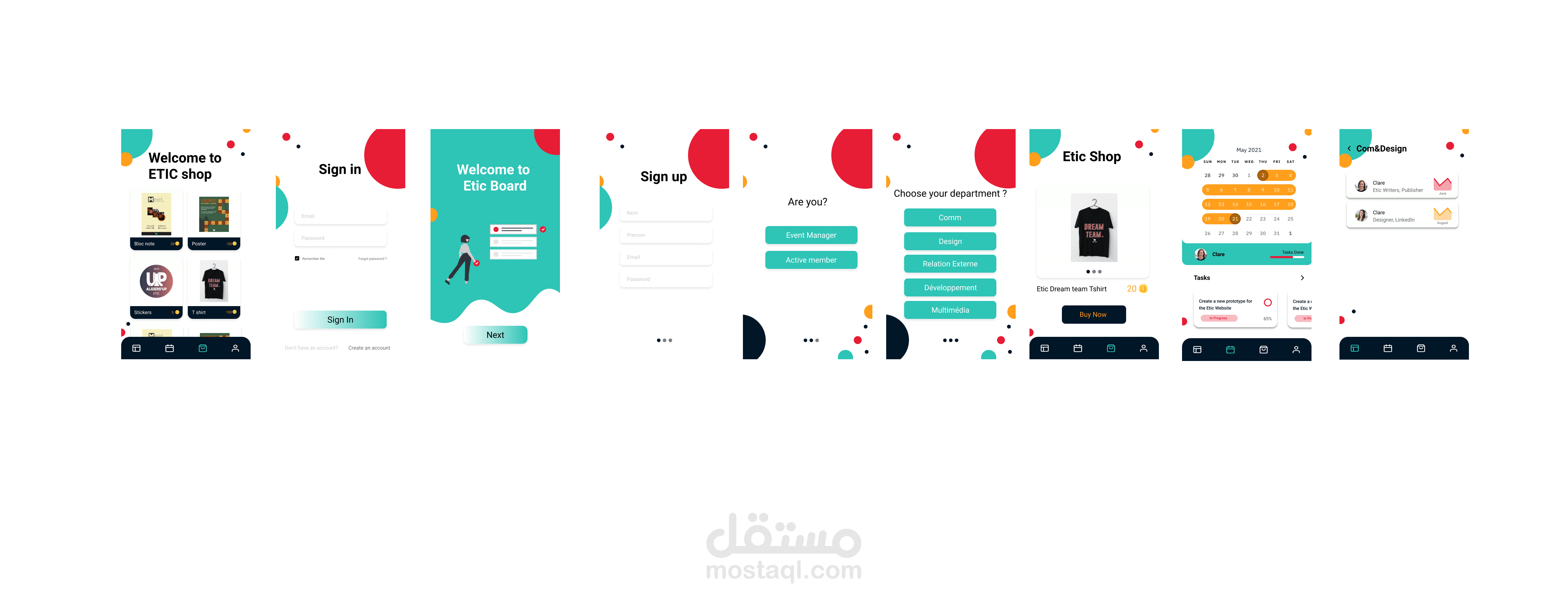 أنا قمت بتصميم تطبيق جوال لمنظمة داخلية، يحتوي التطبيق على صفحة تسجيل الدخول، وسوق للتسوق، وصفحة للتسجيل. هذا التطبيق مخصص لأعضاء النادي ETIC الداخلي.