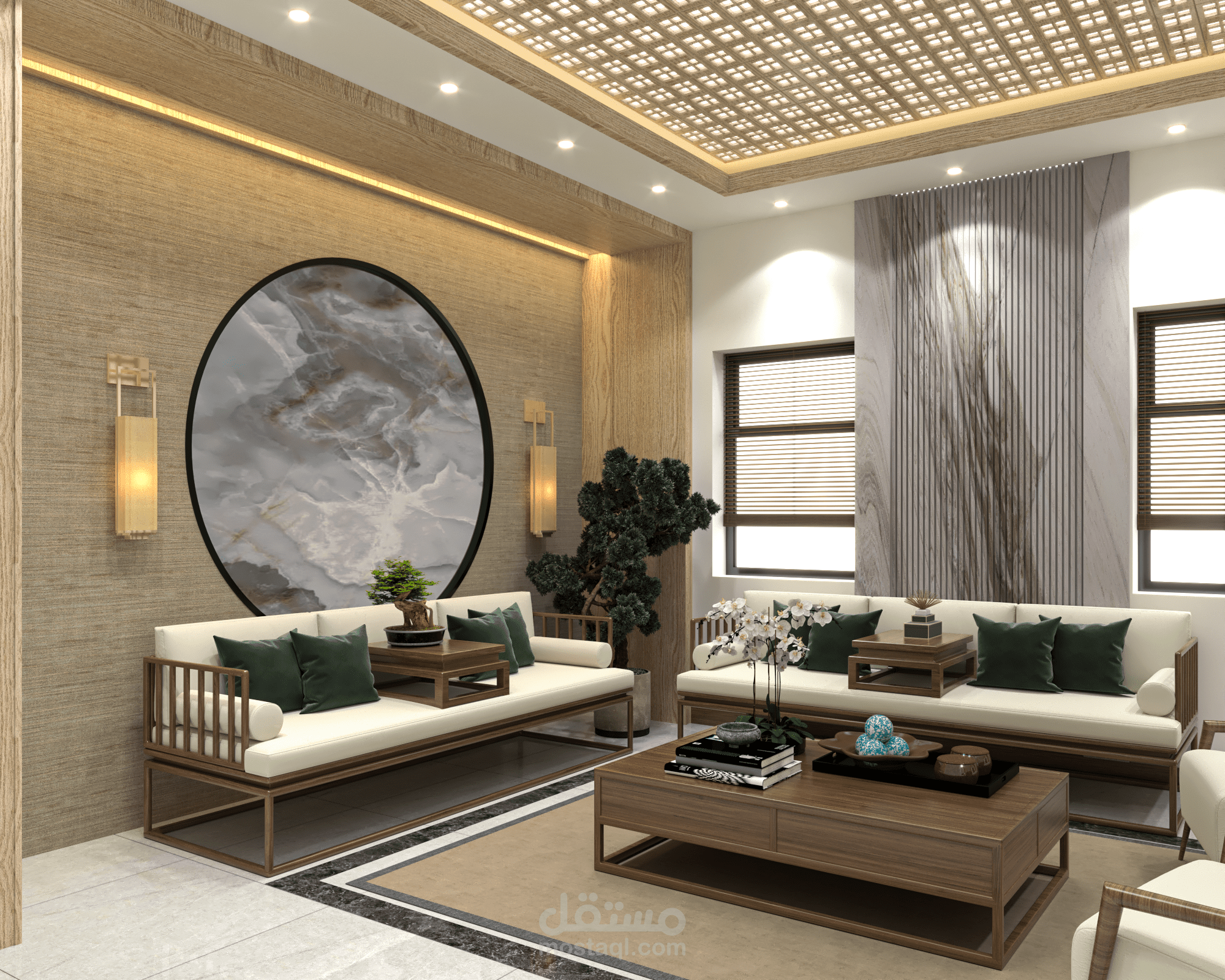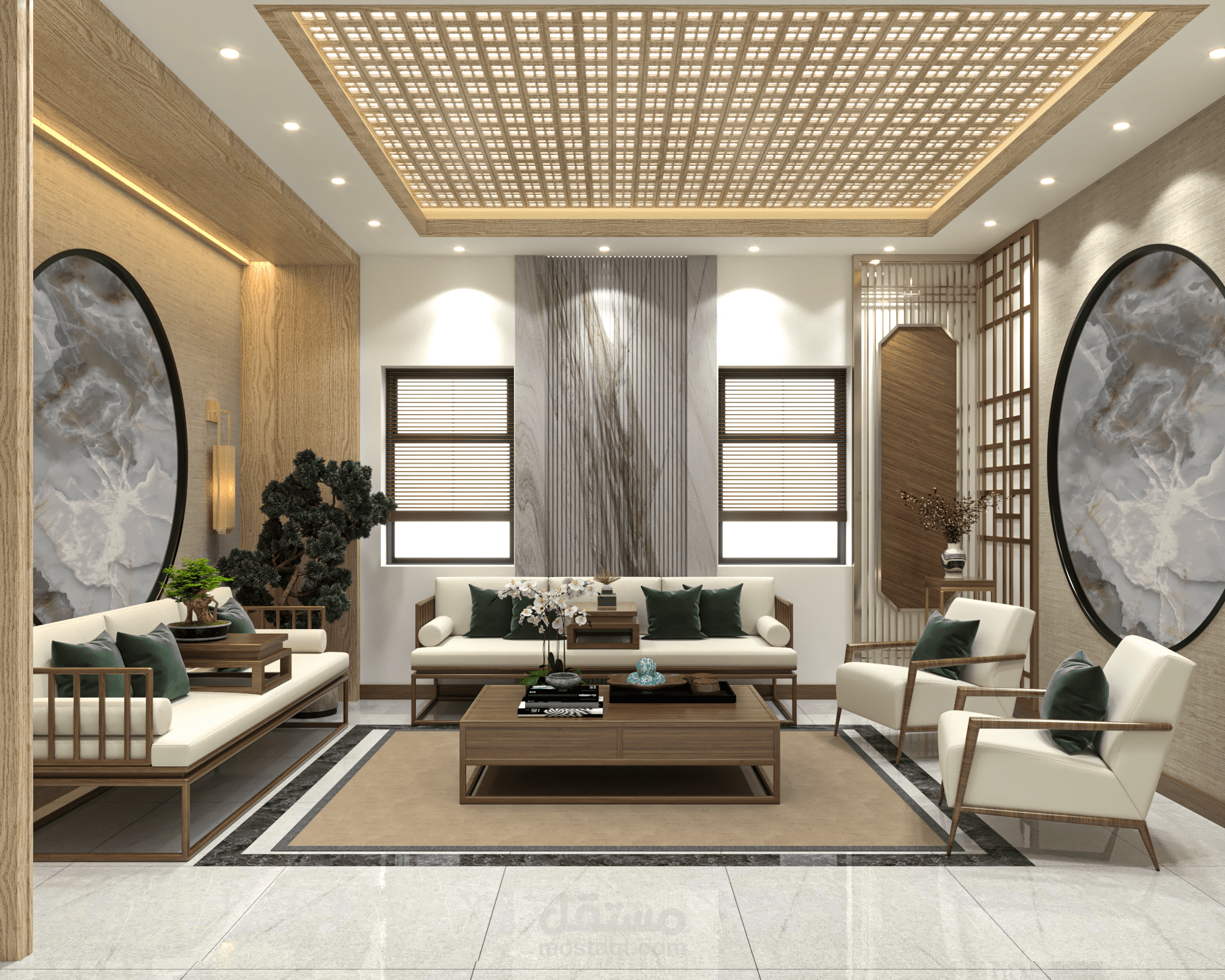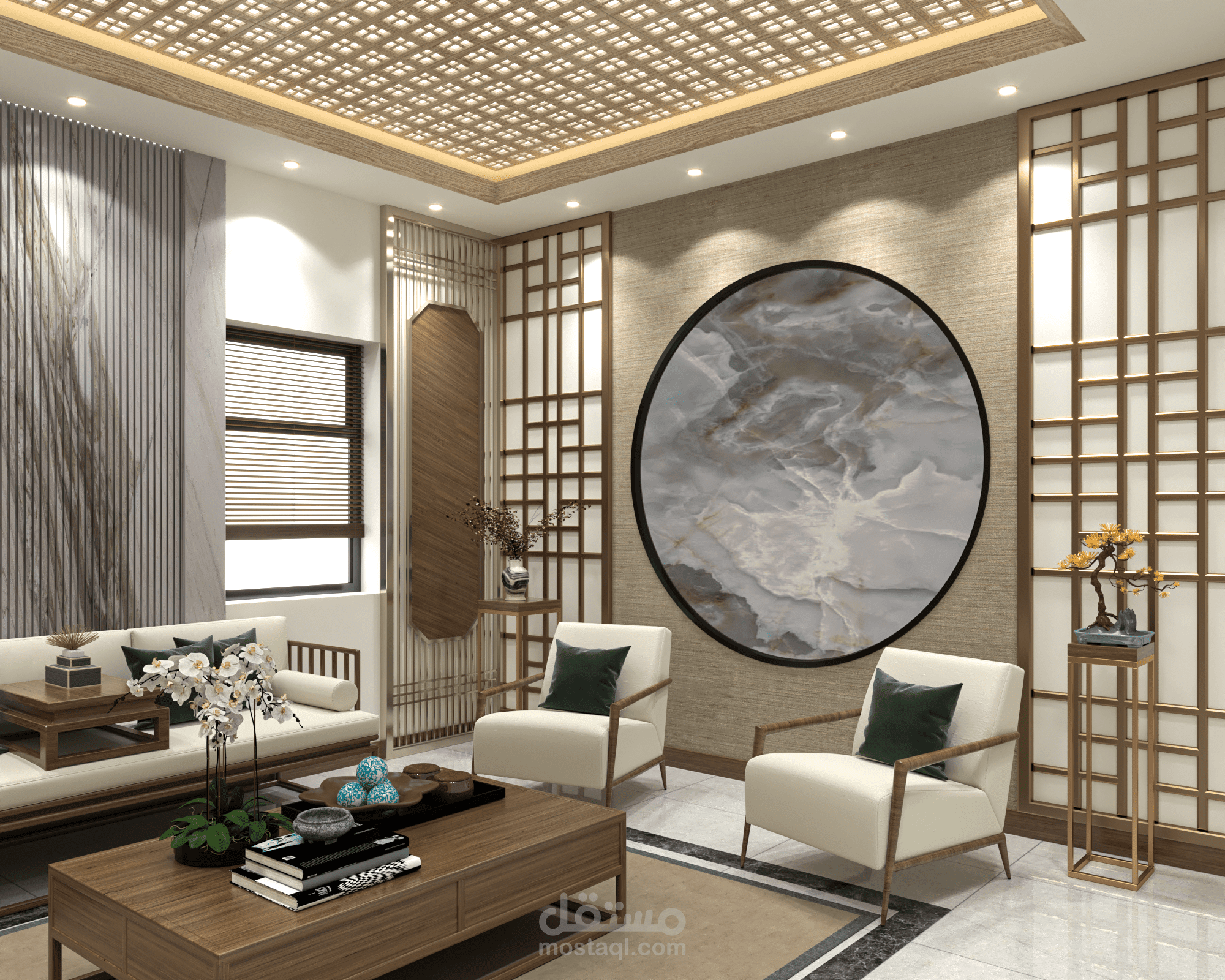 تصميم غرفة جلوس على الطراز الياباني في مدينة دبي في الامارات العربية المتحدة.