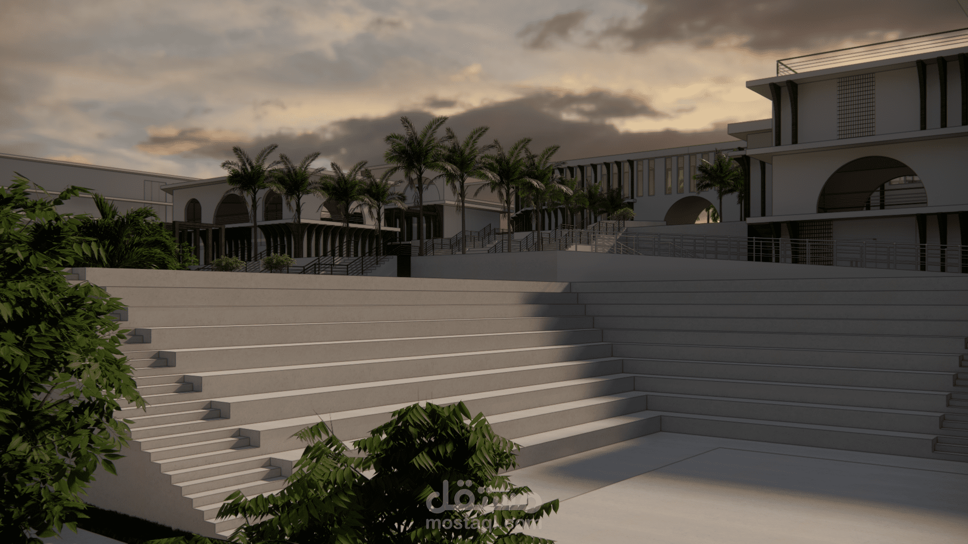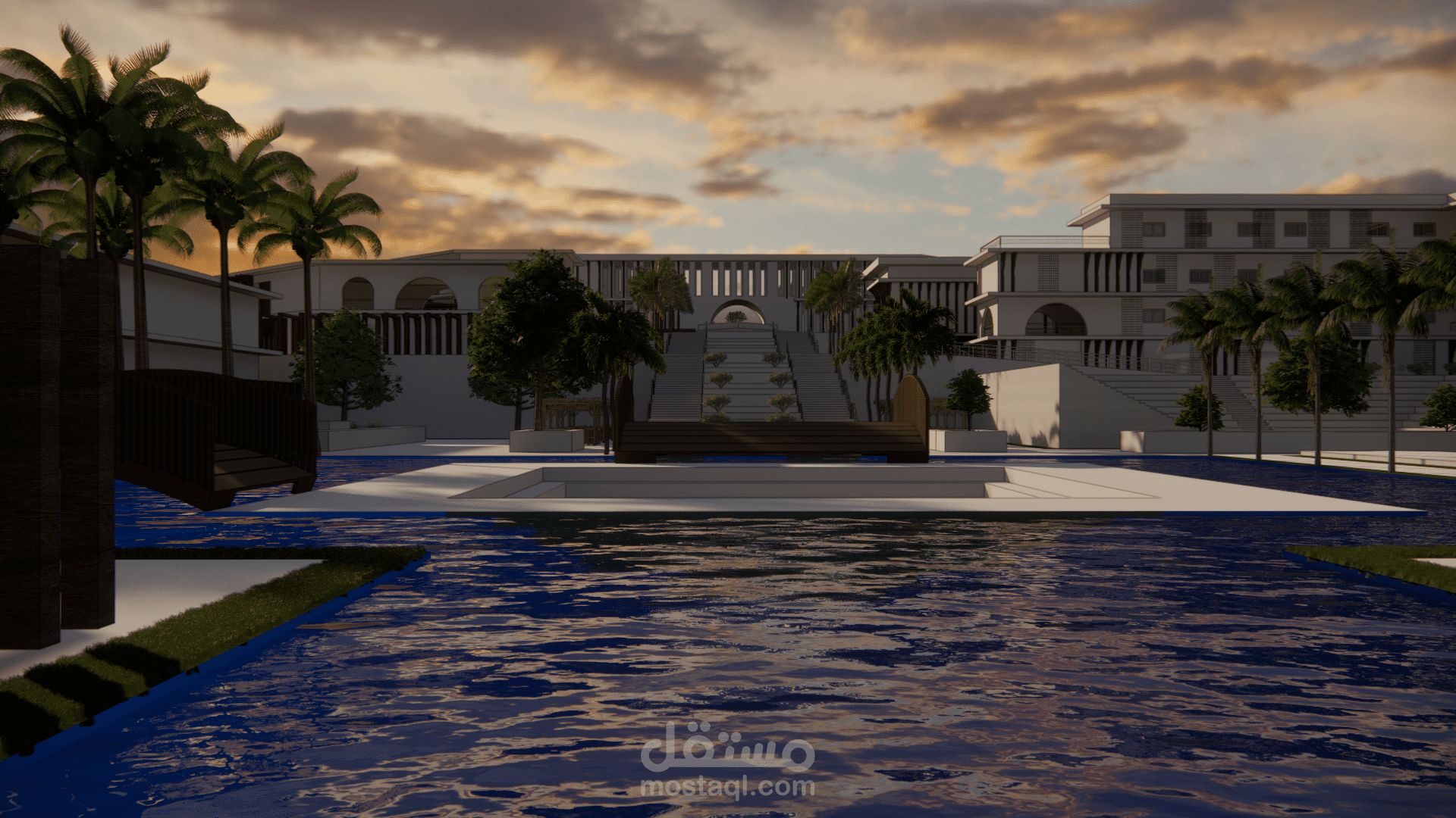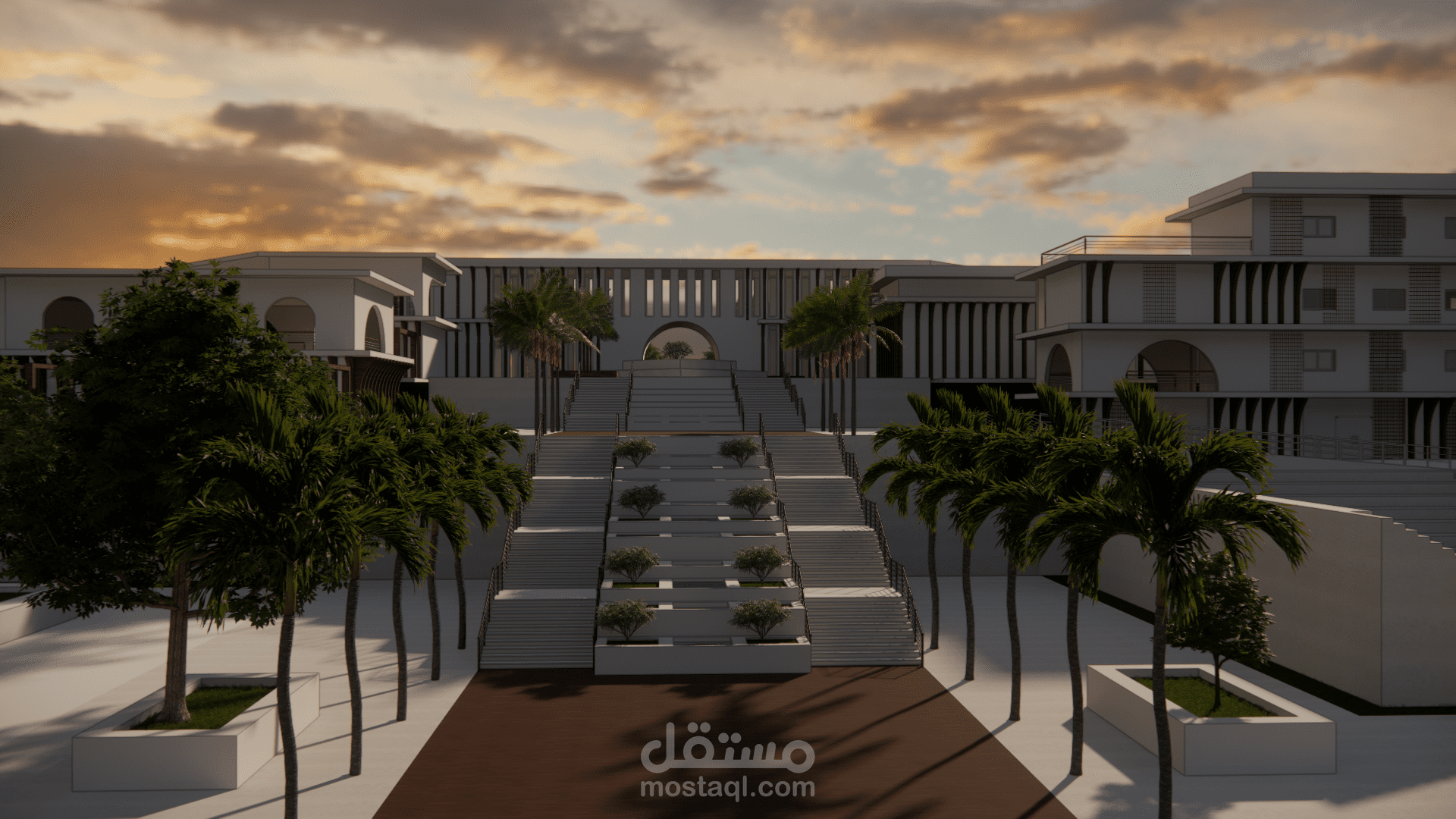 تم الأهتمام بالبداية بمرحلة التخطيط قبل التصميم و تصميم الممرات الرئيسية بالمشروع ثم البدء فى تصميم المبانى المعمارية .
