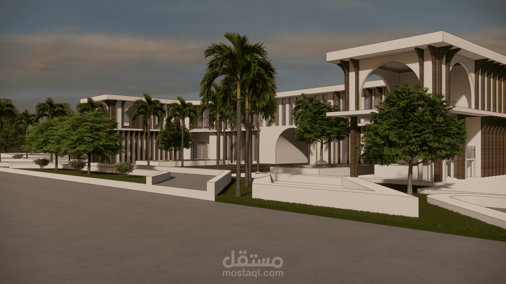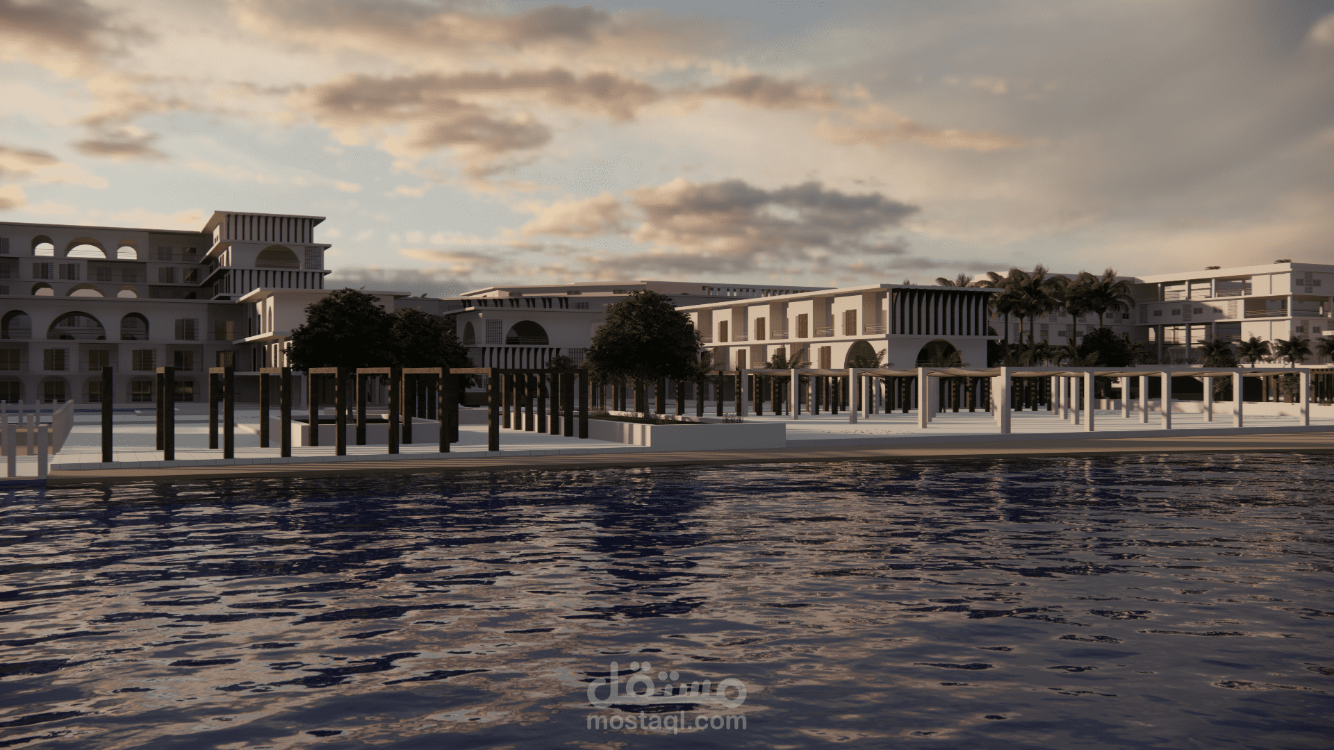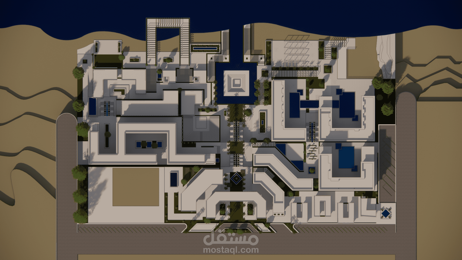 تم الأهتمام بالبداية بمرحلة التخطيط قبل التصميم و تصميم الممرات الرئيسية بالمشروع ثم البدء فى تصميم المبانى المعمارية .