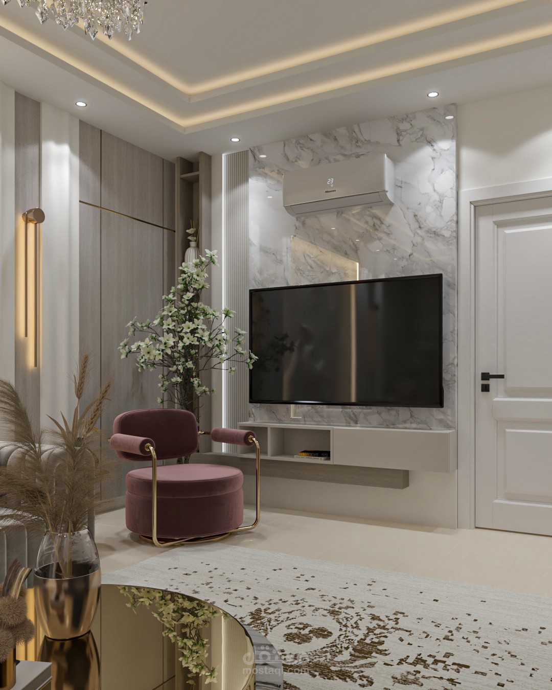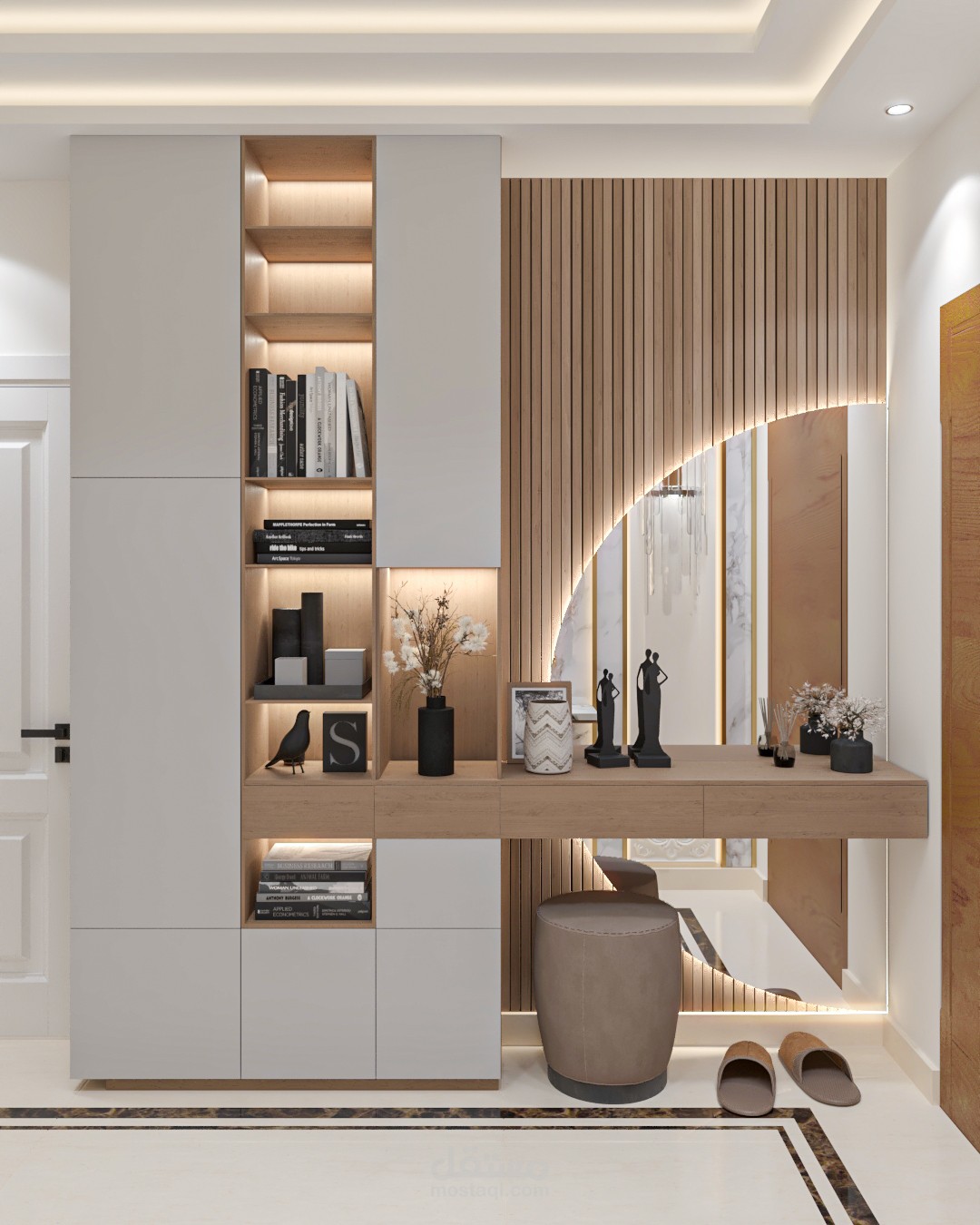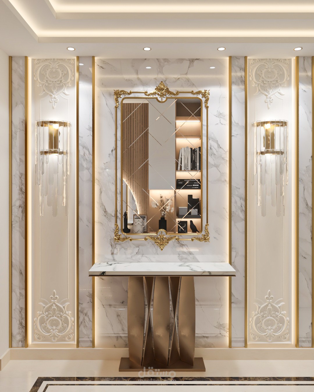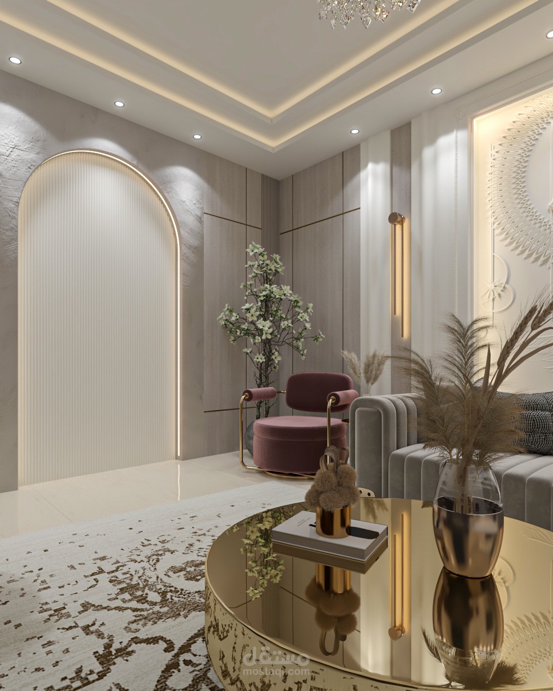 تصميم لمدخل شقة مع غرفة الجلوس.