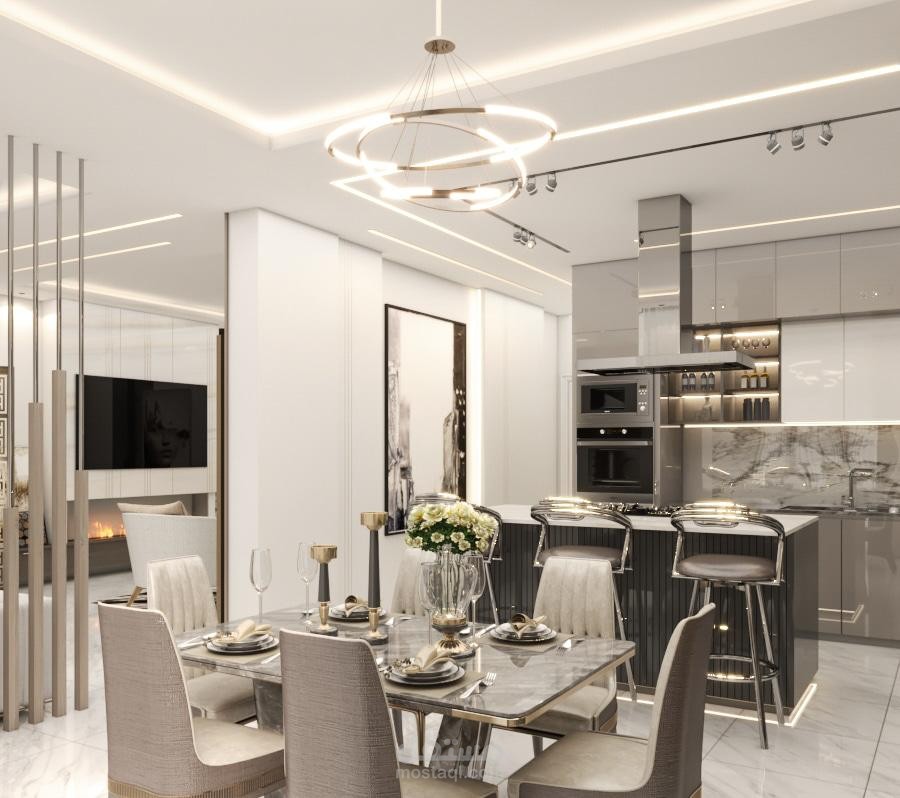 تصميم عصري لغرفة طعام مفتوحة على المطبخ في سوريا.